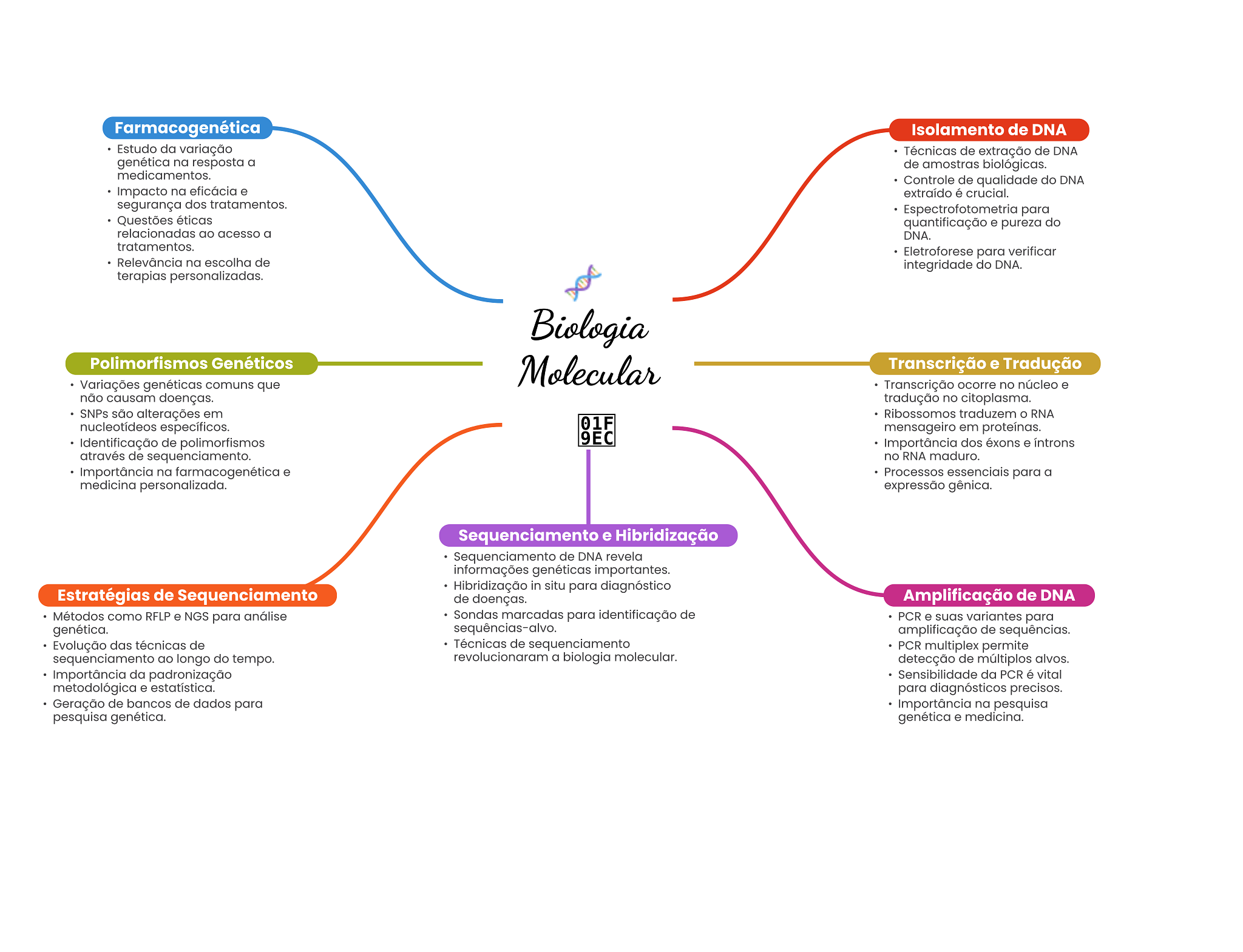 Farmacogenética Isolamento de DNA Estudo da variação Técnicas de extração de DNA genética na resposta a de amostras biológicas. medicamentos. Controle de qualidade do DNA Impacto na eficácia e extraído é crucial. segurança dos tratamentos. Espectrofotometria para Questões éticas quantificação e pureza do relacionadas ao acesso a DNA. tratamentos. Eletroforese para verificar Relevância na escolha de integridade do DNA. terapias personalizadas. Biologia Polimorfismos Genéticos Molecular Transcrição e Tradução Variações genéticas comuns que Transcrição ocorre no núcleo e não causam doenças. tradução no citoplasma. SNPs são alterações em Ribossomos traduzem O RNA nucleotídeos específicos. 01F mensageiro em proteínas. Identificação de polimorfismos 9EC Importância dos éxons e introns através de sequenciamento. no RNA maduro. Importância na farmacogenética e Processos essenciais para a medicina personalizada. expressão gênica. Sequenciamento e Hibridização Sequenciamento de DNA revela informações genéticas importantes. Hibridização in situ para diagnóstico Estratégias de Sequenciamento de doenças. Amplificação de DNA Métodos como RFLP e NGS para análise Sondas marcadas para identificação de PCR e suas variantes para genética. sequências-alvo. amplificação de sequências. Evolução das técnicas de Técnicas de sequenciamento PCR multiplex permite sequenciamento ao longo do tempo. revolucionaram a biologia molecular. detecção de múltiplos alvos. Importância da padronização Sensibilidade da PCR é vital metodológica e estatística. para diagnósticos precisos. Geração de bancos de dados para Importância na pesquisa pesquisa genética. genética e medicina.