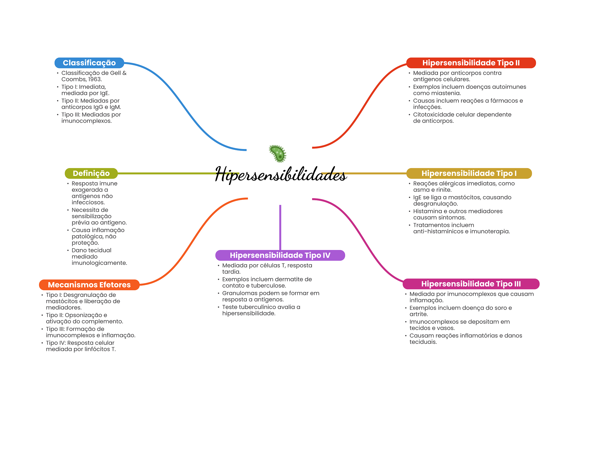 Classificação Hipersensibilidade Tipo II Classificação de Gell & Mediada por anticorpos contra Coombs, 1963. antígenos celulares. Tipo I: Imediata, Exemplos incluem doenças autoimunes mediada por IgE. como miastenia. Tipo II: Mediadas por Causas incluem reações a fármacos e anticorpos IgG e IgM. infecções. Tipo III: Mediadas por Citotoxicidade celular dependente imunocomplexos. de anticorpos. Definição Hipersensibilidades Hipersensibilidade Tipo I Resposta imune Reações alérgicas imediatas, como exagerada a asma e rinite. antígenos não IgE se liga a mastócitos, causando infecciosos. desgranulação. Necessita de Histamina e outros mediadores sensibilização causam sintomas. prévia ao antígeno. Tratamentos incluem Causa inflamação anti-histamínicos e imunoterapia. patológica, não proteção. Dano tecidual mediado Hipersensibilidade Tipo IV imunologicamente. Mediada por células T, resposta tardia. Exemplos incluem dermatite de Mecanismos Efetores contato e tuberculose. Hipersensibilidade Tipo III Tipo I: Desgranulação de Granulomas podem se formar em Mediada por imunocomplexos que causam mastócitos e liberação de resposta a antígenos. inflamação. mediadores. Teste tuberculínico avalia a Exemplos incluem doença do soro e Tipo II: Opsonização e hipersensibilidade. artrite. ativação do complemento. Imunocomplexos se depositam em Tipo III: Formação de tecidos e vasos. imunocomplexos e inflamação. Causam reações inflamatórias e danos Tipo IV: Resposta celular teciduais. mediada por linfócitos T.