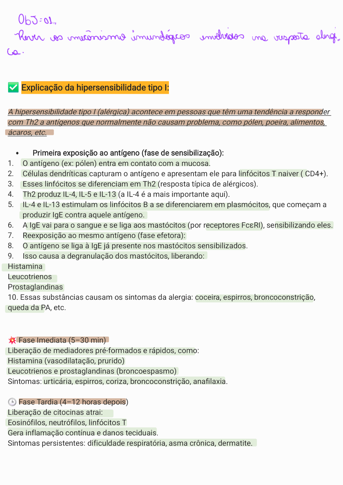 Rever as Explicação da hipersensibilidade tipo I: A hipersensibilidade tipo / (alérgica) acontece em pessoas que têm uma tendência a responder com Th2 antígenos que normalmente não causam problema, como pólen, poeira, alimentos, ácaros, etc. Primeira exposição ao antígeno (fase de sensibilização): 1. antígeno (ex: pólen) entra em contato com a mucosa. 2. Células dendríticas capturam antígeno e apresentam ele para linfócitos T naiver 3. Esses linfócitos se diferenciam em Th2 (resposta típica de alérgicos). 4. Th2 produz IL-4, IL-5 e IL-13 (a IL-4 é a mais importante aqui). 5. IL-4 e IL-13 estimulam os linfócitos B a se diferenciarem em plasmócitos, que começam a produzir IgE contra aquele antígeno. 6. A IgE vai para sangue e se liga aos mastócitos (por receptores sensibilizando eles. 7. Reexposição ao mesmo antígeno (fase efetora): 8. antígeno se liga à IgE já presente nos mastócitos sensibilizados. 9. Isso causa a degranulação dos mastócitos, liberando: Histamina Leucotrienos Prostaglandinas 10. Essas substâncias causam os sintomas da alergia: coceira, espirros, broncoconstrição, queda da etc. Fase Imediata (5-30 min) Liberação de mediadores pré-formados e rápidos, como: Histamina (vasodilatação, prurido) Leucotrienos e prostaglandinas (broncoespasmo) Sintomas: urticária, espirros, coriza, broncoconstrição, anafilaxia. Fase Tardia (4-12 horas depois) Liberação de citocinas atrai: Eosinófilos, neutrófilos, linfócitos T Gera inflamação contínua e danos teciduais. Sintomas persistentes: dificuldade respiratória, asma crônica, dermatite.Obj-02: Estudar epidemiologia,etiologia, fisiopatologia, manifestações clínicas, diagnóstico, complicações da alergia. 1. Epidemiologia Alergia alimentar: Predomina nos primeiros anos de vida. A alergia à proteína do leite de vaca (APLV) é a mais comum na infância. Aumento nos últimos anos associada à introdução precoce de alimentos industrializados e redução do aleitamento materno. É mais comum em crianças atópicas, mas pode ocorrer sem atopia. Intolerância alimentar: Muito comum na população geral, principalmente em adultos e adolescentes. Intolerância à lactose é a mais frequente. Incidência maior em populações asiáticas; rara em caucasianos do oeste europeu Etiologia As alergias alimentares são desencadeadas por uma resposta imune inadequada contra proteínas presentes em alimentos, que normalmente seriam toleradas pelo organismo. Essa resposta pode ocorrer de três formas: IgE-mediada: é a forma clássica e envolve a produção de IgE específica contra o alimento, levando à ativação de mastócitos e basófilos, com liberação de histamina e outros mediadores inflamatórios. Os sintomas aparecem de forma imediata, geralmente em minutos ou até 2 horas após a exposição. Não IgE-mediada: ocorre por mecanismos mediados por células T, como a enterocolite induzida por proteínas alimentares, e geralmente apresenta sintomas gastrointestinais tardios. Mista: envolve tanto IgE quanto mecanismos celulares, como na esofagite eosinofílica e na dermatite atópica associada a alimentos. Por outro lado, as intolerâncias alimentares não envolvem sistema imune. Elas ocorrem por deficiência enzimática (ex: lactase), reações a componentes naturais de alimentos (ex: tiramina em vinhos e queijos), ou má absorção de carboidratos (FODMAPs). A resposta depende da quantidade ingerida e da capacidade digestiva individualFisiopatologia Alergia IgE. Na alergia IgE-mediada, ocorre primeiro uma fase de sensibilização: antígeno (alimento) é captado por células apresentadoras de antígeno, como as células dendríticas, e apresentado aos linfócitos T CD4+. Esses linfócitos se diferenciam em células Th2, que liberam citocinas como IL-4, IL-5 e IL-13. Essas citocinas estimulam os linfócitos a produzirem IgE específica. IgE se liga aos mastócitos e basófilos, sensibilizando-os. Intolerância Alimentar Intolerância enzimática (ex: lactose) que acontece: O indivíduo possui deficiência da enzima digestiva necessária para quebrar certo nutriente. No caso da lactose, a enzima lactase (presente no intestino delgado) quebra a lactose em glicose e galactose, que são absorvidas. Quando lactase está ausente ou deficiente: A lactose não é digerida no intestino delgado. Ela seguir intacta para cólon, onde bactérias fermentam esse açúcar. A fermentação gera: Gases (hidrogênio, metano, CO2) distensão, flatulência, cólica. Ácidos acidificam conteúdo intestinal. Aumento da osmolaridade atrai água diarreia osmótica A intolerância aos dissacarídeos, como a lactose, ocorre quando há deficiência da enzima lactase, presente no borda em escova dos enterócitos do intestino delgado. A lactase é responsável por quebrar a lactose em glicose e galactose, que seriam absorvidas por transporte ativo. Quando a lactase está deficiente (por genética ou lesão da mucosa), a lactose permanece intacta na luz intestinal. A lactose aumenta a osmolaridade luminal, promovendo entrada de água diarreia osmótica. No cólon, a lactose é fermentada pelas bactérias produz gases (H2, CO2, metano) distensão, dor e flatulência. Essa fermentação também gera ácidos graxos de cadeia curta, que irritam a mucosa pioram a diarreia e causam desconfortoFisiopatologia da intolerância aos FODMAPs. Esses carboidratos são mal absorvidos no intestino delgado. Como não são digeridos, passam intactos para cólon. No cólon, eles são fermentados por bactérias, produzindo: Gases CH₄, distensão, cólica, flatulência. Ácidos e aumento de osmolaridade puxam água diarreia. Esse processo causa os sintomas clássicos: Distensão abdominal Gases Diarreia aquosa Cólica abdominal Intolerância secundária (transitória) A intolerância carboidratos também pode ser secundária à lesão da mucosa intestinal, como em: Gastroenterites virais (rotavírus, norovírus) Enteropatias inflamat