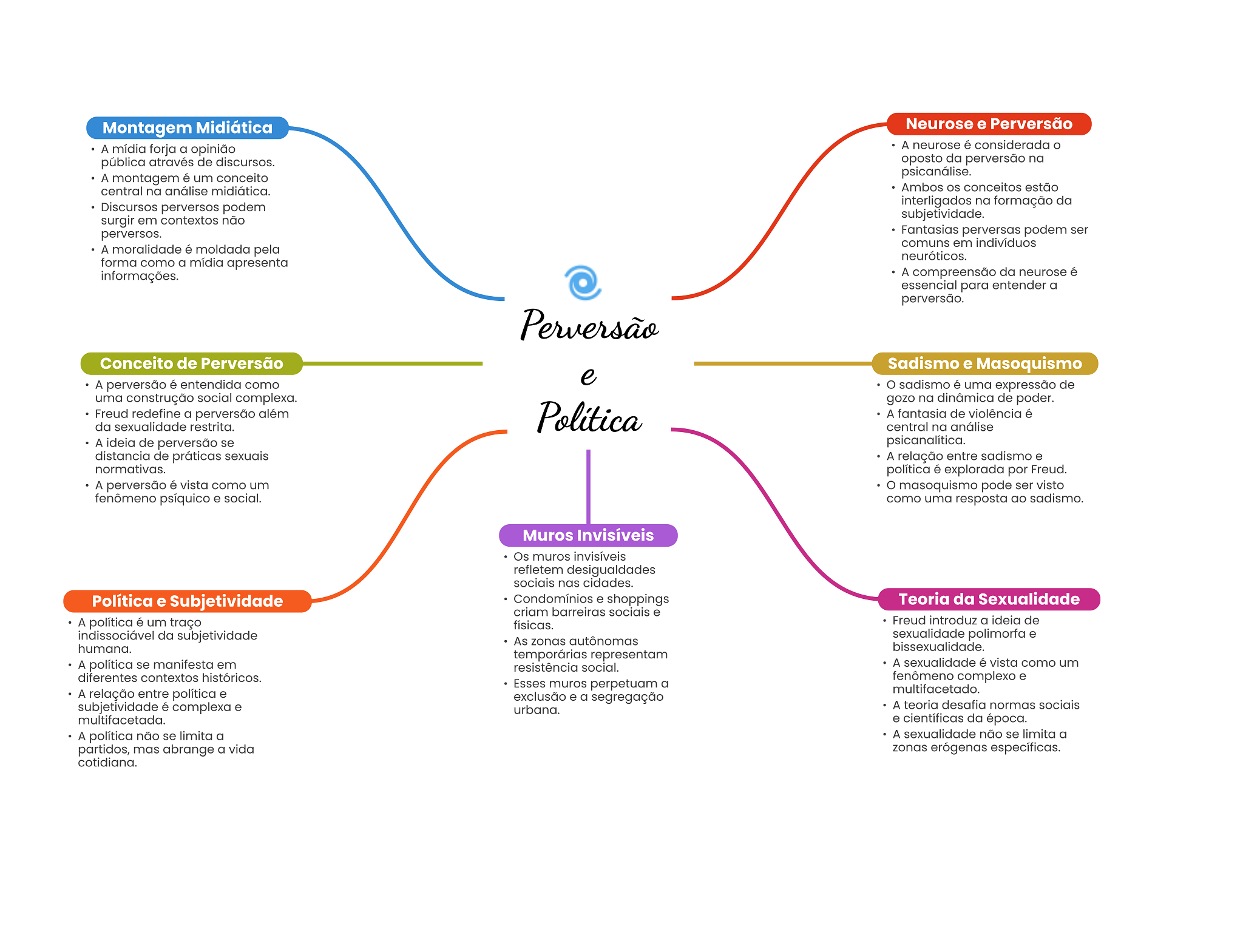 Montagem Midiática Neurose e Perversão A mídia forja a opinião A neurose é considerada o pública através de discursos. oposto da perversão na A montagem é um conceito psicanálise. central na análise midiática. Ambos conceitos estão Discursos perversos podem interligados na formação da surgir em contextos não subjetividade. perversos. Fantasias perversas podem ser comuns em indivíduos A moralidade é moldada pela neuróticos. forma como a mídia apresenta informações. A compreensão da neurose é essencial para entender a perversão. Perversão Conceito de Perversão Sadismo e Masoquismo A perversão é entendida como e O sadismo é uma expressão de uma construção social complexa. gozo na dinâmica de poder. Freud redefine a perversão além da sexualidade restrita. Política A fantasia de violência é central na análise A ideia de perversão se psicanalítica. distancia de práticas sexuais A relação entre sadismo e normativas. política é explorada por Freud. A perversão é vista como um masoquismo pode ser visto fenômeno psíquico e social. como uma resposta ao sadismo. Muros Invisíveis Os muros invisíveis refletem desigualdades sociais nas cidades. Política e Subjetividade Condomínios e shoppings Teoria da Sexualidade criam barreiras sociais e A política é um traço físicas. Freud introduz a ideia de indissociável da subjetividade sexualidade polimorfa e As zonas autônomas humana. bissexualidade. temporárias representam A política se manifesta em resistência social. A sexualidade é vista como um diferentes contextos históricos. fenômeno complexo e Esses muros perpetuam a A relação entre política e multifacetado. exclusão e a segregação subjetividade é complexa e urbana. A teoria desafia normas sociais multifacetada. e científicas da época. A política não se limita a A sexualidade não se limita a partidos, mas abrange a vida zonas erógenas específicas. cotidiana.