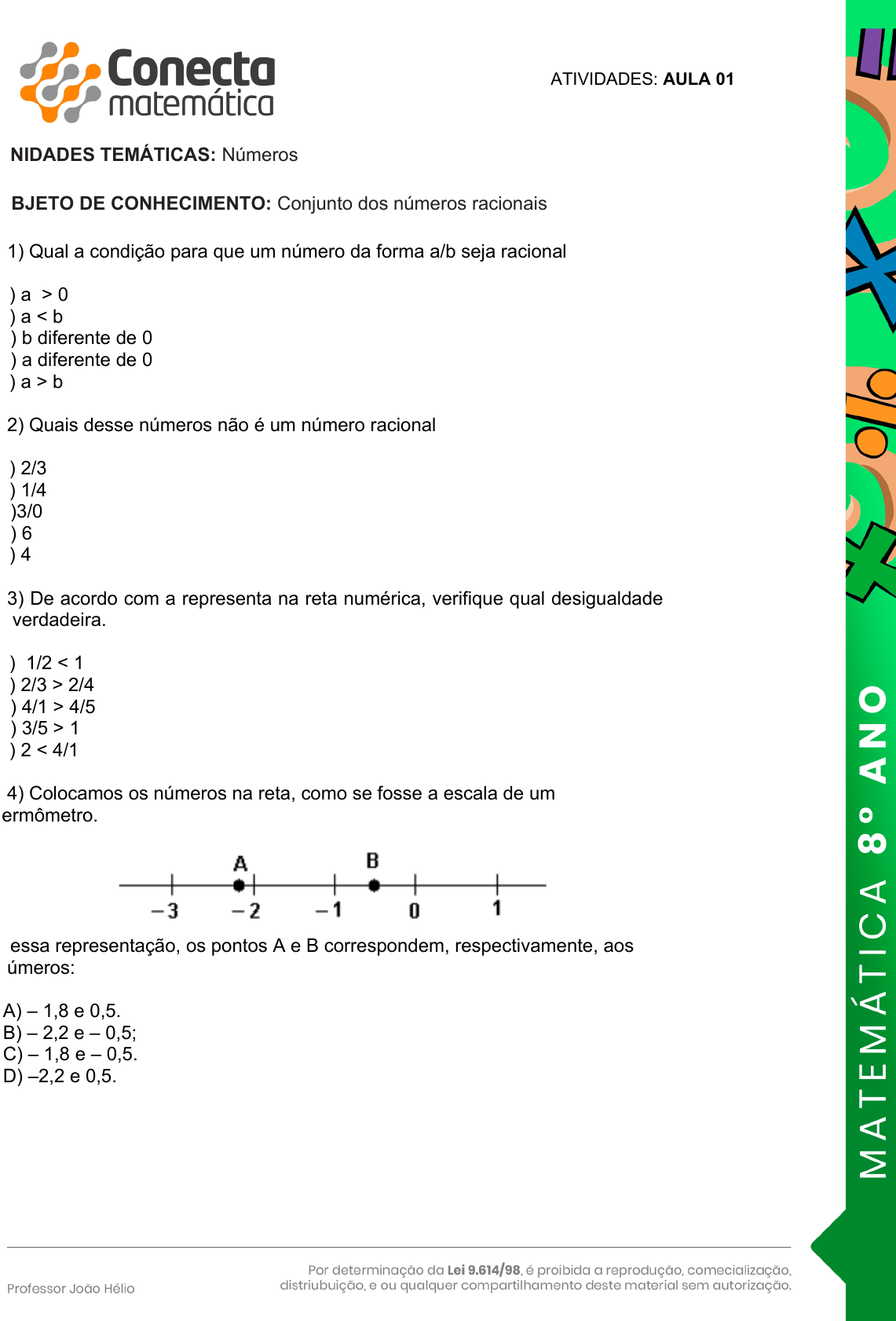 ATIVIDADES: AULA 01 UNIDADES TEMÁTICAS: Números OBJETO DE CONHECIMENTO: Conjunto dos números racionais 01) Qual a condição para que um número da forma a/b seja racional A) a > 0 B) a b 02) Quais desse números não é um número racional A) 2/3 B) 1/4 C)3/0 D) 6 E) 4 03) De acordo com a representa na reta numérica, verifique qual desigualdade é verdadeira. A) 1/2 2/4 C) 4/1 > 4/5 D) 3/5 > 1 E) 2