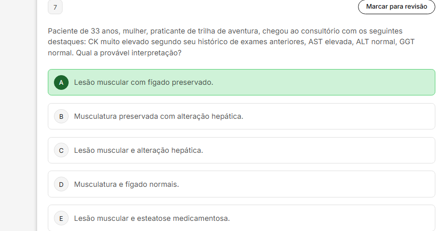 7 Marcar para revisão Paciente de 33 anos, mulher, praticante de trilha de aventura, chegou ao consultório com seguintes destaques: CK muito elevado segundo seu histórico de exames anteriores, AST elevada, ALT normal, GGT normal. Qual a provável interpretação? A Lesão muscular com fígado preservado. B Musculatura preservada com alteração hepática. C Lesão muscular e alteração hepática. D Musculatura e normais. E Lesão muscular e esteatose medicamentosa.