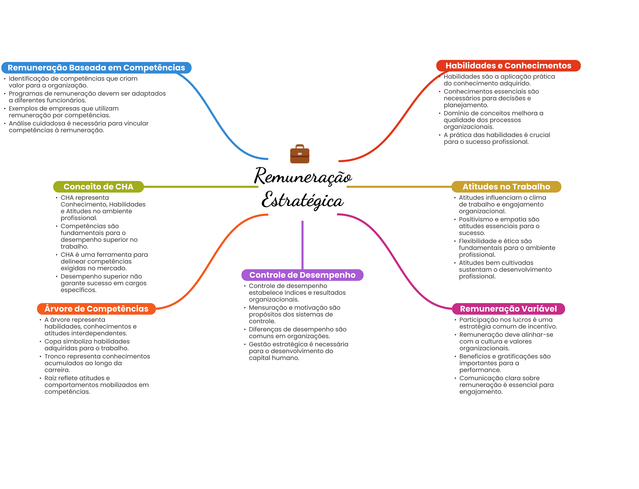 Remuneração Baseada em Competências Habilidades e Conhecimentos Identificação de competências que criam Habilidades são a aplicação prática valor para a organização. do conhecimento adquirido. Programas de remuneração devem ser adaptados Conhecimentos essenciais são a diferentes funcionários. necessários para decisões e Exemplos de empresas que utilizam planejamento. remuneração por competências. Domínio de conceitos melhora a Análise cuidadosa é necessária para vincular qualidade dos processos competências à remuneração. organizacionais. A prática das habilidades é crucial para sucesso profissional. Remuneração Conceito de CHA Atitudes no Trabalho CHA representa Estratégica Atitudes influenciam clima Conhecimento, Habilidades de trabalho e engajamento e Atitudes no ambiente organizacional. profissional. Positivismo e empatia são Competências são atitudes essenciais para fundamentais para sucesso. desempenho superior no Flexibilidade e ética são trabalho. fundamentais para O ambiente CHA é uma ferramenta para profissional. delinear competências Atitudes bem cultivadas exigidas no mercado. sustentam O Desempenho superior não Controle de Desempenho profissional. garante sucesso em cargos Controle de desempenho específicos. estabelece e resultados organizacionais. Árvore de Competências Mensuração e motivação são Remuneração Variável propósitos dos sistemas de A árvore representa controle. Participação nos lucros é uma habilidades, conhecimentos e Diferenças de desempenho são estratégia comum de incentivo. atitudes interdependentes. comuns em organizações. Remuneração deve alinhar-se Copa simboliza habilidades com a cultura e valores Gestão estratégica é necessária adquiridas para trabalho. para desenvolvimento do organizacionais. Tronco representa conhecimentos capital humano. Benefícios e gratificações são acumulados ao longo da importantes para a carreira. performance. Raiz reflete atitudes e Comunicação clara sobre comportamentos mobilizados em remuneração é essencial para competências. engajamento.