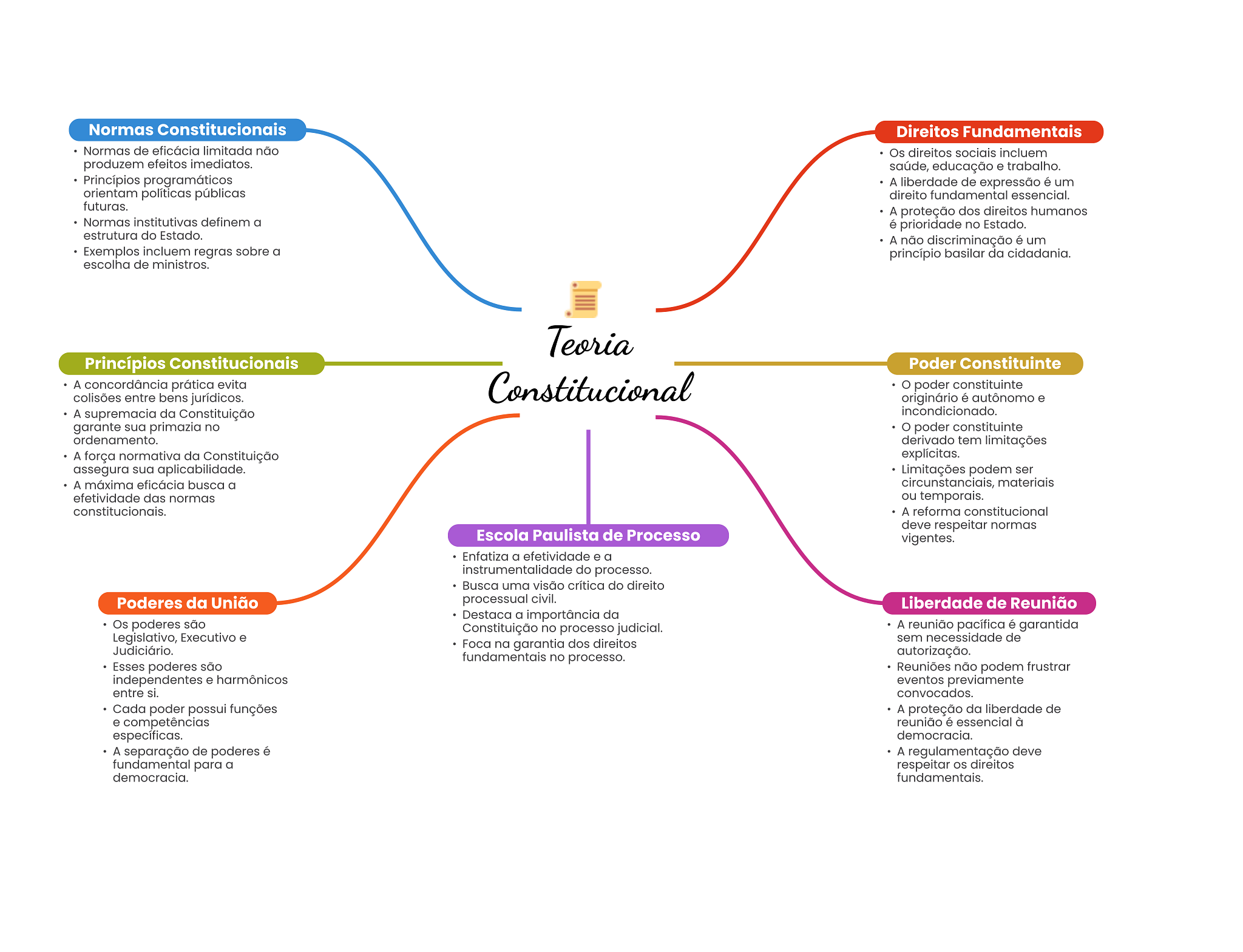Normas Constitucionais Direitos Fundamentais Normas de eficácia limitada não Os direitos sociais incluem produzem efeitos imediatos. saúde, educação e trabalho. Princípios programáticos A liberdade de expressão é um orientam políticas públicas direito fundamental essencial. futuras. A proteção dos direitos humanos Normas institutivas definem a é prioridade no Estado. estrutura do Estado. A não discriminação é um Exemplos incluem regras sobre a princípio basilar da cidadania. escolha de ministros. Teoria Princípios Constitucionais Poder Constituinte A concordância prática evita colisões entre bens jurídicos. Constitucional O poder constituinte originário é autônomo e A supremacia da Constituição incondicionado. garante sua primazia no poder constituinte ordenamento. derivado tem limitações A força normativa da Constituição explícitas. assegura sua aplicabilidade. Limitações podem ser A máxima eficácia busca a circunstanciais, materiais efetividade das normas ou temporais. constitucionais. A reforma constitucional deve respeitar normas Escola Paulista de Processo vigentes. instrumentalidade do processo. Busca uma visão crítica do direito Poderes da União processual civil. Liberdade de Reunião Destaca a importância da Os poderes são Constituição no processo judicial. A reunião pacífica é garantida Legislativo, Executivo e sem necessidade de Judiciário. Foca na garantia dos direitos fundamentais no processo. autorização. Esses poderes são Reuniões não podem frustrar independentes e harmônicos eventos previamente entre si. convocados. Cada poder possui funções A proteção da liberdade de e competências reunião é essencial à específicas. democracia. A separação de poderes é A regulamentação deve fundamental para a respeitar direitos democracia. fundamentais.
