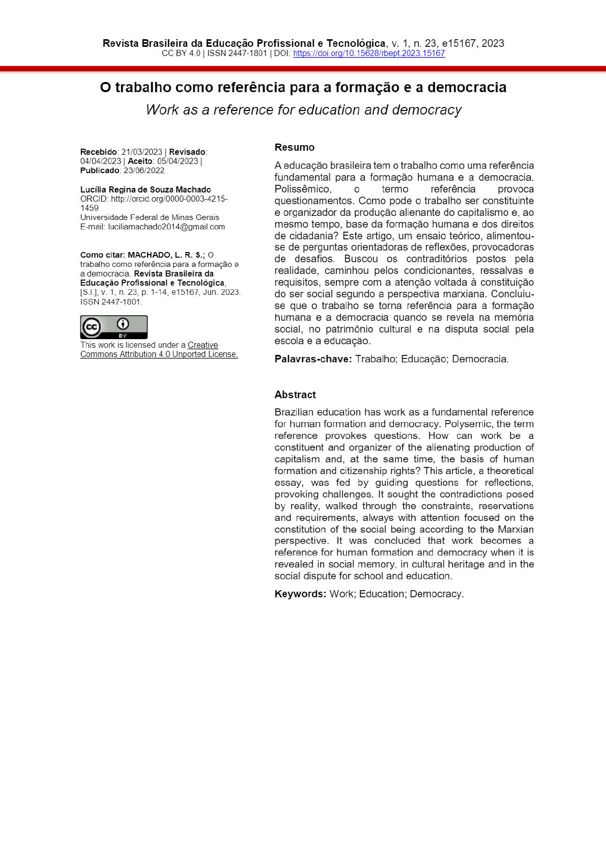 Revista Brasileira da Educação Profissional e Tecnológica, V. 1, n. 23, e15167, 2023 CC BY 4.0 ISSN 2447-1801 DOI: trabalho como referência para a formação e a democracia Work as a reference for education and democracy Resumo 21/03/2023 Revisado: 04/04/2023 Aceito: 05/04/2023 23/06/2022 A educação brasileira tem o trabalho como uma referência fundamental para a formação humana e a democracia. Lucília Regina de Souza Machado Polissêmico, o termo referência provoca ORCID: questionamentos. Como pode o trabalho ser constituinte 1459 Universidade Federal de Minas Gerais e organizador da produção alienante do capitalismo e, ao E-mail: luciliamachado2014@gmail.com mesmo tempo, base da formação humana e dos direitos de cidadania? Este artigo, um ensaio teórico, alimentou- se de perguntas orientadoras de reflexões, provocadoras Como citar: MACHADO, L. R. S.; de desafios. Buscou contraditórios postos pela trabalho como referência para a formação e a democracia. Revista Brasileira da realidade, caminhou pelos condicionantes, ressalvas e Educação Profissional e Tecnológica, requisitos, sempre com a atenção voltada à constituição [S.I.], V. 1, n. 23, p. 1-14, e15167, Jun. 2023. do ser social segundo a perspectiva marxiana. Concluiu- ISSN 2447-1801. se que trabalho se torna referência para a formação humana e a democracia quando se revela na memória social, no patrimônio cultural e na disputa social pela BY This work is licensed under a Creative escola e a educação. Commons Attribution 4.0 Unported Palavras-chave: Trabalho; Educação; Democracia. Abstract Brazilian education has work as a fundamental reference for human formation and democracy. Polysemic, the term reference provokes questions. How can work be a constituent and organizer of the alienating production of capitalism and, at the same time, the basis of human formation and citizenship rights? This article, a theoretical essay, was fed by guiding questions for reflections, provoking challenges. It sought the contradictions posed by reality, walked through the constraints, reservations and requirements, always with attention focused on the constitution of the social being according to the Marxian perspective. It was concluded that work becomes a reference for human formation and democracy when it is revealed in social memory, in cultural heritage and in the social dispute for school and education. Keywords: Work; Education; Democracy.Revista Brasileira da Educação Profissional e Tecnológica, V. 1, n. 23, e15167, 2023, 2 de 14 CC BY 4.0 ISSN 2447-1801 DOI: 1 INTRODUÇÃO O termo referência, integrante do título deste texto, na sua polissemia, pode indicar apenas insinuação ou sugestão para que se leve em conta trabalho quando se pensam e se discutem propostas para a formação humana e a democracia. Mas pode ser tomado como critério para a definição da orientação ou do modelo a serem seguidos nos processos educativos ou de gestão política. Em todos esses casos, porém, a discussão sobre trabalho como referência para a formação e a democracia não é fácil, trivial nem muito menos tangível. Lembra Lukács (1979, 52) que: Um mérito histórico da teoria de Marx é 0 de ter trazido à tona a prioridade da praxis, sua função de guia e de controle em relação à consciência. Marx, porém, não se contentou em esclarecer essa conexão fundamental de modo geral, mas mostrou 0 método para determinar caminho através do qual essa relação adequada entre teoria e praxis, mesmo a mais imediata e a mais cotidiana, contém em si essa referência ao ato de julgar, à consciência etc., visto que é sempre um ato teleológico, no qual a posição da finalidade precede, objetiva e cronologicamente, a realização. Isso não quer dizer, porém, que seja sempre possível saber quais serão as consequências sociais de cada ação singular, sobretudo quando ela é causa parcial de uma modificação do ser social em sua totalidade (ou totalidade parcial). agir social, agir econômico dos homens abre livre curso para forças, tendências, objetividades, estruturas etc., que nascem decerto exclusivamente da praxis humana, mas cujo caráter resta no todo ou em grande parte incompreensível para quem produz. Enfrentando esse desafio, Saviani (1988) propôs pensar sistema de ensino à base do fenômeno do trabalho, considerando estar a sociedade assentada sobre pilar do modo de organização do processo de produção da existência humana. Para ele, todo sistema educacional se estruturaria a partir daí. Nesse sentido, se respalda na compreensão de Gramsci sobre princípio educativo imanente à escola elementar, ou seja, "[...] conceito e fato do trabalho (da realidade (GRAMSCI, 1968, p. 130) Nesse texto de 1988, Saviani esclarece caráter da imanência desse princípio em virtude de ele ser inerente, subjacente e estar contido na finalidade da escola elementar. Assim, diz que nesse nível de ensino, "[...] trabalho age como determinante do conteúdo curricular em termos implícitos" (SAVIANI, 1988, p.85). Entretanto, à escola de segundo grau, diz Saviani (1988, 85), "[...] coloca- se a necessidade de que a relação entre ensino e trabalho se explicite". Ou seja, "A referida explicitação deverá envolver o domínio, não apenas teórico, mas também prático, sobre 0 modo como o saber se articula com processo produtivo" (SAVIANI, 1988, 96), mas não para "[...] a formação de técnicos especializados, mas de politécnicos." (SAVIANI, 1988, 97).Revista Brasileira da Educação Profissional e Tecnológica, V. 1, n. 23, e15167, 2023, 3 de 14 CC BY 4.0 ISSN 2447-1801 DOI: https://doi.org/10.15628/rbept.2023.15167 Em 2006, no texto "Trabalho e educação: fundamentos ontológicos e históricos", apresentado à Reunião Anual da ANPEd, em Caxambu, e publicado no ano seguinte, Saviani reafirma enunciado acima e diz: Se no ensino fundamental a relação é implícita e indireta, no ensino médio a relaç