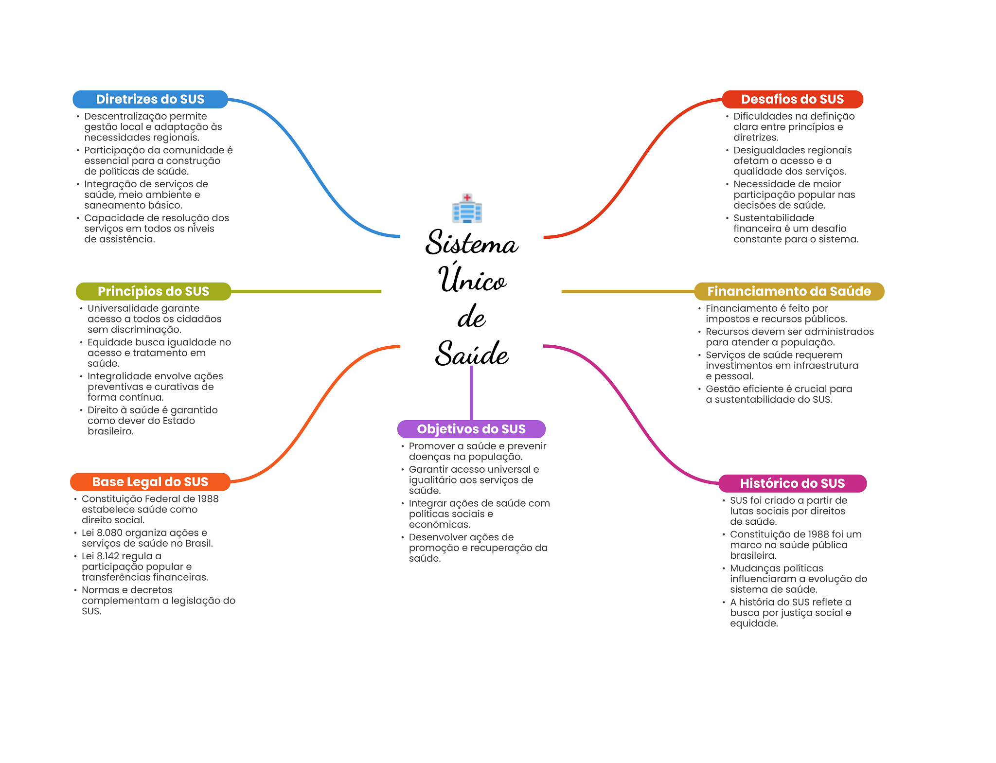 Diretrizes do SUS Desafios do SUS Descentralização permite Dificuldades na definição gestão local e adaptação às clara entre princípios e necessidades regionais. diretrizes. Participação da comunidade é Desigualdades regionais essencial para a construção afetam acesso e a de políticas de saúde. qualidade dos serviços. Integração de serviços de Necessidade de maior saúde, meio ambiente e participação popular nas saneamento básico. decisões de saúde. Capacidade de resolução dos Sustentabilidade serviços em todos níveis financeira é um desafio de assistência. Sistema constante para sistema. Único Princípios do SUS Financiamento da Saúde Universalidade garante acesso a todos OS cidadãos de Financiamento é feito por impostos e recursos públicos. sem discriminação. Recursos devem ser administrados Equidade busca igualdade no acesso e tratamento em Saúde para atender a população. Serviços de saúde requerem saúde. investimentos em infraestrutura Integralidade envolve ações e pessoal. preventivas e curativas de Gestão eficiente é crucial para forma contínua. a sustentabilidade do SUS. Direito à saúde é garantido como dever do Estado brasileiro. Objetivos do SUS Promover a saúde e prevenir doenças na população. Garantir acesso universal e Base Legal do SUS igualitário aos serviços de Histórico do saúde. Constituição Federal de 1988 estabelece saúde como Integrar ações de saúde com SUS foi criado a partir de políticas sociais e lutas sociais por direitos direito social. econômicas. de saúde. Lei 8.080 organiza ações e Desenvolver ações de Constituição de 1988 foi um serviços de saúde no Brasil. promoção e recuperação da marco na saúde pública Lei 8.142 regula a saúde. brasileira. participação popular e Mudanças políticas transferências financeiras. influenciaram a evolução do Normas e decretos sistema de saúde. complementam a legislação do A história do SUS reflete a SUS. busca por justiça social e equidade.
