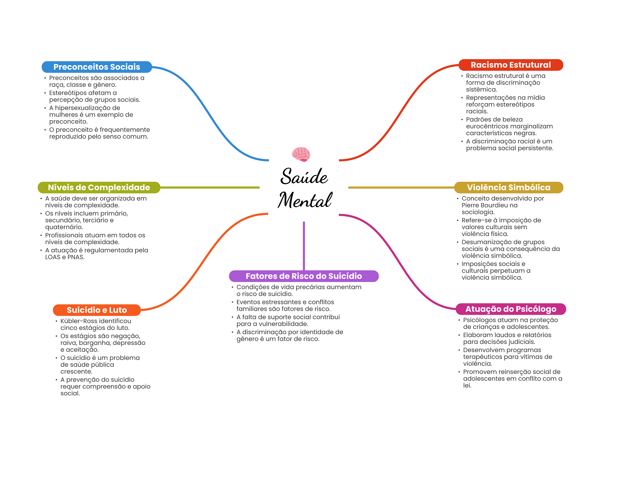 Preconceitos Sociais Racismo Estrutural Preconceitos são associados a Racismo estrutural é uma raça, classe e gênero. forma de discriminação sistêmica. Estereótipos afetam a percepção de grupos sociais. Representações na mídia A hipersexualização de reforçam raciais. mulheres é um exemplo de preconceito. Padrões de beleza preconceito é frequentemente eurocêntricos marginalizam reproduzido pelo senso comum. características negras. A discriminação racial é um problema social persistente. Saúde Níveis de Complexidade Violência Simbólica A saúde deve ser organizada em Mental Conceito desenvolvido por níveis de complexidade. Pierre Bourdieu na Os níveis incluem primário, sociologia. secundário, terciário e Refere-se à imposição de quaternário. valores culturais sem Profissionais atuam em todos violência física. níveis de complexidade. Desumanização de grupos A atuação é regulamentada pela sociais é uma consequência da LOAS e PNAS. violência simbólica. Imposições sociais e culturais perpetuam a Fatores de Risco do Suicídio violência simbólica. Condições de vida precárias aumentam risco de suicídio. Eventos estressantes e conflitos Suicídio e Luto familiares são fatores de risco. Atuação do Psicólogo Kübler-Ross identificou A falta de suporte social contribui Psicólogos atuam na proteção para a vulnerabilidade. cinco estágios do luto. de crianças e adolescentes. A discriminação por identidade de Os estágios são negação, Elaboram laudos e relatórios gênero é um fator de risco. raiva, barganha, depressão para decisões judiciais. e aceitação. Desenvolvem programas suicídio é um problema terapêuticos para vítimas de de saúde pública violência. crescente. Promovem reinserção social de A prevenção do suicídio adolescentes em conflito com a requer compreensão e apoio lei. social.