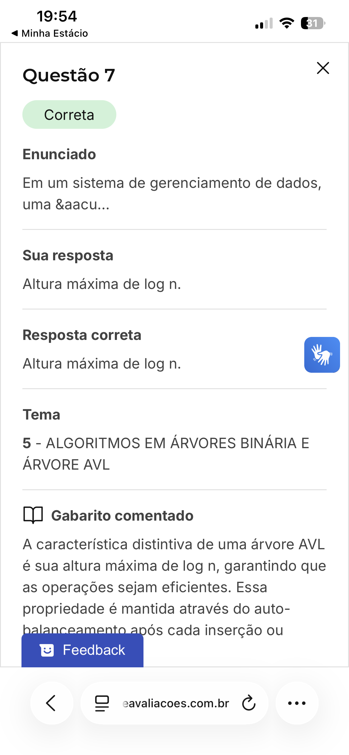 19:54 31 Minha Estácio Questão 7 X Correta Enunciado Em um sistema de gerenciamento de dados, uma &aacu... Sua resposta Altura máxima de log n. Resposta correta Altura máxima de log n. Tema 5 - ALGORITMOS EM ÁRVORES BINÁRIA E ÁRVORE AVL Gabarito comentado A característica distintiva de uma árvore AVL é sua altura máxima de log n, garantindo que as operações sejam eficientes. Essa propriedade é mantida através do auto- balanceamento após cada inserção ou Feedback eavaliacoes.com.br