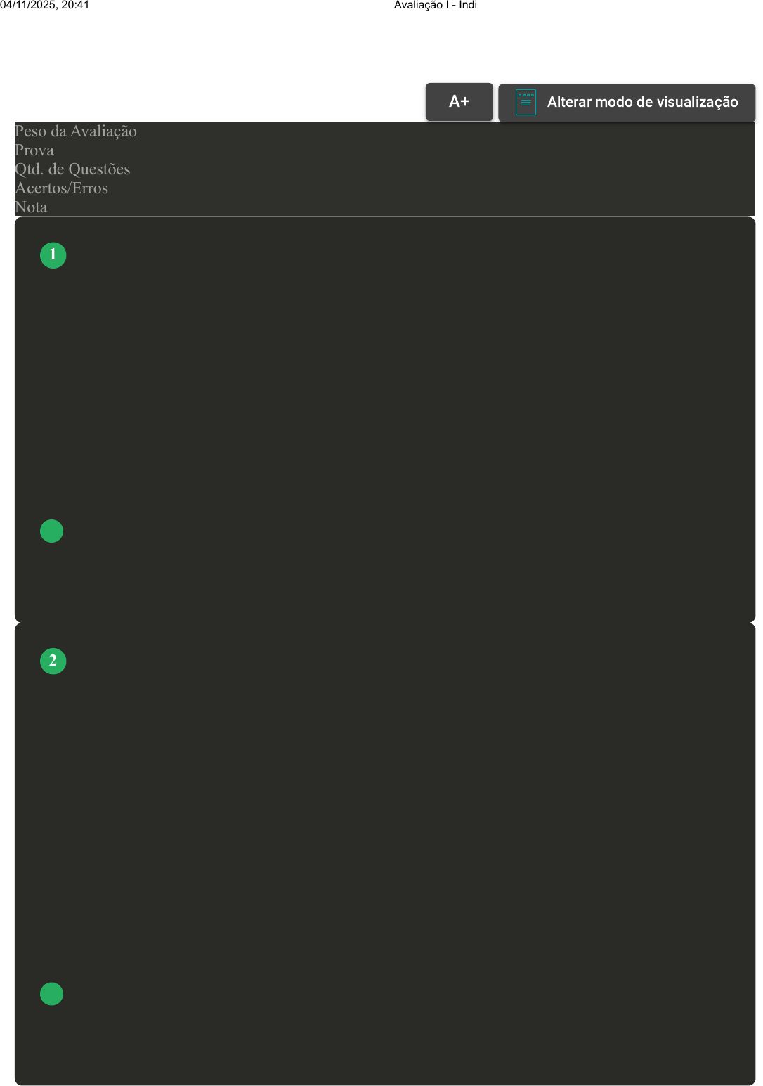Prova Impressa GABARITO | Avaliação I - Individual (Cod.:1523660) Peso da Avaliação 2,00 Prova 108349279 Qtd. de Questões 10 Acertos/Erros 10/0 Nota 10,00 A resposta imune é o processo de defesa do corpo através do sistema imunológico, é dividida em resposta imune inata e adquirida. Com base na resposta imune, classifique V para as sentenças verdadeiras e F para as falsas: ( ) A memória imunológica faz parte da resposta imune inata. ( ) As imunoglobulinas IgG são inespecíficos e podem-se ligar a qualquer antígeno no organismo. ( ) A resposta imune inata está relacionada à primeira ação do organismo contra agentes infecciosos. ( ) A resposta imune adquirida está relacionada à seleção clonal de linfócitos. Assinale a alternativa que apresenta a sequência CORRETA: A V - F - F - F. B F - F - F - F. C F - F - V - V. D F - V - V - F. Nos testes laboratoriais, é importante ressaltar a necessidade de seguir as instruções de uso, e cuidado com os possíveis interferentes para reportar o resultado adequado. Com base no exposto, analise as sentenças a seguir: I- O tempo de execução dos testes não é uma variável a se preocupar, pois não interfere na leitura ou especificidade das reações. II- A condição em que a amostra se encontra como hemólise, lipemia e icterícia pode interferir nos resultados da análise e devem ser verificadas anteriormente à realização dos testes. III- Acondicionamento dos kits reagentes devem ser realizadas de forma correta, respeitando temperatura, umidade e a validade após abertura. Assinale a alternativa CORRETA: A Somente a sentença II está correta. B Somente a sentença I está correta. C As sentenças II e III estão corretas. D As sentenças I e III estão corretas. VOLTAR A+ Alterar modo de visualização 1 2 04/11/2025, 20:41 Avaliação I - Individual about:blank 1/5 O sistema complemento atua tanto na imunidade inata quanto na imunidade adquirida e sua ativação ocorre de três maneiras diferentes. Com base no exposto, associe os itens, utilizando o código a seguir: I- Via clássica. II- Via das lecitinas. III- Via alternativa ( ) Essa via é ativada pela ligação da lecitina plasmática aos resíduos de manose localizados na superfície dos agentes agressores. ( ) A ativação dessa via ocorre na superfície da membrana do agente agressor. ( ) Ativação ocorre após a ligação de algumas classes de anticorpos aos antígenos presentes no agressor. Assinale a alternativa que apresenta a sequência CORRETA: A I - III - II. B I - II - III. C III - II - I. D II - III - I. Nos imunoensaios, existem diferentes métodos que podem ser utilizados para detecção de antígenos e anticorpos, cada um com suas vantagens e desvantagens dentre os critérios que utilizamos para avaliação dos métodos temos a sensibilidade e especificidade. Com base no exposto, classifique V para as sentenças verdadeiras e F para as falsas: ( ) A sensibilidade de um teste corresponde à menor concentração da ligação antígeno-anticorpo que o imunoensaio é capaz de detectar. ( ) Um teste com alta sensibilidade é um teste que vai conseguir quantificar melhor a proporção de indivíduos saudáveis. ( ) A especificidade de um teste corresponde à concentração de anticorpos presentes no imunoensaio. ( ) Um teste com alta sensibilidade é um teste com menor chance de apresentar resultados falsos positivos. Assinale a alternativa que apresenta a sequência CORRETA: A V - V - V - F. B F - V - V - V. C V - V - F - V. D V - F - F - F. Os fagócitos são células capas de reconhecer, englobar e destruir patógenos, que auxiliam nos processos imunológicos do organismo. Sobre essas células, analise as sentenças a seguir: 3 4 5 04/11/2025, 20:41 Avaliação I - Individual about:blank 2/5 I- Os monócitos são mononucleares presentes na circulação sanguínea. II- Neutrófilo está em menor quantidade na circulação periférica sendo responsável por combater bactérias e fungos. III- Macrófagos são células fagocitárias presentes nos tecidos. Assinale a alternativa CORRETA: A As sentenças I e III estão corretas. B Somente a sentença II está correta. C Somente a sentença I está correta. D As sentenças II e III estão corretas. O Fator Reumatoide (FR) é um autoanticorpo que tem como alvo a região Fc de IgGs, e a avaliação do fator reumatoide tem uma importante função prognóstica. Com base no exposto, classifique V para as sentenças verdadeiras e F para as falsas: ( ) Fator reumatoide é de utilização exclusiva deste marcador para confirmação de artrite reumatoide. ( ) O fator reumatoide é utilizado para avaliação da progressão da artrite reumatoide, ou seja, quanto mais elevado no soro do paciente, mais agressivo será o estágio da doença. ( ) Pacientes com doenças virais como Hepatite B e C podem ter o Fator Reumatoide elevados no soro. ( ) É uma análise auxiliar para o fechamento do diagnóstico de artrite reumatoide. Assinale a alternativa que apresenta a sequência CORRETA: A F - V - V - V. B V - F - F - V. C F - V - V - F. D F - V - F - V. O sistema imune desencadeia alguns processos para defesa do organismo em resposta à exposição a algum microrganismo ou agente agressor. Com base nos mecanismos desenvolvidos pelo sistema imune, assinale a alternativa CORRETA: A Estimulação da produção de plaquetas na medula óssea. B Liberação de neurotransmissores na fenda sináptica. C Manutenção do volume plasmático intracelular. D Identificação de antígenos estranhos. 6 7 04/11/2025, 20:41 Avaliação I - Individual about:blank 3/5 E Transporte de oxigênio para os tecidos. [Laboratório Virtual - Tipagem sanguínea] A determinação correta do tipo sanguíneo de doadores e pacientes é essencial para a transfusão segura de sangue e hemoderivados ou para o transplante seguro de órgãos e tecidos. A tipagem sanguínea consiste no uso de reagentes ou dispositivos altamente regulados, padronizados e específi