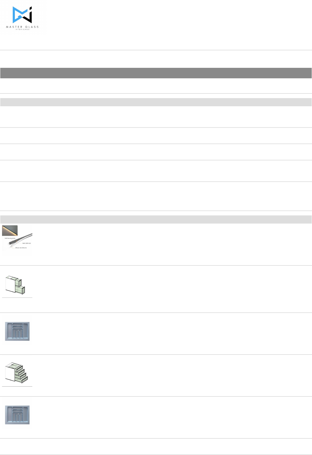 MASTER GLASS INTERIORES Rua Cristóvão Colombo Qd.47 LT.17 - Parque industrial João Braz 74483-190 - Goiânia/GO Tel.: 6232105812 Dados do Cliente Francisco 2105 Data: 17/10/2025 ORÇAMENTO Nº 0183-25 Serviços Nome Quantidade Unidade Valor Unitário Valor Total • ARMARIO BASE DE COZINHA 4.690 m2 R$ 1.327,00 R$ 6.223,63 Estrutura em alumínio com revestimento de base , laterais , divisórias, prateleiras em ACM, frentes e tamponamento em vidro.(*NÃO ESTÁ INCLUSO REVESTIMENTO DE FUNDO/PAREDE) • ARMÁRIO MULTIUSO 3.970 m2 R$ 1.327,00 R$ 5.268,19 Estrutura em alumínio com revestimento de base , laterais , divisórias, prateleiras em ACM, frentes e tamponamento em vidro. • AÉREO DE COZINHA 6.100 m2 R$ 1.451,00 R$ 8.851,10 Estrutura em alumínio com revestimento interno em ACM e prateleiras com vidros. • ARMARIO BASE DE COZINHA 3.420 m2 R$ 1.327,00 R$ 4.538,34 Estrutura em alumínio com revestimento de base , laterais , divisórias, prateleiras em ACM, frentes e tamponamento em vidro.(*NÃO ESTÁ INCLUSO REVESTIMENTO DE FUNDO/PAREDE) Total Serviços R$ 24.881,26 Componentes Nome Quantidade Unidade Valor Unitário Valor Total Kit Led (Luz Neutra) 1 un R$ 600,00 R$ 600,00 Sistema de iluminação em led com perfil para moveis. Porta temperos duplo 1 un R$ 385,00 R$ 385,00 Conjunto de duas(2) gavetas para Condimentos, em vidro incolor 4mm com puxador e corrediças sem amortecimento. Divisor de talheres 1 un R$ 91,70 R$ 91,70 Organizador de talheres para gaveta. Gaveteiro quádruplo 1 un R$ 1.040,00 R$ 1.040,00 Conjunto com quatro(4) Gavetas em vidro incolor 4mm com puxador e corrediças telescópica sem amortecimento. Divisor de talheres 1 un R$ 91,70 R$ 91,70 Organizador de talheres para gaveta. Nicho aéreo 1 un R$ 650,00 R$ 650,00 Estrutura de alumínio com revestimento interno em ACM , e alças de fixação aérea. Gaveteiro quádruplo 1 un R$ 1.040,00 R$ 1.040,00 Conjunto com quatro(4) Gavetas em vidro incolor 4mm com puxador e corrediças telescópica sem amortecimento. Total Componentes R$ 3.898,40 Subtotal R$ 28.779,66 Total Orçamento R$ 28.779,66 MASTER GLASS INTERIORES
