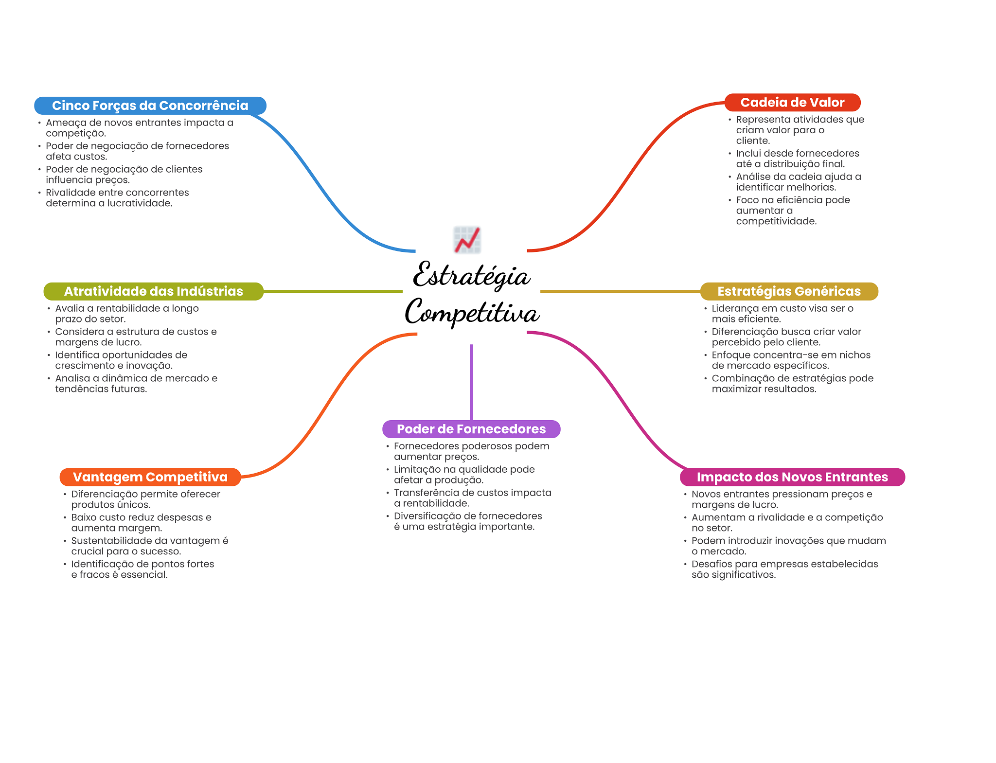 Cinco Forças da Concorrência Cadeia de Valor Ameaça de novos entrantes impacta a Representa atividades que competição. criam valor para cliente. Poder de negociação de fornecedores afeta custos. Inclui desde fornecedores Poder de negociação de clientes até a distribuição final. influencia preços. Análise da cadeia ajuda a identificar melhorias. Rivalidade entre concorrentes determina a lucratividade. Foco na eficiência pode aumentar a competitividade. N Estratégia Atratividade das Indústrias Estratégias Genéricas Avalia a rentabilidade a longo prazo do setor. Competitiva Liderança em custo visa ser mais eficiente. Considera a estrutura de custos e Diferenciação busca criar valor margens de lucro. percebido pelo cliente. Identifica oportunidades de Enfoque concentra-se em nichos crescimento e inovação. de mercado específicos. Analisa a dinâmica de mercado e Combinação de estratégias pode tendências futuras. maximizar resultados. Poder de Fornecedores Fornecedores poderosos podem aumentar preços. Limitação na qualidade pode Vantagem Competitiva afetar a produção. Impacto dos Novos Entrantes Diferenciação permite oferecer Transferência de custos impacta Novos entrantes pressionam preços e produtos únicos. a rentabilidade. margens de lucro. Baixo custo reduz despesas e Diversificação de fornecedores Aumentam a rivalidade e a competição aumenta margem. é uma estratégia importante. no setor. Sustentabilidade da vantagem é Podem introduzir inovações que mudam crucial para O sucesso. O mercado. Identificação de pontos fortes Desafios para empresas estabelecidas e fracos é essencial. são significativos.