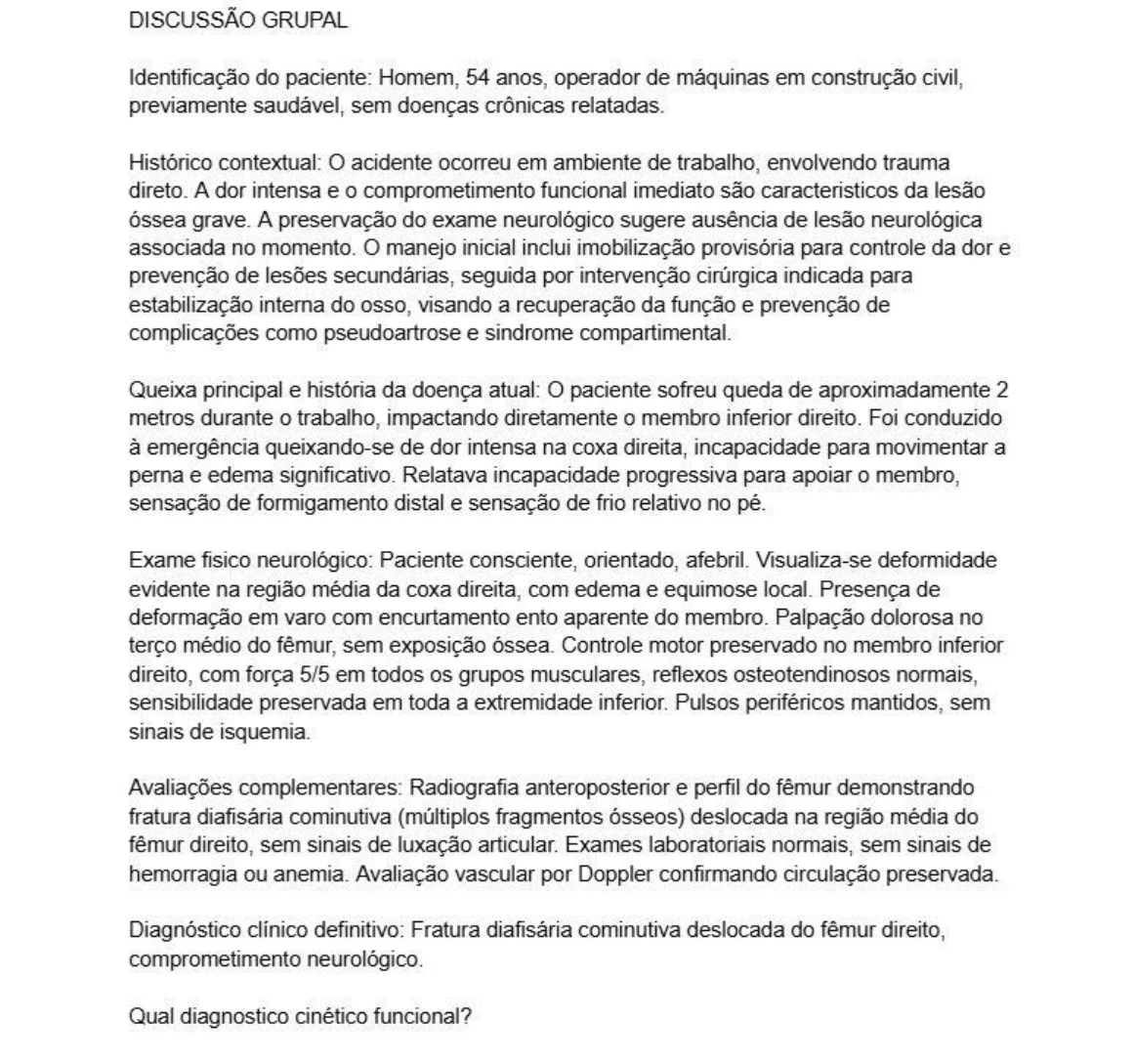 DISCUSSÃO GRUPAL Identificação do paciente: Homem, 54 anos, operador de máquinas em construção civil, previamente saudável, sem doenças crônicas relatadas. Histórico contextual: acidente ocorreu em ambiente de trabalho, envolvendo trauma direto. A dor intensa e 0 comprometimento funcional imediato são caracteristicos da lesão óssea grave. A preservação do exame neurológico sugere ausência de lesão neurológica associada no momento. manejo inicial inclui imobilização provisória para controle da dor e prevenção de lesões secundárias, seguida por intervenção cirúrgica indicada para estabilização interna do osso, visando a recuperação da função e prevenção de complicações como pseudoartrose e sindrome compartimental. Queixa principal e história da doença atual: paciente sofreu queda de aproximadamente 2 metros durante trabalho, impactando diretamente 0 membro inferior direito. Foi conduzido à emergência queixando-se de dor intensa na coxa direita, incapacidade para movimentar a perna e edema significativo. Relatava incapacidade progressiva para apoiar membro, sensação de formigamento distal e sensação de frio relativo no pé. Exame fisico neurológico: Paciente consciente, orientado, afebril. Visualiza-se deformidade evidente na região média da coxa direita, com edema e equimose local. Presença de deformação em varo com encurtamento ento aparente do membro. Palpação dolorosa no terço médio do fêmur, sem exposição óssea. Controle motor preservado no membro inferior direito, com força 5/5 em todos os grupos musculares, reflexos osteotendinosos normais, sensibilidade preservada em toda a extremidade inferior. Pulsos periféricos mantidos, sem sinais de isquemia. Avaliações complementares: Radiografia anteroposterior e perfil do fêmur demonstrando fratura diafisária cominutiva (múltiplos fragmentos ósseos) deslocada na região média do fêmur direito, sem sinais de luxação articular. Exames laboratoriais normais, sem sinais de hemorragia ou anemia. Avaliação vascular por Doppler confirmando circulação preservada. Diagnóstico clínico definitivo: Fratura diafisária cominutiva deslocada do fêmur direito, comprometimento neurológico. Qual diagnostico cinético funcional?