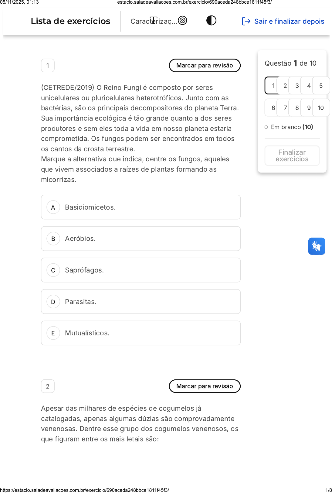 A B C D E 1 Marcar para revisão (CETREDE/2019) O Reino Fungi é composto por seres unicelulares ou pluricelulares heterotróficos. Junto com as bactérias, são os principais decompositores do planeta Terra. Sua importância ecológica é tão grande quanto a dos seres produtores e sem eles toda a vida em nosso planeta estaria comprometida. Os fungos podem ser encontrados em todos os cantos da crosta terrestre. Marque a alternativa que indica, dentre os fungos, aqueles que vivem associados a raízes de plantas formando as micorrizas. Basidiomicetos. Aeróbios. Saprófagos. Parasitas. Mutualísticos. 2 Marcar para revisão Apesar das milhares de espécies de cogumelos já catalogadas, apenas algumas dúzias são comprovadamente venenosas. Dentre esse grupo dos cogumelos venenosos, os que figuram entre os mais letais são: Questão 1 de 10 Em branco (10) 1 2 3 4 5 6 7 8 9 10 Finalizar exercícios Lista de exercícios Caracterizaç… Sair e finalizar depois 05/11/2025, 01:13 estacio.saladeavaliacoes.com.br/exercicio/690aceda248bbce1811f45f3/ https://estacio.saladeavaliacoes.com.br/exercicio/690aceda248bbce1811f45f3/ 1/8 A B C D E A B C Panaeolus cyanescens, Amanita lilloi e Conocybe tenera. Amanita verna, Amanita virosa e Amanita phalloides. Psicocybe cubensis, Galerina autumnalis e Amanita lippiae. Amanita phalloides, Amanita lilloi e Entomola lividum. Amanita muscaria, Amanita phalloides e Amanita virosa. 3 Marcar para revisão Os cogumelos venenosos apresentam sérios riscos à vida, dependendo do tipo de toxina que eles produzem. A amatoxina é a mais estudada e a mais letal. Qual é o mecanismo de absorção e de ação desta toxina? Absorção intradérmica. Estímulo dos receptores colinérgicos de acetilcolina no sistema nervoso parassimpático. Absorção gastrointestinal. Inibição da enzima RNA polimerase que participa de processos fundamentais na síntese de proteínas. Absorção intraperitonial. Inibição da enzima DNA polimerase que atua na divisão nuclear e mitose celular. 05/11/2025, 01:13 estacio.saladeavaliacoes.com.br/exercicio/690aceda248bbce1811f45f3/ https://estacio.saladeavaliacoes.com.br/exercicio/690aceda248bbce1811f45f3/ 2/8 D E A B C Absorção gastrointestinal. Interação com a actina e assim desestabilizar a ligação entre os monômeros de actina. Absorção intraperitoneal. Inibição não competitiva da atividade da fosfatase alcalina, g-glutamil transpeptidase e leucina aminopeptidase. 4 Marcar para revisão (CESPE / CEBRASPE/2009 - adaptada) A ADAGRI anunciou, no mês de abril, que o Ceará é um estado livre da sigatoka negra. Essa é a principal doença da bananeira e é ocasionada por um fungo que está sendo alvo de projeto de pesquisa da EMBRAPA Amazônia Ocidental (Manaus - AM) que visa avaliar a variabilidade genética desse fungo utilizando marcadores genéticos do tipo microssatélites. Microssatélites são regiões do genoma eucarioto que apresentam repetições de uma sequência cerne (sequência motivo) com número variável. O número de alelos geralmente é alto para essas sequências genômicas. I - O fungo responsável pela sigatoka negra é um organismo eucarioto. Porque II - Um organismo eucarioto possui seu material genético composto de ácido desoxirribonucleico. Marque a alternativa que apresenta a relação entre as asserções I e II. As asserções I e II são verdadeiras e a asserção II é uma justificativa para a asserção I. As asserções I e II são verdadeiras mas a asserção II não é uma justificativa para a asserção I. A asserção I é verdadeira e a asserção II é falsa. 05/11/2025, 01:13 estacio.saladeavaliacoes.com.br/exercicio/690aceda248bbce1811f45f3/ https://estacio.saladeavaliacoes.com.br/exercicio/690aceda248bbce1811f45f3/ 3/8 D E A B C D E A asserção I é falsa e a asserção II é verdadeira. As asserções I e II são falsas. 5 Marcar para revisão Os organismos agrupados como fungos são seres eucariontes e heterotróficos. Sobre os fungos, assinale a alternativa correta. Fungos saprófitos provocam doenças como as micoses em seres humanos e a ferrugem em cafeeiros. Alguns fungos são capazes de produzir toxinas que têm ação neurotóxica, nefrotóxica ou hepatotóxica, podem causar alergias, problemas gastrointestinais ou até mesmo levar o indivíduo à morte. Candidíase, tricomoníase, histoplasmose e micoses são algumas doenças causadas por fungos. No grupo dos ascomicetos, estão os fungos venenosos, como os cogumelos do gênero Amanita. Os zigomicetos não desenvolvem corpos de frutificação, nem esporos sexuados, um exemplo é a Candida albicans. 6 Marcar para revisão (FCC/2007 - adaptada) A penicilina G é produzida em escala industrial pelo fungo Penicillium chrysogenum. A cinética do processo está apresentada no gráfico abaixo. 05/11/2025, 01:13 estacio.saladeavaliacoes.com.br/exercicio/690aceda248bbce1811f45f3/ https://estacio.saladeavaliacoes.com.br/exercicio/690aceda248bbce1811f45f3/ 4/8 A B C D E De acordo com o gráfico a produção de penicilina: Consome lactose e libera amônia no meio. Consome amônia e libera lactose no meio. É maior quando biomassa fúngica começa a se estabilizar. É inibida por amônia no tanque de cultivo. A produção de penicilina inibe a produção de bactérias pela liberação de amônia para o meio. 7 Marcar para revisão Fungos e plantas apresentam estruturas celulares em comum. No entanto eles podem se diferenciar das plantas por outros aspectos. Sobre as semelhanças e diferenças entre esses dois grupos, marque a alternativa correta. 05/11/2025, 01:13 estacio.saladeavaliacoes.com.br/exercicio/690aceda248bbce1811f45f3/ https://estacio.saladeavaliacoes.com.br/exercicio/690aceda248bbce1811f45f3/ 5/8 A B C D E Ambos os grupos apresentam parede celular e cloroplastos, mas fungos não apresentam vacúolo. Ambos os grupos apresentam parede celular e vacúolo, mas fungos não apresentam cloroplastos. Ambos os grupos apresentam parede celu