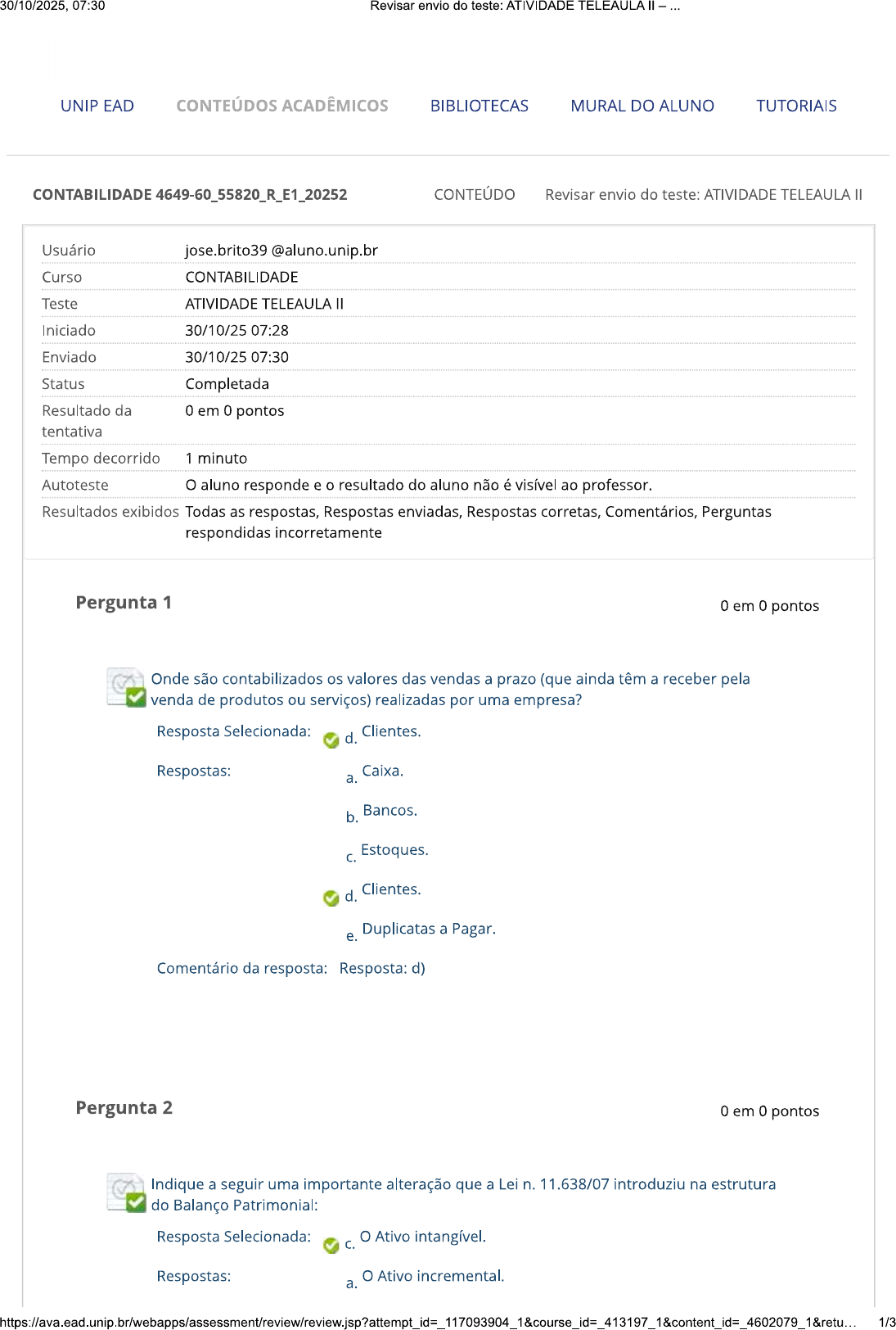 30/10/2025, 07:30 Revisar envio do teste: ATIVIDADE TELEAULA UNIP EAD CONTEÚDOS ACADÊMICOS BIBLIOTECAS MURAL DO ALUNO TUTORIAIS CONTABILIDADE 4649-60_55820_R_E1_20252 CONTEÚDO Revisar envio do teste: ATIVIDADE TELEAULA Usuário jose.brito39 @aluno.unip.br Curso CONTABILIDADE Teste ATIVIDADE TELEAULA Iniciado 30/10/25 07:28 Enviado 30/10/25 07:30 Status Completada Resultado da 0 em 0 pontos tentativa Tempo decorrido 1 minuto Autoteste O aluno responde e o resultado do aluno não é visível ao professor. Resultados exibidos Todas as respostas, Respostas enviadas, Respostas corretas, Comentários, Perguntas respondidas incorretamente Pergunta 1 0 em 0 pontos Onde são contabilizados os valores das vendas a prazo (que ainda têm a receber pela venda de produtos ou serviços) realizadas por uma empresa? Resposta Selecionada: d. Clientes. Respostas: a. Caixa. b. Bancos. Estoques. d. Clientes. e. Duplicatas a Pagar. Comentário da resposta: Resposta: d) Pergunta 2 0 em 0 pontos Indique a seguir uma importante alteração que a Lei n. 11.638/07 introduziu na estrutura do Balanço Patrimonial: Resposta Selecionada: Ativo intangível. C. Respostas: Ativo incremental. a. 1/330/10/2025, 07:30 Revisar envio do teste: ATIVIDADE TELEAULA b. Ativo circulante. Ativo intangível. C. d. Ativo inexato. Passivo circulante. e. Comentário da resposta: Resposta: c) Pergunta 3 0 em 0 pontos No encerramento contábil de um exercício, a conta bancária, devidamente contabilizada na conta "Bancos" de uma empresa estava com saldo negativo. Nesse caso: Resposta A conta Bancos deve ser demonstrada no Passivo circulante. Selecionada: Respostas: a. A conta Bancos deve ser demonstrada no Ativo não circulante. b. A conta Bancos deve ser demonstrada no Ativo circulante. A conta Bancos deve ser demonstrada no Passivo circulante. d. A conta Bancos deve ser demonstrada no Passivo não circulante. Não deve ser demonstrada. e. Comentário da resposta: Resposta: c) Pergunta 4 Todas as contas contábeis da DRE são consideradas "contas de resultado". Mas após a apuração do resultado, que é feito com lucro e/ou prejuízo? Resposta C. Selecionada: Passa a ser uma "conta patrimonial", que aumenta ou diminuiu o patrimônio. Respostas: a. Nada. b. É transferido para posterior análise. Passa a ser uma "conta patrimonial", que aumenta ou diminuiu o patrimônio. 2/330/10/2025, 07:30 Revisar envio do teste: ATIVIDADE TELEAULA d. Renovam-se os ativos da empresa. e. Reafirmam-se os passivos da empresa. Comentário da resposta: Resposta: c) Quinta-feira, 30 de Outubro de 2025 07h30min10s GMT-03:00 OK 3/3