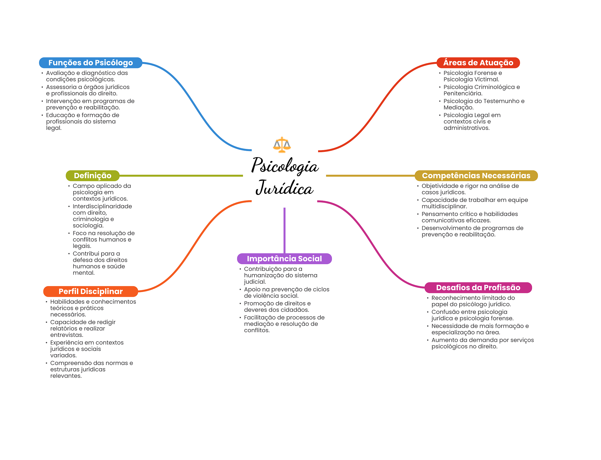 Funções do Psicólogo Áreas de Atuação Avaliação e diagnóstico das Psicologia Forense e condições psicológicas. Psicologia Víctimal. Assessoria a órgãos jurídicos Psicologia Criminológica e e profissionais do direito. Penitenciária. Intervenção em programas de Psicologia do Testemunho e prevenção e reabilitação. Mediação. Educação e formação de Psicologia Legal em profissionais do sistema contextos civis e legal. administrativos. Psicologia Definição Competências Necessárias Campo aplicado da psicologia em Jurídica Objetividade e rigor na análise de casos jurídicos. contextos jurídicos. Capacidade de trabalhar em equipe Interdisciplinaridade multidisciplinar. com direito, Pensamento crítico e habilidades criminologia e comunicativas eficazes. sociologia. Desenvolvimento de programas de Foco na resolução de prevenção e reabilitação. conflitos humanos e legais. Contribui para a defesa dos direitos Importância Social humanos e saúde Contribuição para a mental. humanização do sistema judicial. Apoio na prevenção de ciclos Desafios da Profissão Perfil Disciplinar de violência social. Reconhecimento limitado do Habilidades e conhecimentos Promoção de direitos e papel do psicólogo jurídico. teóricos e práticos deveres dos cidadãos. necessários. Confusão entre psicologia Facilitação de processos de jurídica e psicologia forense. Capacidade de redigir mediação e resolução de relatórios e realizar Necessidade de mais formação e conflitos. entrevistas. especialização na área. Experiência em contextos Aumento da demanda por serviços jurídicos e sociais psicológicos no direito. variados. Compreensão das normas e estruturas jurídicas relevantes.