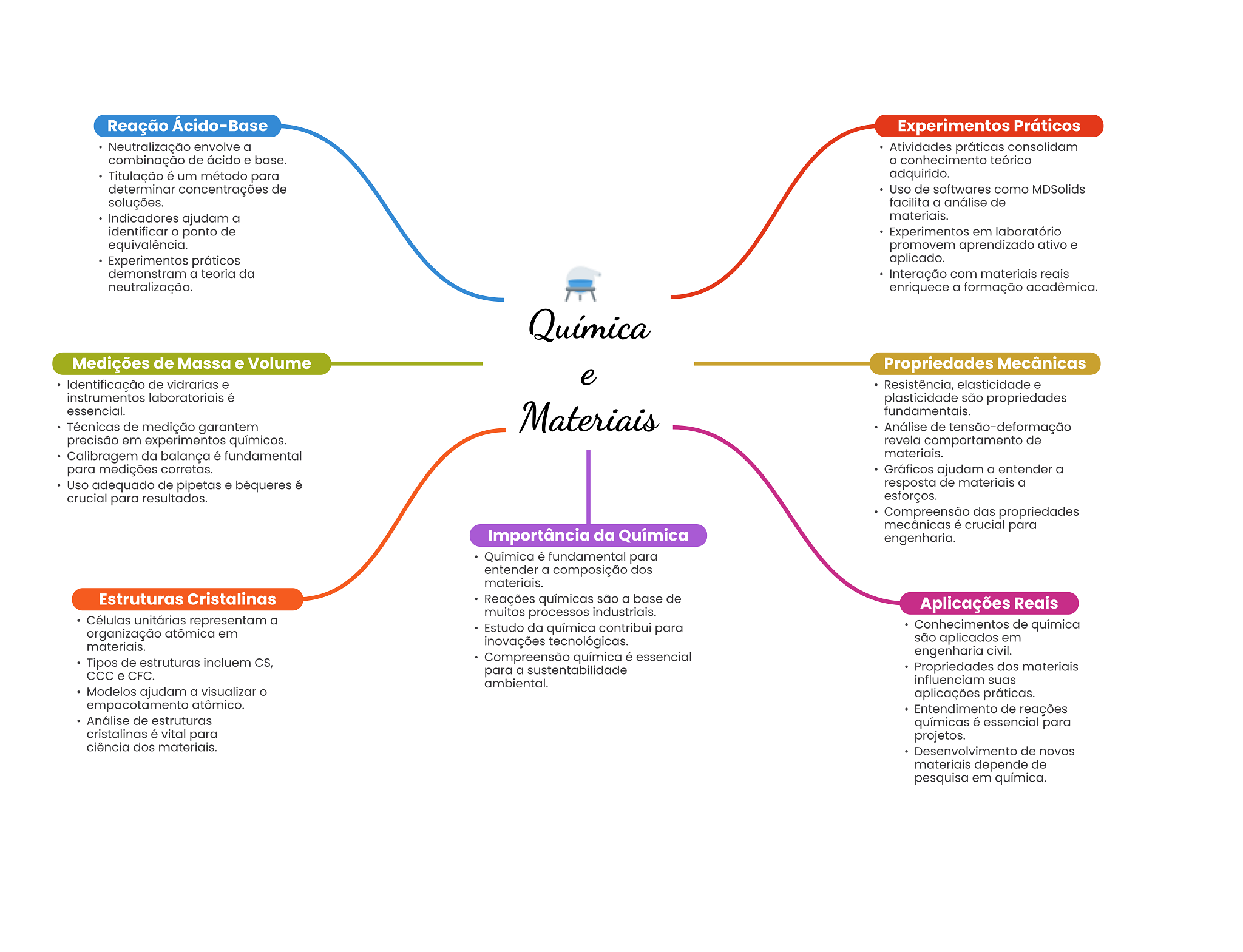 Reação Ácido-Base Experimentos Práticos Neutralização envolve a Atividades práticas consolidam combinação de ácido e base. conhecimento teórico Titulação é um método para adquirido. determinar concentrações de Uso de softwares como MDSolids soluções. facilita a análise de Indicadores ajudam a materiais. identificar ponto de Experimentos em laboratório equivalência. promovem aprendizado ativo e Experimentos práticos aplicado. demonstram a teoria da Interação com materiais reais neutralização. enriquece a formação acadêmica. Química Medições de Massa e Volume Propriedades Mecânicas Identificação de vidrarias e e Resistência, elasticidade e instrumentos laboratoriais é plasticidade são propriedades essencial. Técnicas de medição garantem Materiais fundamentais. Análise de tensão-deformação precisão em experimentos químicos. revela comportamento de Calibragem da balança é fundamental materiais. para medições corretas. Gráficos ajudam a entender a Uso adequado de pipetas e béqueres é resposta de materiais a crucial para resultados. esforços. Compreensão das propriedades mecânicas é crucial para Importância da Química engenharia. Química é fundamental para entender a composição dos materiais. Estruturas Cristalinas Reações químicas são a base de Aplicações Reais muitos processos industriais. Células unitárias representam a organização atômica em Estudo da química contribui para Conhecimentos de química materiais. inovações tecnológicas. são aplicados em Compreensão química é essencial engenharia civil. Tipos de estruturas incluem CS, para a sustentabilidade Propriedades dos materiais CCC e CFC. ambiental. influenciam suas Modelos ajudam a visualizar aplicações práticas. empacotamento atômico. Entendimento de reações Análise de estruturas químicas é essencial para cristalinas é vital para projetos. ciência dos materiais. Desenvolvimento de novos materiais depende de pesquisa em química.