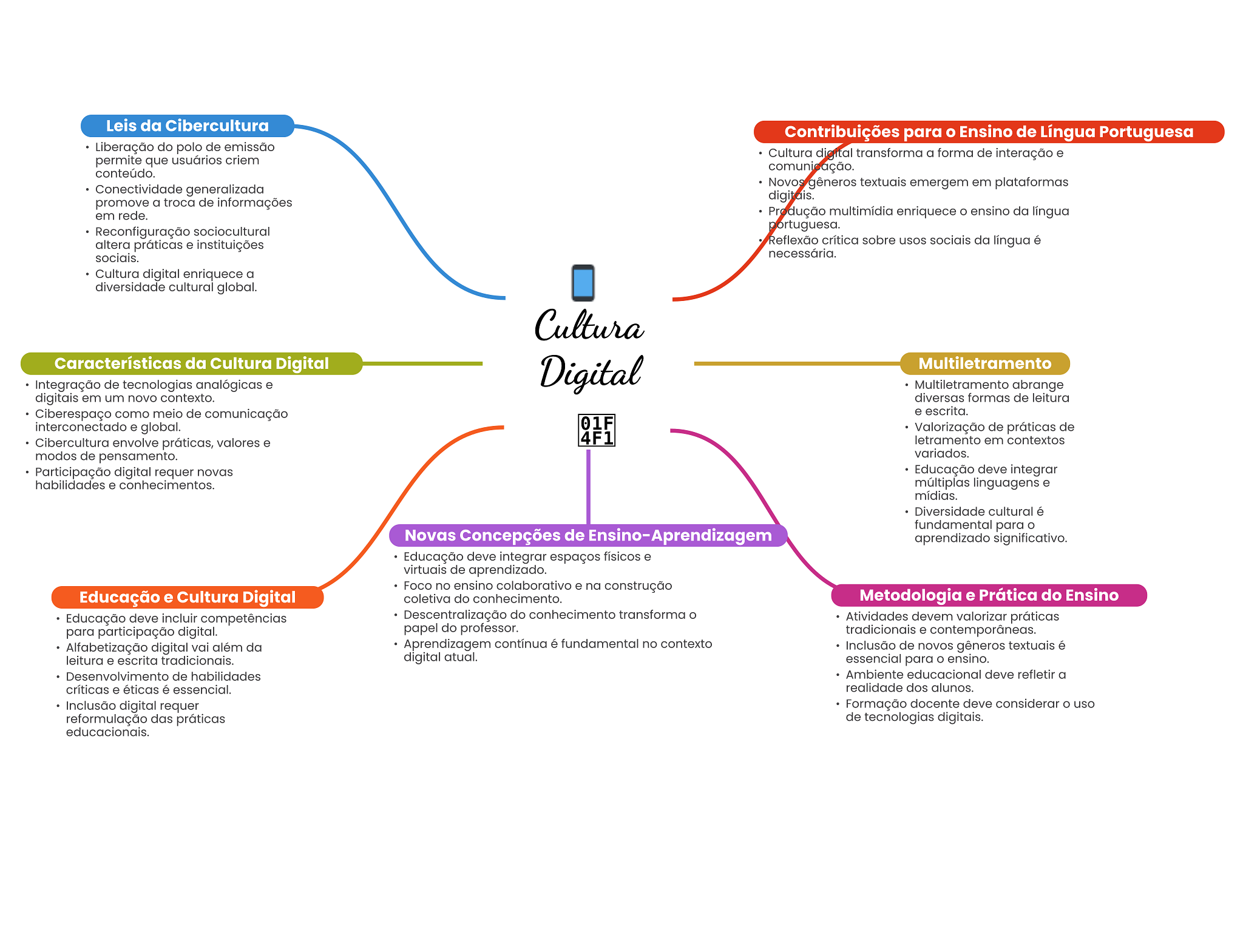 Leis da Cibercultura Contribuições para Ensino de Língua Portuguesa Liberação do polo de emissão Cultura digital transforma a forma de interação e permite que usuários criem conteúdo. comunicação. Conectividade generalizada Novos gêneros textuais emergem em plataformas digitais. promove a troca de informações em rede. Produção multimídia enriquece ensino da língua Reconfiguração sociocultural portuguesa. altera práticas e instituições Reflexão crítica sobre usos sociais da língua é sociais. necessária. Cultura digital enriquece a diversidade cultural global. Cultura Características da Cultura Digital Digital Multiletramento Integração de tecnologias analógicas e Multiletramento abrange digitais em um novo contexto. diversas formas de leitura Ciberespaço como meio de comunicação e escrita. interconectado e global. 01F Valorização de práticas de Cibercultura envolve práticas, valores e 4F1 letramento em contextos modos de pensamento. variados. Participação digital requer novas Educação deve integrar habilidades e conhecimentos. múltiplas linguagens e mídias. Diversidade cultural é fundamental para O Novas Concepções de Ensino-Aprendizagem aprendizado significativo. Educação deve integrar espaços físicos e virtuais de aprendizado. Foco no ensino colaborativo e na construção Educação e Cultura Digital coletiva do conhecimento. Metodologia e Prática do Ensino Educação deve incluir competências Descentralização do conhecimento transforma O Atividades devem valorizar práticas para participação digital. papel do professor. tradicionais e contemporâneas. Alfabetização digital vai além da Aprendizagem contínua é fundamental no contexto Inclusão de novos gêneros textuais é leitura e escrita tradicionais. digital atual. essencial para ensino. Desenvolvimento de habilidades Ambiente educacional deve refletir a críticas e éticas é essencial. realidade dos alunos. Inclusão digital requer Formação docente deve considerar uso reformulação das práticas de tecnologias digitais. educacionais.