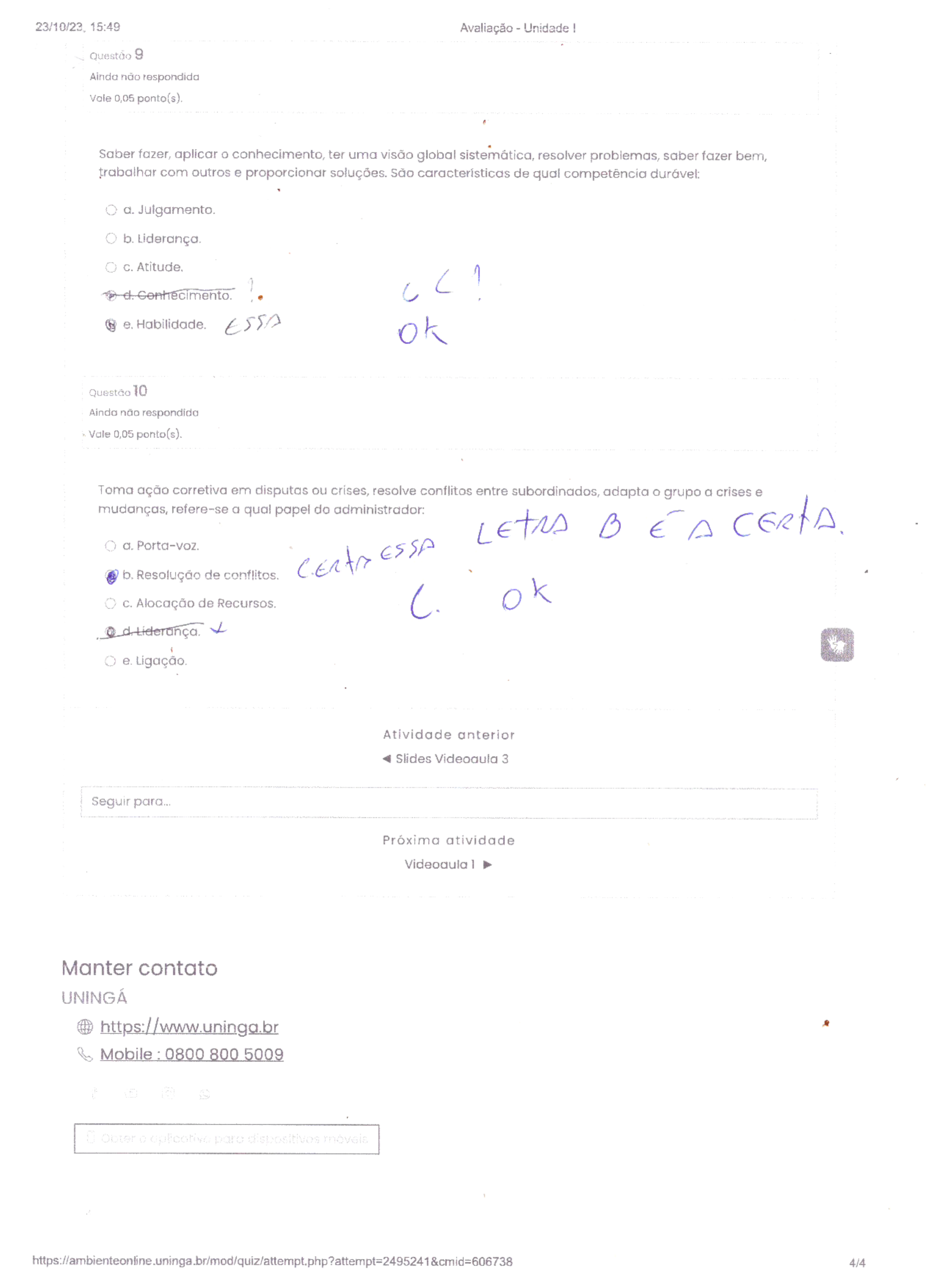 23/10/23, 15:49 Avaliação Unidade Questão 9 Ainda não respondida Vole 0,05 ponto(s). Saber fazer, aplicar o conhecimento, ter uma visão global sistemática, resolver problemas, saber fazer bem, trabalhar com outros e proporcionar soluções. São características de qual competência durável: d. Julgamento. b. Liderança. C. Atitude, d. e. Habilidade. ESSA ok Questão 10 Ainda não respondida Vale 0,05 ponto(s). Toma ação corretiva em disputas ou crises, resolve conflitos entre subordinados, adapta o grupo a crises e mudanças, refere-se a qual papel do administrador: B A a. Porta-voz. b. Resolução de conflitos. C. Alocação de Recursos. C. ok e. Ligação. Atividade anterior Slides 3 Seguir para... Próxima atividade Manter contato UNINGÁ https://www.uninga.br Mobile : 0800 800 5009 0 Obter móveis 4/4