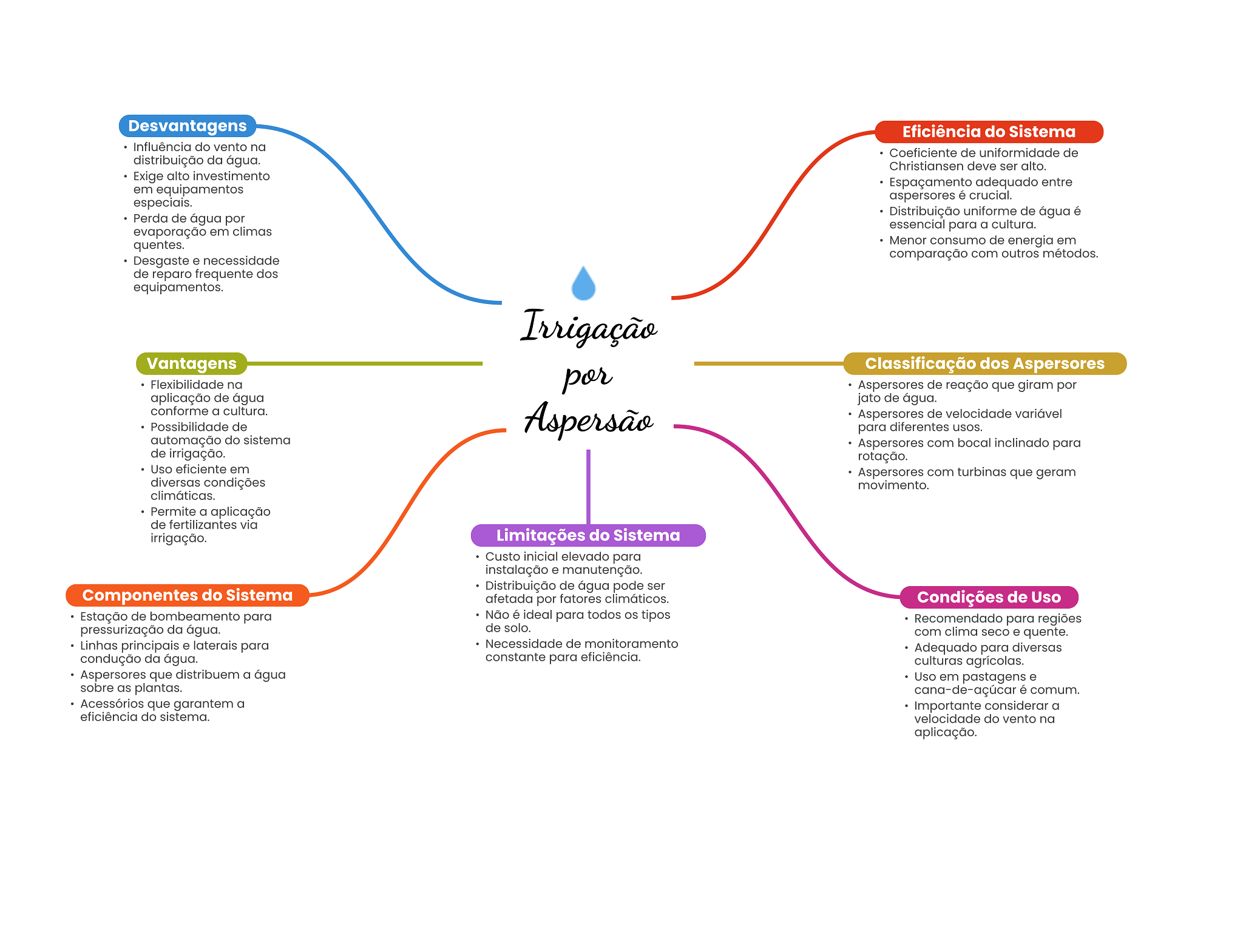 Desvantagens Eficiência do Sistema Influência do vento na Coeficiente de uniformidade de distribuição da água. Christiansen deve ser alto. Exige alto investimento Espaçamento adequado entre em equipamentos aspersores é crucial. especiais. Perda de água por Distribuição uniforme de água é evaporação em climas essencial para a cultura. quentes. Menor consumo de energia em Desgaste e necessidade comparação com outros métodos. de reparo frequente dos equipamentos. Irrigação Vantagens Classificação dos Aspersores Flexibilidade na por Aspersores de reação que giram por aplicação de água jato de água. conforme a cultura. Possibilidade de Aspersão Aspersores de velocidade variável para diferentes usos. automação do sistema Aspersores com bocal inclinado para de irrigação. rotação. Uso eficiente em Aspersores com turbinas que geram diversas condições movimento. climáticas. Permite a aplicação de fertilizantes via irrigação. Limitações do Sistema Custo inicial elevado para instalação e manutenção. Distribuição de água pode ser Componentes do Sistema afetada por fatores climáticos. Condições de Uso Estação de bombeamento para Não é ideal para todos tipos Recomendado para regiões pressurização da água. de solo. com clima seco e quente. Linhas principais e laterais para Necessidade de monitoramento Adequado para diversas condução da água. constante para eficiência. culturas agrícolas. Aspersores que distribuem a água Uso em pastagens e sobre as plantas. cana-de-açúcar é comum. Acessórios que garantem a Importante considerar a eficiência do sistema. velocidade do vento na aplicação.