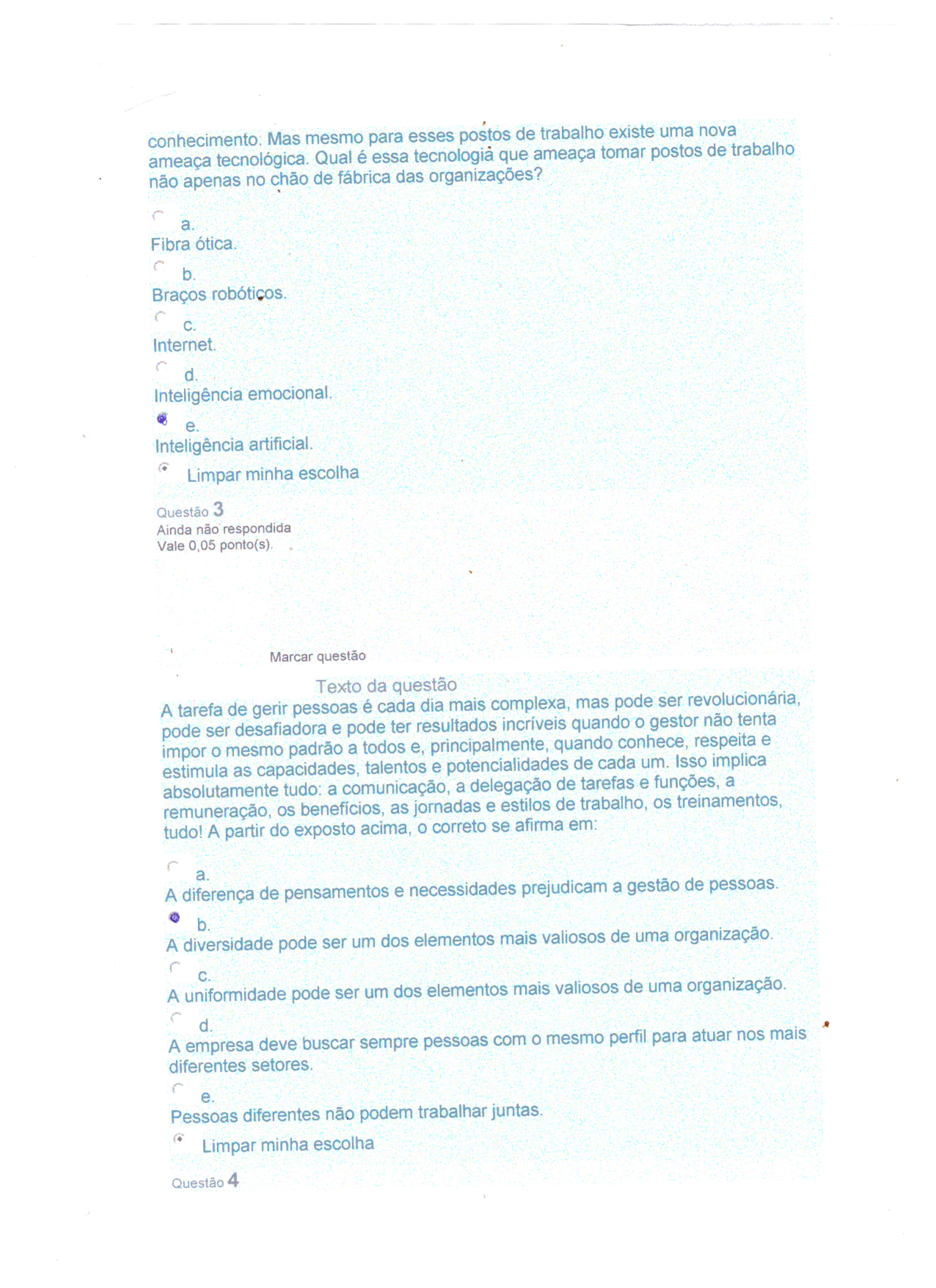 conhecimento: Mas mesmo para esses postos de trabalho existe uma nova ameaça tecnológica. Qual é essa tecnologia que ameaça tomar postos de trabalho não apenas no chão de fábrica das organizações? a. Fibra ótica. b. Braços robóticos. C. Internet. d. Inteligência emocional. e. Inteligência artificial. Limpar minha escolha Questão 3 Ainda não respondida Vale 0,05 ponto(s). Marcar questão Texto da questão A tarefa de gerir pessoas é cada dia mais complexa, mas pode ser revolucionária, pode ser desafiadora e pode ter resultados incríveis quando gestor não tenta impor mesmo padrão a todos e, principalmente, quando conhece, respeita e estimula as capacidades, talentos e potencialidades de cada um. Isso implica absolutamente tudo: a comunicação, a delegação de tarefas e funções, a remuneração, OS benefícios, as jornadas e estilos de trabalho, os treinamentos, tudo! A partir do exposto acima, correto se afirma em: a. A diferença de pensamentos e necessidades prejudicam a gestão de pessoas. b. A diversidade pode ser um dos elementos mais valiosos de uma organização. C. A uniformidade pode ser um dos elementos mais valiosos de uma organização. d. A empresa deve buscar sempre pessoas com mesmo perfil para atuar nos mais diferentes setores. e. Pessoas diferentes não podem trabalhar juntas. Limpar minha escolha Questão 4