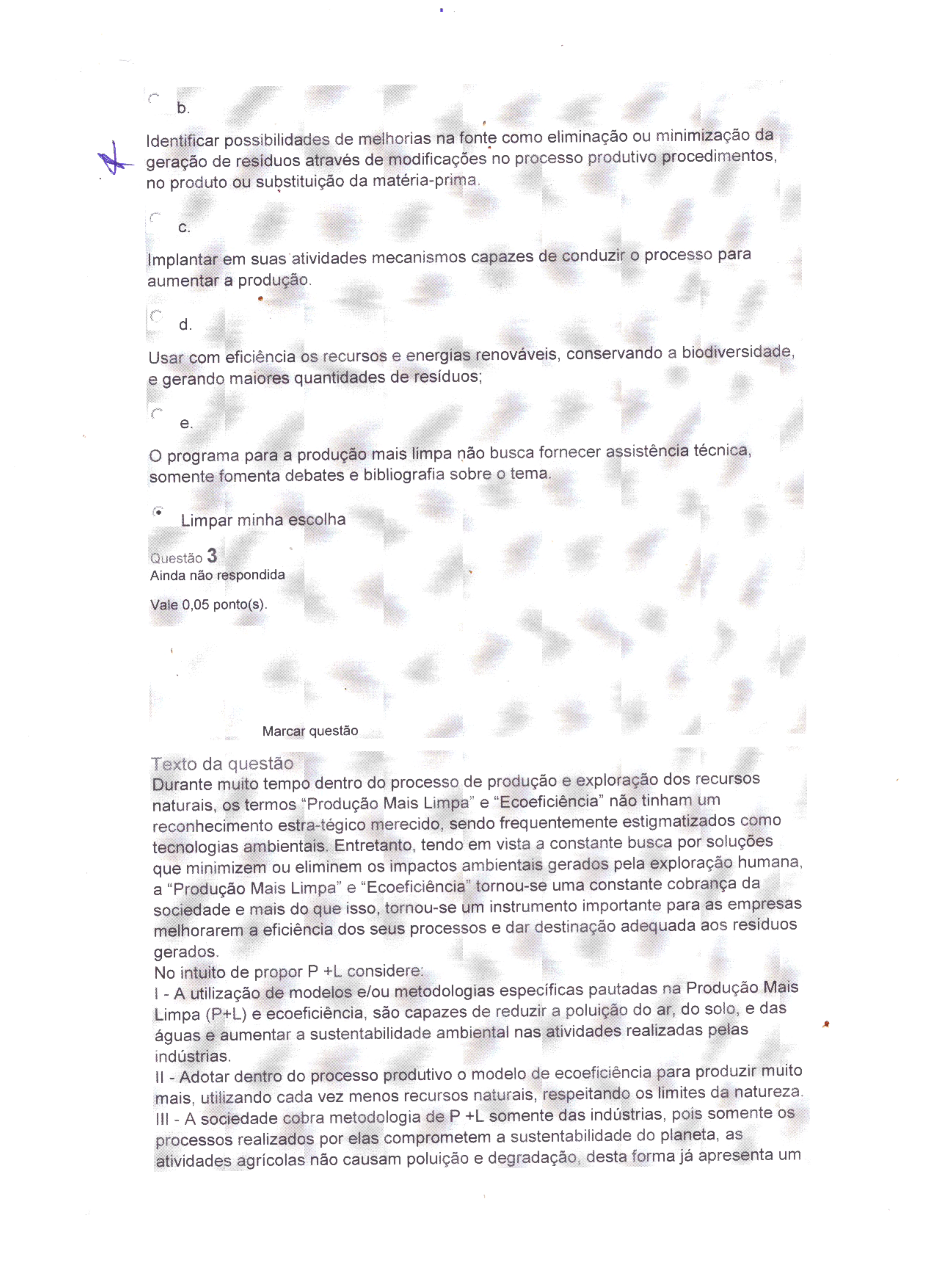 b. Identificar possibilidades de melhorias na fonte como eliminação ou minimização da geração de residuos através de modificações no processo produtivo procedimentos, no produto ou substituição da matéria-prima. C. Implantar em suas atividades mecanismos capazes de conduzir processo para aumentar a produção. d. Usar com eficiência os recursos e energias renováveis, conservando a biodiversidade, e gerando maiores quantidades de resíduos; e. programa para a produção mais limpa não busca fornecer assistência técnica, somente fomenta debates e bibliografia sobre tema. Limpar minha escolha Questão 3 Ainda não respondida Vale 0,05 ponto(s). Marcar questão Texto da questão Durante muito tempo dentro do processo de produção e exploração dos recursos naturais, os termos "Produção Mais Limpa" e "Ecoeficiência" não tinham um reconhecimento estra-tégico merecido, sendo frequentemente estigmatizados como tecnologias ambientais. Entretanto, tendo em vista a constante busca por soluções que minimizem ou eliminem os impactos ambientais gerados pela exploração humana, a "Produção Mais Limpa" e "Ecoeficiência" tornou-se uma constante cobrança da sociedade e mais do que isso, tornou-se um instrumento importante para as empresas melhorarem a eficiência dos seus processos e dar destinação adequada aos resíduos gerados. No intuito de propor P +L considere: I A utilização de modelos e/ou metodologias específicas pautadas na Produção Mais Limpa (P+L) e ecoeficiência, são capazes de reduzir a poluição do ar, do solo, e das águas e aumentar a sustentabilidade ambiental nas atividades realizadas pelas indústrias. II Adotar dentro do processo produtivo modelo de ecoeficiência para produzir muito mais, utilizando cada vez menos recursos naturais, respeitando limites da natureza. III A sociedade cobra metodologia de P +L somente das indústrias, pois somente os processos realizados por elas comprometem a sustentabilidade do planeta, as atividades agrícolas não causam poluição e degradação, desta forma já apresenta um