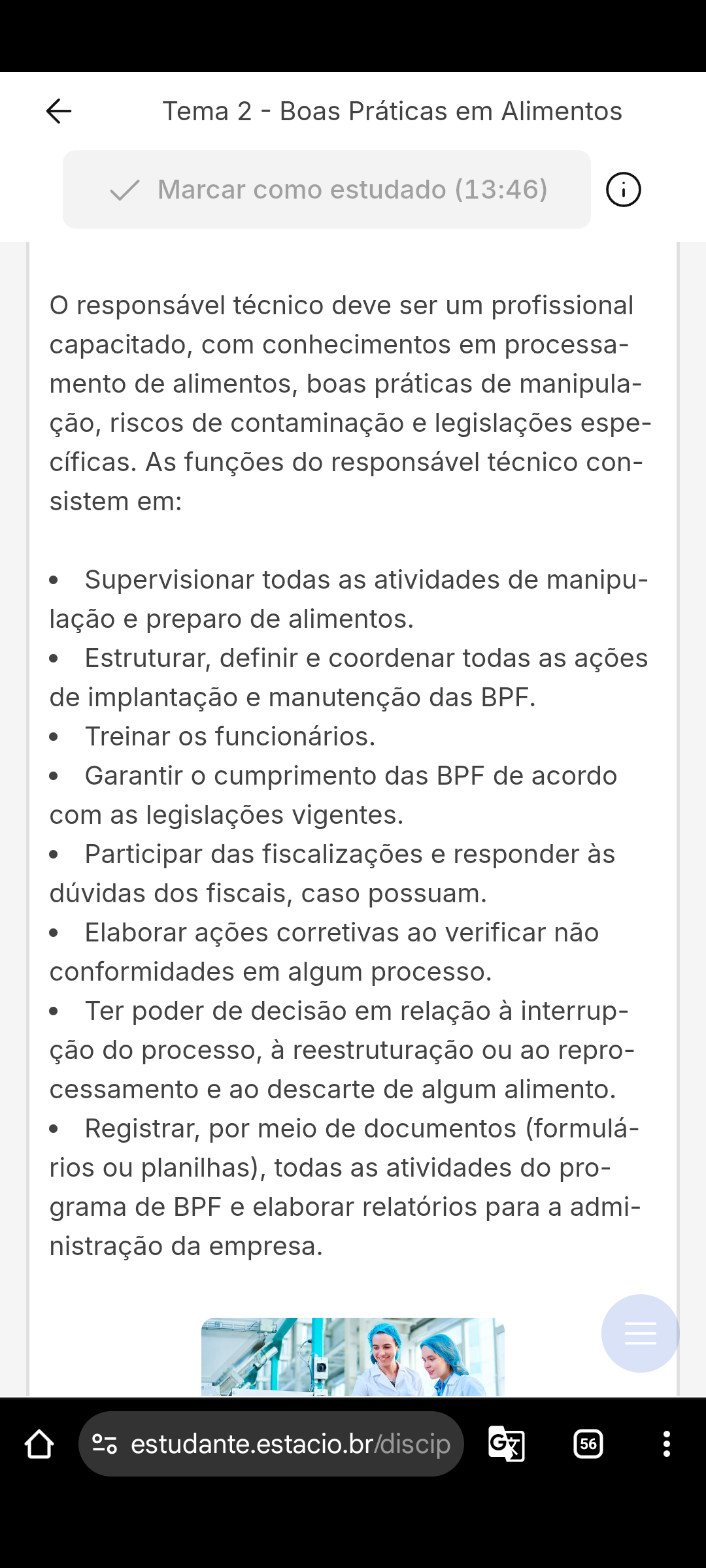 Tema 2 - Boas Práticas em Alimentos Marcar como estudado (13:46) responsável técnico deve ser um profissional capacitado, com conhecimentos em processa- mento de alimentos, boas práticas de manipula- ção, riscos de contaminação e legislações espe- cíficas. As funções do responsável técnico con- sistem em: Supervisionar todas as atividades de manipu- lação e preparo de alimentos. Estruturar, definir e coordenar todas as ações de implantação e manutenção das BPF. Treinar os funcionários. Garantir o cumprimento das BPF de acordo com as legislações vigentes. Participar das fiscalizações e responder às dúvidas dos fiscais, caso possuam. Elaborar ações corretivas ao verificar não conformidades em algum processo. Ter poder de decisão em relação à interrup- ção do processo, à reestruturação ou ao repro- cessamento e ao descarte de algum alimento. Registrar, por meio de documentos (formulá- rios ou planilhas), todas as atividades do pro- grama de BPF e elaborar relatórios para a admi- nistração da empresa. estudante.estacio.br/discip 56