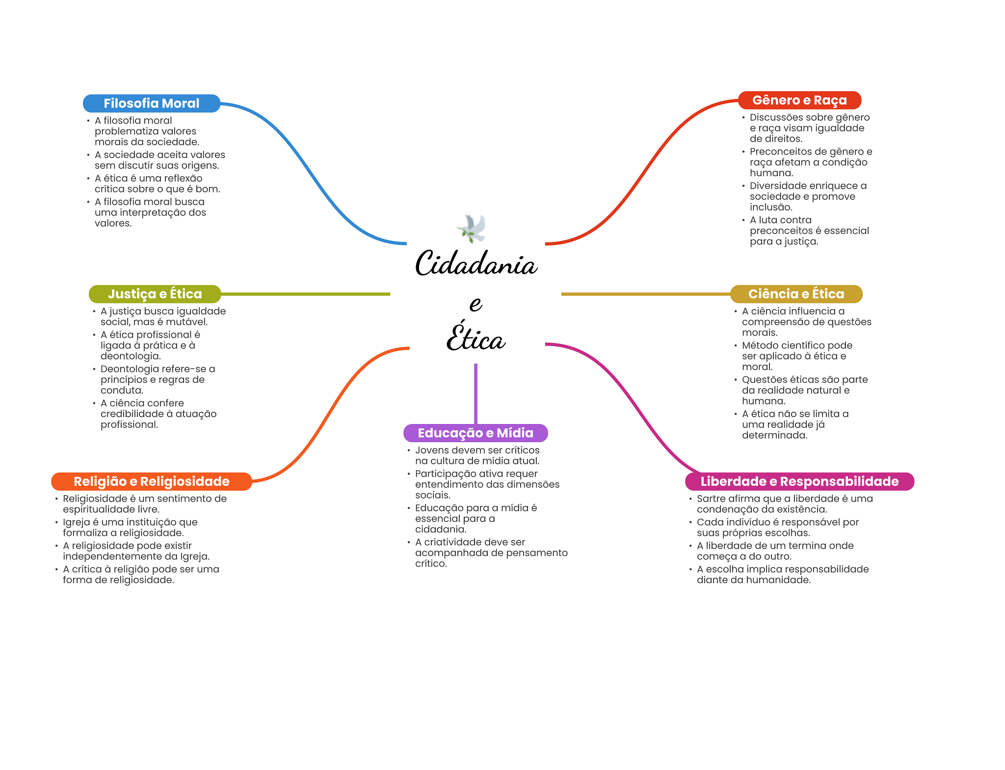 Filosofia Moral Gênero e Raça A filosofia moral Discussões sobre gênero problematiza valores e raça visam igualdade morais da sociedade. de direitos. A sociedade aceita valores Preconceitos de gênero e sem discutir suas origens. raça afetam a condição humana. A ética é uma reflexão crítica sobre que é bom. Diversidade enriquece a A filosofia moral busca sociedade e promove inclusão. uma interpretação dos valores. A luta contra preconceitos é essencial para a justiça. Cidadania Justiça e Ética Ciência e Ética e A justiça busca igualdade A ciência influencia a social, mas é mutável. Ética compreensão de questões A ética profissional é morais. ligada à prática e à Método científico pode deontologia. ser aplicado à ética e Deontologia refere-se a moral. princípios e regras de Questões éticas são parte conduta. da realidade natural e A ciência confere humana. credibilidade à atuação A ética não se limita a profissional. uma realidade já Educação e Mídia determinada. Jovens devem ser críticos na cultura de mídia atual. Participação ativa requer Religião e Religiosidade entendimento das dimensões Liberdade e Responsabilidade Religiosidade é um sentimento de sociais. Sartre afirma que a liberdade é uma espiritualidade livre. Educação para a mídia é condenação da existência. Igreja é uma instituição que essencial para a Cada indivíduo é responsável por formaliza a religiosidade. cidadania. suas próprias escolhas. A religiosidade pode existir A criatividade deve ser A liberdade de um termina onde independentemente da Igreja. acompanhada de pensamento começa a do outro. crítico. A crítica à religião pode ser uma A escolha implica responsabilidade forma de religiosidade. diante da humanidade.
