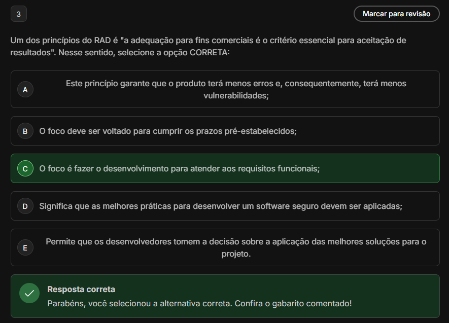 3 Marcar para revisão Um dos princípios do RAD é "a adequação para fins comerciais é critério essencial para aceitação de resultados". Nesse sentido, selecione a opção CORRETA: Este princípio garante que produto terá menos erros e, consequentemente, terá menos A vulnerabilidades; B foco deve ser voltado para cumprir os prazos pré-estabelecidos; C foco é fazer desenvolvimento para atender aos requisitos funcionais; D Significa que as melhores práticas para desenvolver um software seguro devem ser aplicadas; Permite que os desenvolvedores tomem a decisão sobre a aplicação das melhores soluções para E projeto. Resposta correta Parabéns, você selecionou a alternativa correta. Confira gabarito comentado!