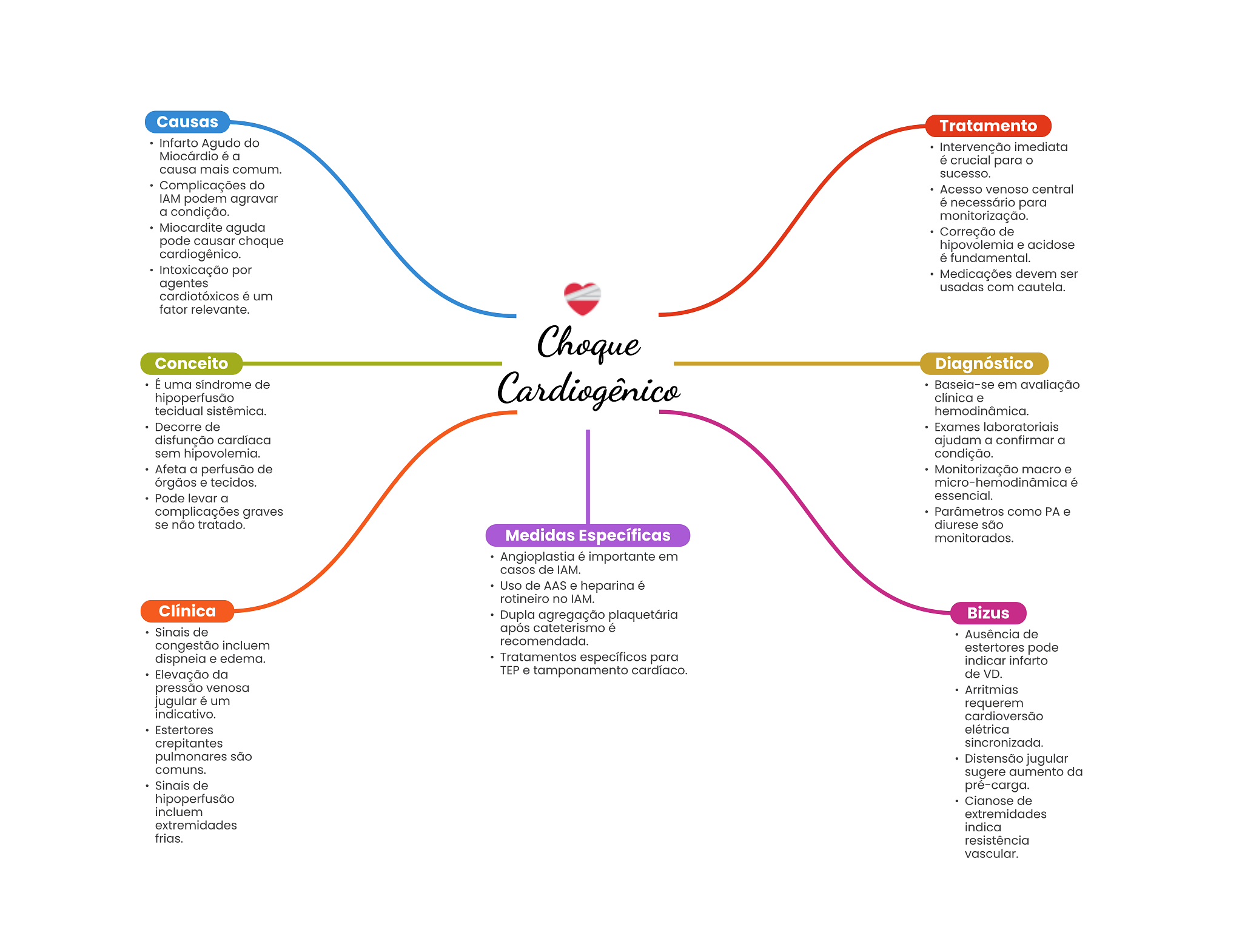 Causas Tratamento Infarto Agudo do Intervenção imediata Miocárdio é a é crucial para O causa mais comum. sucesso. Complicações do Acesso venoso central IAM podem agravar é necessário para a condição. monitorização. Miocardite aguda Correção de pode causar choque hipovolemia e acidose cardiogênico. é fundamental. Intoxicação por Medicações devem ser agentes usadas com cautela. cardiotóxicos é um fator relevante. Choque Conceito Diagnóstico É uma síndrome de hipoperfusão Cardiogênico Baseia-se em avaliação clínica e tecidual sistêmica. hemodinâmica. Decorre de Exames laboratoriais disfunção cardíaca ajudam a confirmar a sem hipovolemia. condição. Afeta a perfusão de Monitorização macro e órgãos e tecidos. é Pode levar a essencial. complicações graves Parâmetros como PA e se não tratado. diurese são Medidas Específicas monitorados. Angioplastia é importante em casos de IAM. Uso de AAS e heparina é rotineiro no IAM. Clínica Dupla agregação plaquetária Bizus Sinais de após cateterismo é Ausência de congestão incluem recomendada. estertores pode dispneia e edema. Tratamentos específicos para indicar infarto Elevação da TEP e tamponamento cardíaco. de VD. pressão venosa Arritmias jugular é um requerem indicativo. cardioversão Estertores elétrica crepitantes sincronizada. pulmonares são Distensão jugular comuns. sugere aumento da Sinais de pré-carga. hipoperfusão Cianose de incluem extremidades extremidades indica frias. resistência vascular.