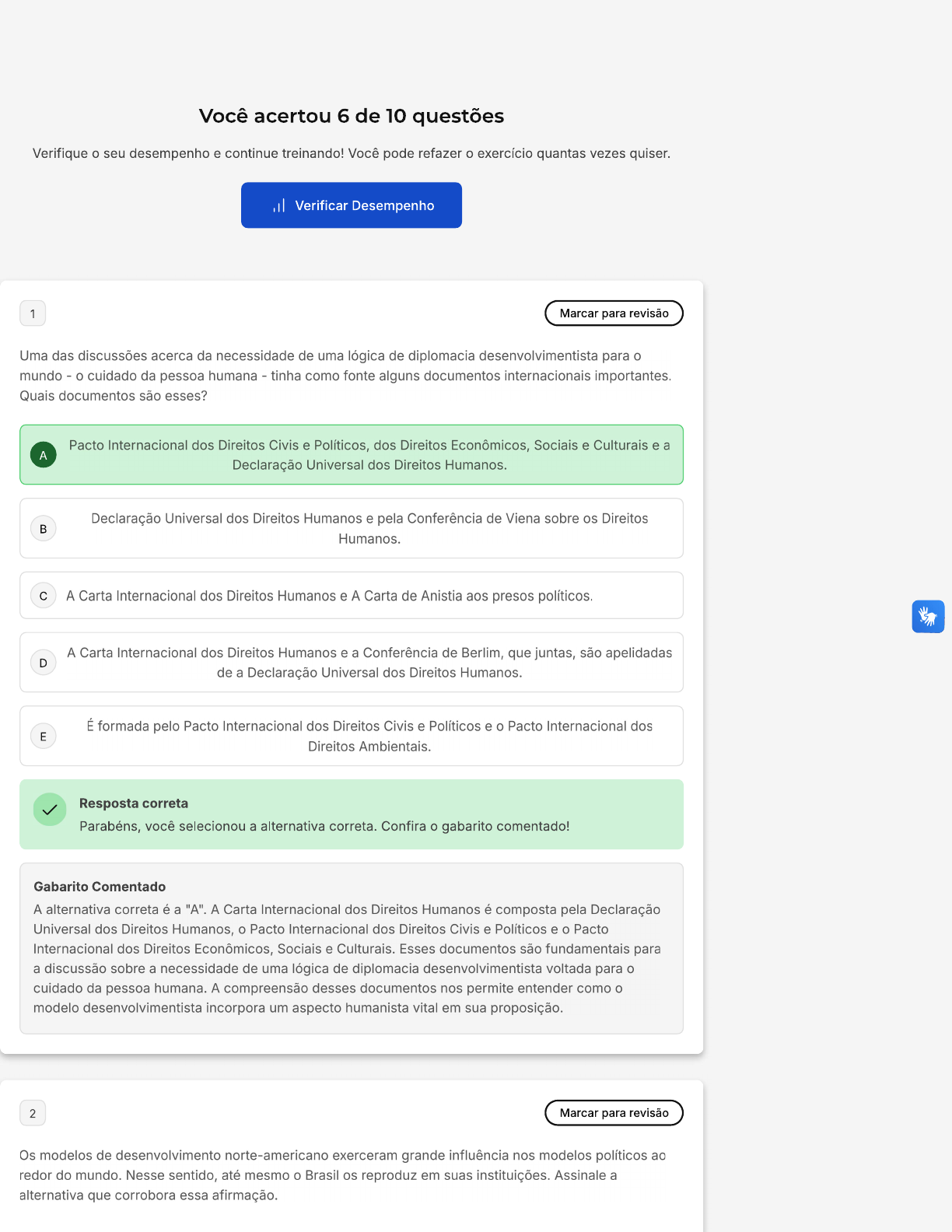 Você acertou 6 de 10 questões Verifique o seu desempenho e continue treinando! Você pode refazer o exercício quantas vezes quiser. Verificar Desempenho 1 Marcar para revisão Uma das discussões acerca da necessidade de uma lógica de diplomacia desenvolvimentista para mundo o cuidado da pessoa humana tinha como fonte alguns documentos internacionais importantes. Quais documentos são esses? Pacto Internacional dos Direitos Civis e Políticos, dos Direitos Econômicos, Sociais e Culturais e a A Declaração Universal dos Direitos Humanos. Declaração Universal dos Direitos Humanos e pela Conferência de Viena sobre os Direitos B Humanos. c A Carta Internacional dos Direitos Humanos e A Carta de Anistia aos presos políticos. A Carta Internacional dos Direitos Humanos e a Conferência de Berlim, que juntas, são apelidadas D de a Declaração Universal dos Direitos Humanos. É formada pelo Pacto Internacional dos Direitos Civis e Políticos e o Pacto Internacional dos E Direitos Ambientais. Resposta correta Parabéns, você selecionou a alternativa correta. Confira gabarito comentado! Gabarito Comentado A alternativa correta é a "A". A Carta Internacional dos Direitos Humanos é composta pela Declaração Universal dos Direitos Humanos, o Pacto Internacional dos Direitos Civis e Políticos e Pacto Internacional dos Direitos Econômicos, Sociais e Culturais. Esses documentos são fundamentais para a discussão sobre a necessidade de uma lógica de diplomacia desenvolvimentista voltada para o cuidado da pessoa humana. A compreensão desses documentos nos permite entender como o modelo desenvolvimentista incorpora um aspecto humanista vital em sua proposição. 2 Marcar para revisão Os modelos de desenvolvimento norte-americano exerceram grande influência nos modelos políticos ao redor do mundo. Nesse sentido, até mesmo o Brasil os reproduz em suas instituições. Assinale a alternativa que corrobora essa afirmação.Entidades industriais brasileiras, como a FIESP e a CNI, refletem pensamento A cepalino. A CEPAL era apoiada por partidos políticos de esquerda, de viés comunista, por ter sido criada com apoio da União Soviética e esteve no golpe, salvo pela Revolução de 1964. Baseada no consenso de Washington, que defendia a liberalização econômica e o livre mercado, c a CEPAL marcou a grande abertura alfandegária do Brasil. Entidades de classe do comércio no Brasil, como a CNC e a Fecomércio, sofreram influência D cepalina. desenvolvimentismo norte-americano fundamenta as políticas econômicas propostas do E Governo Militar. X Resposta incorreta Opa! A alternativa correta é a letra Confira gabarito comentado! Gabarito Comentado A alternativa correta é a letra pensamento desenvolvimentista cepalino, que é uma referência ao modelo de desenvolvimento econômico proposto pela Comissão Econômica para a América Latina e o Caribe (CEPAL), encontrou ressonância no Brasil, especialmente entre as representações da indústria nacional. Isso pode ser observado na Federação das Indústrias do Estado de São Paulo (FIESP) e na Confederação Nacional da Indústria (CNI), que são entidades industriais brasileiras que refletem esse pensamento. Além disso, o governo de Getúlio Vargas também adotou medidas alinhadas a esse modelo de desenvolvimento. 3 Marcar para revisão A Comissão Econômica para a América Latina e o Caribe integra a Organização das Nações Unidas e foi responsável por promover um pensamento denominado cepalino. Sobre os desdobramentos no Brasil do pensamento cepalino, identifique a alternativa correta. desenvolvimentismo cepalino encontrou eco entre as entidades industriais brasileiras, como a A FIESP e a CNI. A CEPAL era apoiada por partidos políticos de esquerda, de viés comunista, por ter sido criada B com apoio da União Soviética. A ideologia cepalina era baseada no consenso de Washington, que defendia a liberalização c econômica e livre mercado. desenvolvimentismo cepalino encontrou eco entre as entidades de classe do comércio no D Brasil, como a CNC e a Fecomércio. Getúlio Vargas foi radicalmente contrário às políticas econômicas propostas pelo pensamento E cepalino.Resposta correta Parabéns, você selecionou a alternativa correta. Confira gabarito comentado! Gabarito Comentado pensamento desenvolvimentista cepalino encontrou eco no Brasil entre as representações da indústria nacional e pelo governo, mais precisamente pela Federação das Indústrias de São Paulo, pela Confederação Nacional da Indústria e pelo governo de Getúlio Vargas. 4 Marcar para revisão (IADES/2022 Adaptada) A respeito da industrialização no Brasil na primeira metade do século 20 e do processo de substituição de importações, que marca nossa organização diplomática em termos de comércio exterior, julgue (C ou E) os item a seguir. () Antes de 1945, o capital norte-americano não teve participação nos investimentos diretos voltados ao processo de industrialização brasileiro. () A industrialização brasileira desenvolveu-se de forma autônoma e por conta disso não se relacionou a nossa dinâmica diplomática. () De um país agrário exportador até estabelecimento de um modelo desenvolvimentista, o Brasil teve uma importante dependência do capital externo. A c D E Resposta correta Parabéns, você selecionou a alternativa correta. Confira gabarito comentado! Gabarito Comentado A nossa dependência, apesar de dinâmicas nacionalistas, tem relação com a transferência de tecnologias. Em razão disso, os EUA influenciam desde a Primeira Guerra e o Estado atual ainda depende dessa relação. 5 Marcar para revisão (IADES/2022 Adaptada) A execução da política monetária tem sido influenciada, nas últimas décadas, por novas visões quanto à política inflacionária e ao controle inflacionário. Este dado é uma contradição à tradição desenvolvimentista. Existe relação entre diplomacia e as posições econômicas dos país