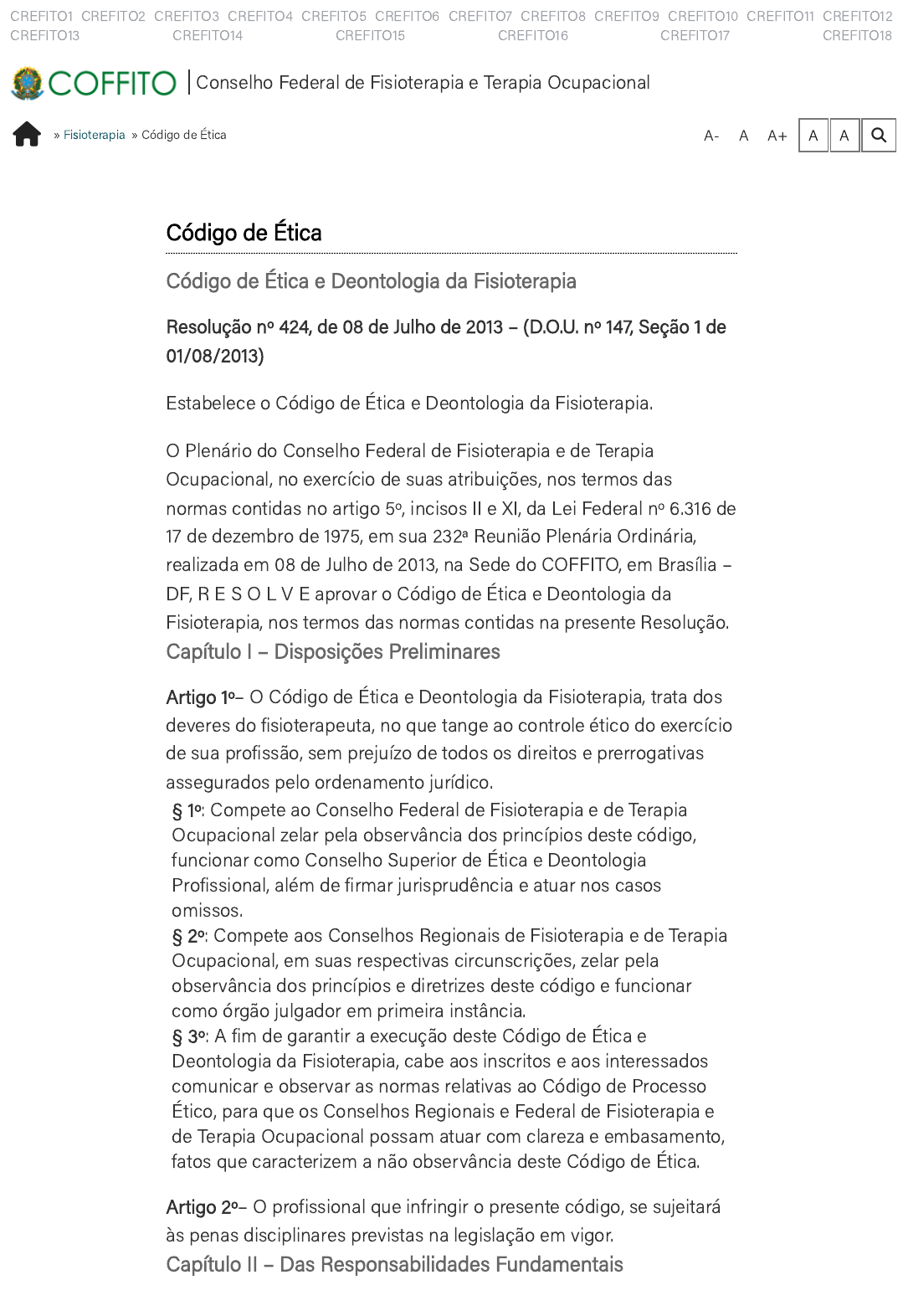 06/02/2024, 23:29 Conselho Federal de Fisioterapia e Terapia Ocupacional - COFFITO https://www.coffito.gov.br/nsite/?page_id=2346 1/13 CREFITO1 CREFITO2 CREFITO3 CREFITO4 CREFITO5 CREFITO6 CREFITO7 CREFITO8 CREFITO9 CREFITO10 CREFITO11 CREFITO12 CREFITO13 CREFITO14 CREFITO15 CREFITO16 CREFITO17 CREFITO18 Conselho Federal de Fisioterapia e Terapia Ocupacional » Fisioterapia » Código de Ética A- A A+ A A Código de Ética Código de Ética e Deontologia da Fisioterapia Resolução nº 424, de 08 de Julho de 2013 – (D.O.U. nº 147, Seção 1 de 01/08/2013) Estabelece o Código de Ética e Deontologia da Fisioterapia. O Plenário do Conselho Federal de Fisioterapia e de Terapia Ocupacional, no exercício de suas atribuições, nos termos das normas contidas no artigo 5º, incisos II e XI, da Lei Federal nº 6.316 de 17 de dezembro de 1975, em sua 232ª Reunião Plenária Ordinária, realizada em 08 de Julho de 2013, na Sede do COFFITO, em Brasília – DF, R E S O L V E aprovar o Código de Ética e Deontologia da Fisioterapia, nos termos das normas contidas na presente Resolução. Capítulo I – Disposições Preliminares Artigo 1º– O Código de Ética e Deontologia da Fisioterapia, trata dos deveres do fisioterapeuta, no que tange ao controle ético do exercício de sua profissão, sem prejuízo de todos os direitos e prerrogativas assegurados pelo ordenamento jurídico. § 1º: Compete ao Conselho Federal de Fisioterapia e de Terapia Ocupacional zelar pela observância dos princípios deste código, funcionar como Conselho Superior de Ética e Deontologia Profissional, além de firmar jurisprudência e atuar nos casos omissos. § 2º: Compete aos Conselhos Regionais de Fisioterapia e de Terapia Ocupacional, em suas respectivas circunscrições, zelar pela observância dos princípios e diretrizes deste código e funcionar como órgão julgador em primeira instância. § 3º: A fim de garantir a execução deste Código de Ética e Deontologia da Fisioterapia, cabe aos inscritos e aos interessados comunicar e observar as normas relativas ao Código de Processo Ético, para que os Conselhos Regionais e Federal de Fisioterapia e de Terapia Ocupacional possam atuar com clareza e embasamento, fatos que caracterizem a não observância deste Código de Ética. Artigo 2º– O profissional que infringir o presente código, se sujeitará às penas disciplinares previstas na legislação em vigor. Capítulo II – Das Responsabilidades Fundamentais https://www.crefito1.org.br/ https://crefito2.gov.br/ http://www.crefito3.org.br/ https://crefito4.org.br/site/ https://crefito5.org.br/ https://www.crefito6.org.br/ https://crefito7.gov.br/ https://www.crefito8.gov.br/ https://crefito9.com.br/ https://crefito10.org.br/portal/ https://crefito11.gov.br/ https://crefito12.org.br/ https://www.crefito13.org.br/ https://www.crefito14.org.br/ https://www.crefito15.org.br/ http://crefito16.gov.br/ https://crefito17.org.br/ https://crefito18.org.br/ https://www.coffito.gov.br/nsite/ https://www.coffito.gov.br/nsite https://www.coffito.gov.br/nsite/?page_id=2339 06/02/2024, 23:29 Conselho Federal de Fisioterapia e Terapia Ocupacional - COFFITO https://www.coffito.gov.br/nsite/?page_id=2346 2/13 Artigo 3º – Para o exercício profissional da Fisioterapia é obrigatória a inscrição no Conselho Regional da circunscrição em que atuar na forma da legislação em vigor, mantendo obrigatoriamente seus dados cadastrais atualizados junto ao sistema COFFITO/CREFITOS. § 1º: O fisioterapeuta deve portar sua identificação profissional sempre que em exercício. § 2º: A atualização cadastral deve ocorrer minimamente a cada ano, respeitadas as regras específicas quanto ao recadastramento nacional. Artigo 4º– O fisioterapeuta presta assistência ao ser humano, tanto no plano individual quanto coletivo, participando da promoção da saúde, prevenção de agravos, tratamento e recuperação da sua saúde e cuidados paliativos, sempre tendo em vista a qualidade de vida, sem discriminação de qualquer forma ou pretexto, segundo os princípios do sistema de saúde vigente no Brasil. Artigo 5º – O fisioterapeuta avalia sua capacidade técnica e somente aceita atribuição ou assume encargo quando capaz de desempenho seguro para o cliente/paciente/usuário, em respeito aos direitos humanos. § Único: No exercício de sua atividade profissional o fisioterapeuta deve observar as normatizações e recomendações relativas à capacitação e à titulação emanadas pelo Conselho Federal de Fisioterapia e de Terapia Ocupacional. Artigo 6º– O fisioterapeuta protege o cliente/paciente/usuário e a instituição/programa em que trabalha contra danos decorrentes de imperícia, negligência ou imprudência por parte de qualquer membro da equipe de saúde, advertindo o profissional faltoso. § Único: Se necessário, representa à chefia imediata, à instituição, ao Conselho Regional de Fisioterapia e de Terapia Ocupacional e/ou outros órgãos competentes, a fim de que sejam tomadas as medidas cabíveis para salvaguardar a saúde, a participação social, o conforto e a intimidade do cliente/paciente/usuário e das famílias ou a reputação profissional dos membros da equipe. Artigo 7º – O fisioterapeuta deve comunicar à chefia imediata da instituição em que trabalha ou à autoridade competente, fato que tenha conhecimento que seja tipificado como crime, contravenção ou infração ética. Artigo 8º – O fisioterapeuta deve se atualizar e aperfeiçoar seus conhecimentos técnicos, científicos e culturais, amparando-se nos princípios da beneficência e da não maleficência, no desenvolvimento de sua profissão, inserindo-se em programas de educação continuada e de educação permanente. 06/02/2024, 23:29 Conselho Federal de Fisioterapia e Terapia Ocupacional - COFFITO https://www.coffito.gov.br/nsite/?page_id=2346 3/13 Artigo 9º – Constituem-se deveres fundamentais do fisioterapeuta, seg