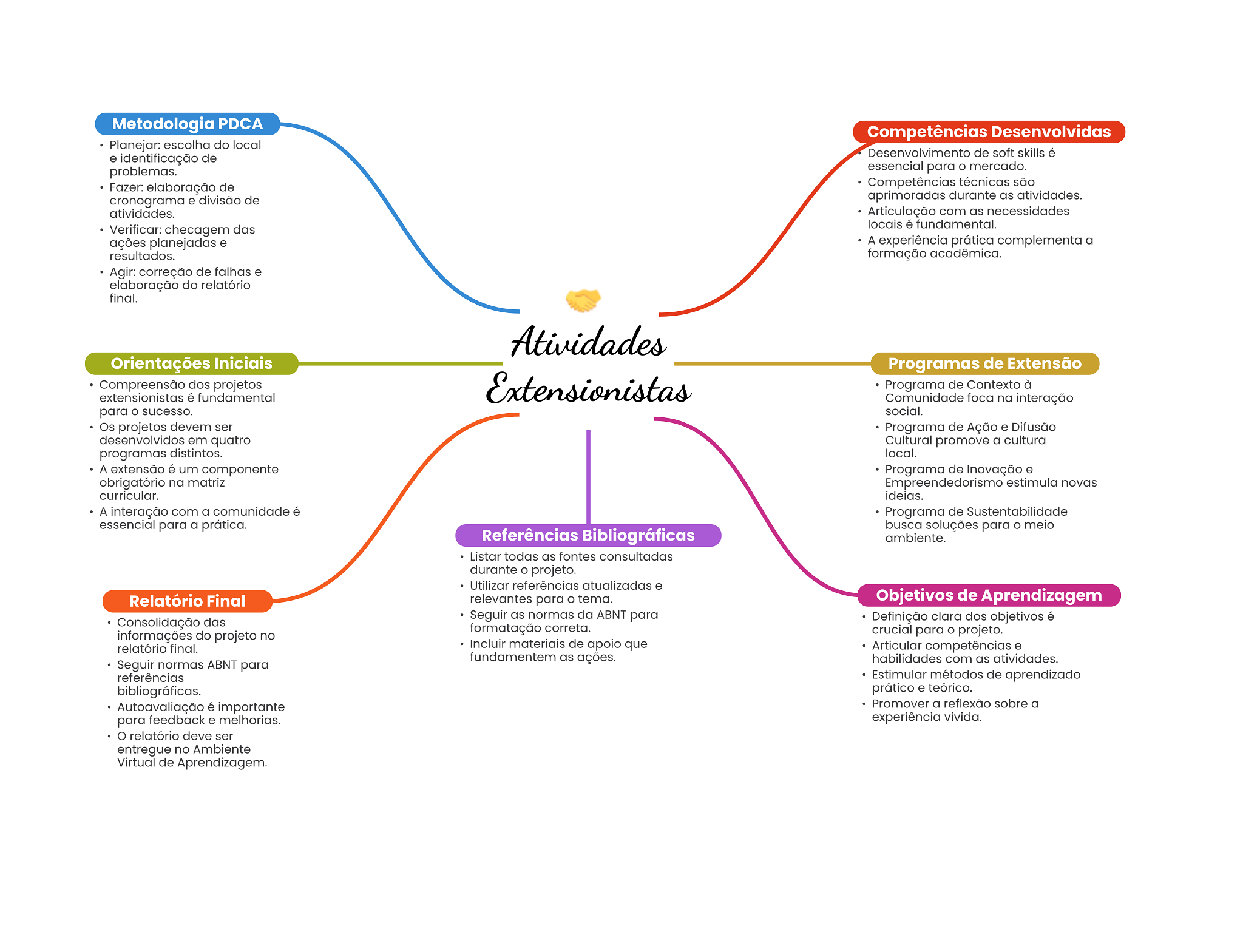 Metodologia PDCA Competências Desenvolvidas Planejar: escolha do local e identificação de de soft skills é problemas. essencial para O mercado. Fazer: elaboração de Competências técnicas são cronograma e divisão de aprimoradas durante as atividades. atividades. Articulação com as necessidades locais é fundamental. Verificar: checagem das ações planejadas e A experiência prática complementa a resultados. formação acadêmica. Agir: correção de falhas e elaboração do relatório final. Atividades Orientações Iniciais Programas de Extensão Compreensão dos projetos Extensionistas Programa de Contexto à extensionistas é fundamental Comunidade foca na interação para sucesso. social. Os projetos devem ser Programa de Ação e Difusão desenvolvidos em quatro Cultural promove a cultura programas distintos. local. A extensão é um componente Programa de Inovação e obrigatório na matriz Empreendedorismo estimula novas curricular. ideias. A interação com a comunidade é Programa de Sustentabilidade essencial para a prática. busca soluções para O meio Referências Bibliográficas ambiente. Listar todas as fontes consultadas durante O projeto. Utilizar referências atualizadas e Relatório Final relevantes para O tema. Objetivos de Aprendizagem Seguir as normas da ABNT para Consolidação das Definição clara dos objetivos é formatação correta. informações do projeto no crucial para projeto. relatório final. Incluir materiais de apoio que Articular competências e fundamentem as ações. habilidades com as atividades. Seguir normas ABNT para referências Estimular métodos de aprendizado bibliográficas. prático e teórico. Autoavaliação é importante Promover a reflexão sobre a para feedback e melhorias. experiência vivida. O relatório deve ser entregue no Ambiente Virtual de Aprendizagem.