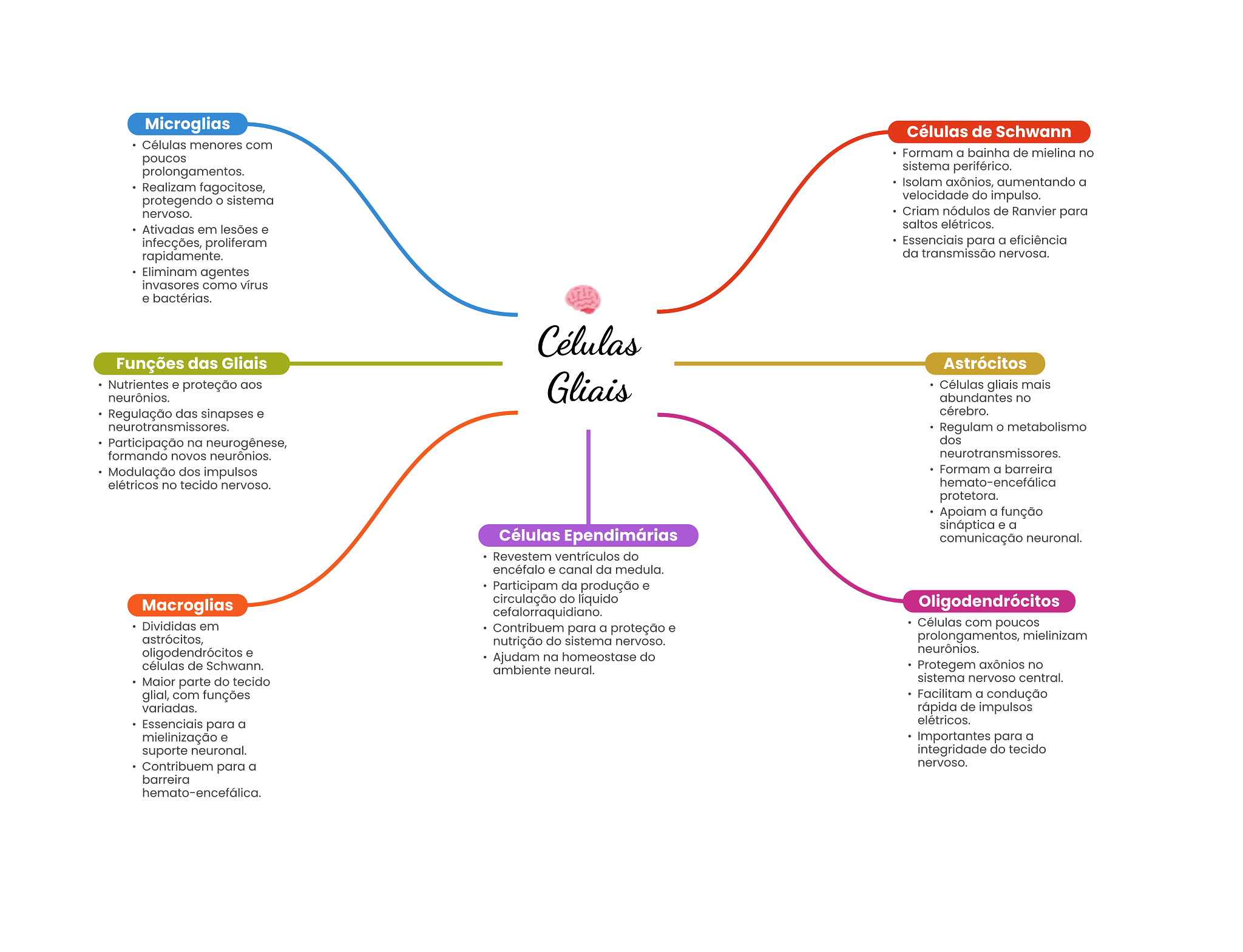 Microglias Células de Schwann Células menores com Formam a bainha de mielina no poucos prolongamentos. sistema periférico. Realizam fagocitose, Isolam axônios, aumentando a protegendo sistema velocidade do impulso. nervoso. Criam nódulos de Ranvier para Ativadas em lesões e saltos elétricos. infecções, proliferam Essenciais para a eficiência rapidamente. da transmissão nervosa. Eliminam agentes invasores como vírus e bactérias. Células Funções das Gliais Astrócitos Nutrientes e proteção aos Gliais Células mais neurônios. abundantes no Regulação das sinapses e cérebro. neurotransmissores. Regulam O metabolismo Participação na neurogênese, dos formando novos neurônios. neurotransmissores. Modulação dos impulsos Formam a barreira elétricos no tecido nervoso. hemato-encefálica protetora. Apoiam a função sináptica e a Células Ependimárias comunicação neuronal. Revestem ventrículos do encéfalo e canal da medula. Participam da produção e Macroglias circulação do líquido Oligodendrócitos cefalorraquidiano. Divididas em Contribuem para a proteção e Células com poucos astrócitos, nutrição do sistema nervoso. prolongamentos, mielinizam oligodendrócitos e neurônios. Ajudam na homeostase do células de Schwann. ambiente neural. Protegem axônios no Maior parte do tecido sistema nervoso central. glial, com funções Facilitam a condução variadas. rápida de impulsos Essenciais para a elétricos. mielinização e Importantes para a suporte neuronal. integridade do tecido Contribuem para a nervoso. barreira hemato-encefálica.