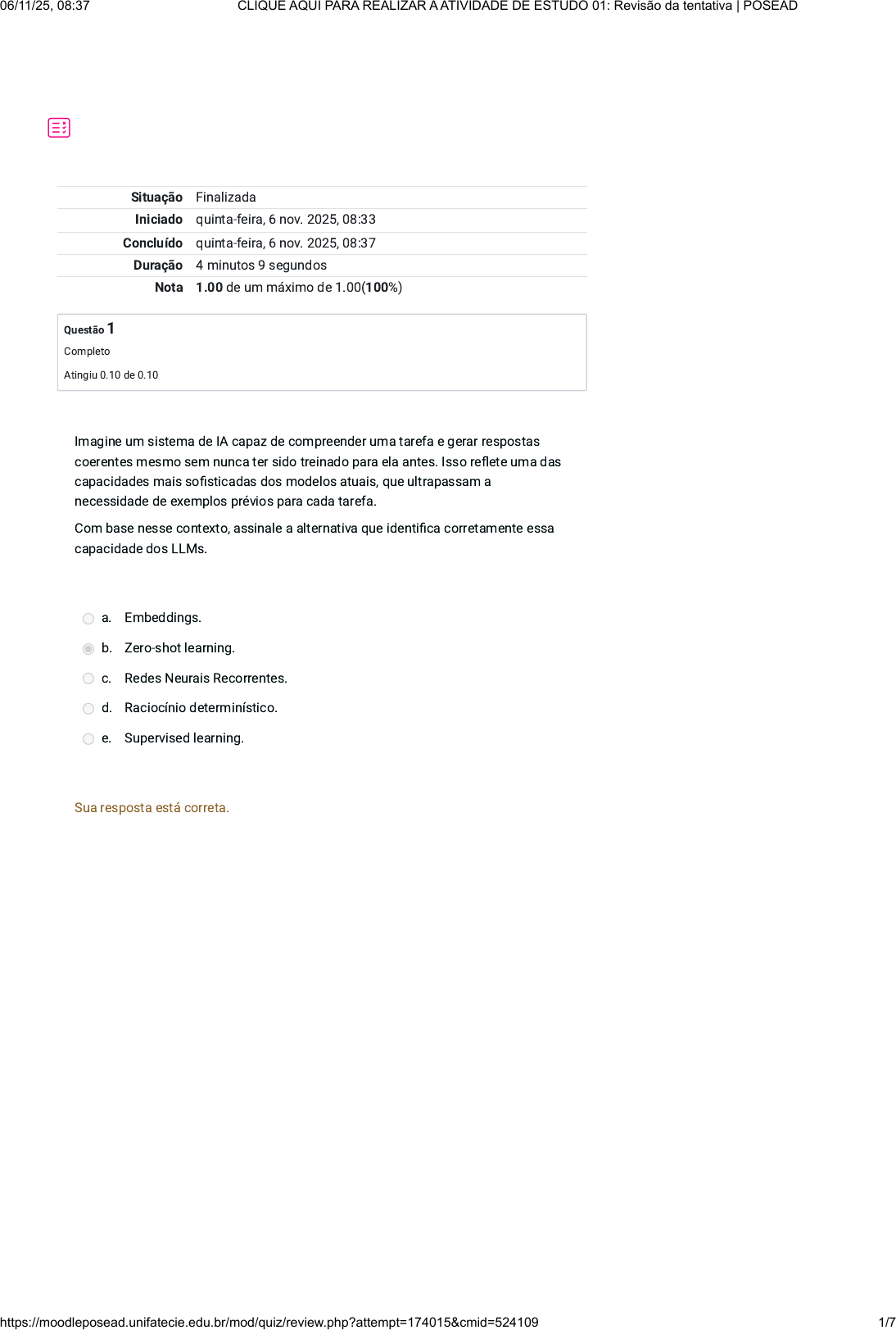 Situação Finalizada Iniciado quinta-feira, 6 nov. 2025, 08:33 Concluído quinta-feira, 6 nov. 2025, 08:37 Duração 4 minutos 9 segundos Nota 1.00 de um máximo de 1.00(100%) Questão 1 Completo Atingiu 0.10 de 0.10 Imagine um sistema de IA capaz de compreender uma tarefa e gerar respostas coerentes mesmo sem nunca ter sido treinado para ela antes. Isso reflete uma das capacidades mais sofisticadas dos modelos atuais, que ultrapassam a necessidade de exemplos prévios para cada tarefa. Com base nesse contexto, assinale a alternativa que identifica corretamente essa capacidade dos LLMs. a. Embeddings. b. Zero-shot learning. c. Redes Neurais Recorrentes. d. Raciocínio determinístico. e. Supervised learning. Sua resposta está correta. 06/11/25, 08:37 CLIQUE AQUI PARA REALIZAR A ATIVIDADE DE ESTUDO 01: Revisão da tentativa | POSEAD https://moodleposead.unifatecie.edu.br/mod/quiz/review.php?attempt=174015&cmid=524109 1/7 Questão 2 Completo Atingiu 0.10 de 0.10 Questão 3 Completo Atingiu 0.10 de 0.10 As redes neurais são parte essencial do funcionamento dos LLMs, imitando o funcionamento do cérebro humano para processar informações e gerar respostas coerentes. Analise se Verdadeiro (V) ou Falso (F): ( ) As redes neurais funcionam de forma determinística, sem qualquer adaptação. ( ) Cada nó da rede neural é comparável a um neurônio artificial. ( ) A arquitetura Transformer é uma forma avançada de rede neural. ( ) As redes neurais aprendem ajustando pesos internos com base em erros. ( ) Apenas imagens e vídeos podem ser processados por redes neurais. Assinale a alternativa correta: a. V-V-V-V-V. b. F-F-F-F-F. c. F-V-F-V-F. d. V-F-V-F-V. e. F-V-V-V-F. Sua resposta está correta. Durante o treinamento de um modelo de linguagem, como o GPT, uma das técnicas utilizadas é fazer com que o modelo tente prever a próxima palavra em uma frase com base em contexto anterior. Isso permite que ele aprenda padrões da linguagem humana. Com base nessa informação, qual é o nome dado a esse tipo de técnica? Assinale a alternativa correta: a. Geração por reforço. b. Embedding supervisionado. c. Aprendizado generativo profundo. d. Tokenização semântica. e. Predição de token. Sua resposta está correta. 06/11/25, 08:37 CLIQUE AQUI PARA REALIZAR A ATIVIDADE DE ESTUDO 01: Revisão da tentativa | POSEAD https://moodleposead.unifatecie.edu.br/mod/quiz/review.php?attempt=174015&cmid=524109 2/7 Questão 4 Completo Atingiu 0.10 de 0.10 A introdução da computação cognitiva nos sistemas de IA representa um passo decisivo para que as máquinas se tornem mais adaptativas e inteligentes, permitindo que se aproximem do raciocínio humano. Com isso, os sistemas cognitivos passaram a apresentar respostas mais complexas, baseadas em inferências e hipóteses. Com base nesse contexto, analise as asserções a seguir: I. A computação cognitiva permite que a IA compreenda o contexto, reconheça padrões e produza respostas mais humanas. PORQUE II. Os sistemas cognitivos são baseados exclusivamente em regras fixas e instruções determinísticas. Assinale a opção correta: a. A asserção I é uma proposição verdadeira e a II é uma proposição falsa. b. As asserções I e II são proposições falsas. c. A asserção I é uma proposição falsa e a II é uma proposição verdadeira. d. As asserções I e II são proposições verdadeiras e a II é uma justificativa correta da I. e. As asserções I e II são proposições verdadeiras, mas a II não é uma justificativa correta da I. Sua resposta está correta. 06/11/25, 08:37 CLIQUE AQUI PARA REALIZAR A ATIVIDADE DE ESTUDO 01: Revisão da tentativa | POSEAD https://moodleposead.unifatecie.edu.br/mod/quiz/review.php?attempt=174015&cmid=524109 3/7 Questão 5 Completo Atingiu 0.10 de 0.10 Questão 6 Completo Atingiu 0.10 de 0.10 Os modelos de linguagem, como o ChatGPT, são capazes de adaptar suas respostas conforme o estilo de linguagem do usuário, utilizando o histórico da conversa para manter a coerência. Essa habilidade está relacionada principalmente a qual característica? Assinale a alternativa correta: a. Memória de curto prazo. b. Contexto conversacional. c. Representação semântica vetorial. d. Aprendizado supervisionado. e. Capacidade de tokenização. Sua resposta está correta. O crescimento exponencial de dados não estruturados gerou desafios significativos para empresas e desenvolvedores. Os LLMs surgem como solução tecnológica para interpretar, classificar e gerar conteúdo a partir desses dados. Analise as afirmações abaixo: I - A maioria dos dados produzidos atualmente é estruturada. II - Os LLMs conseguem lidar com textos, imagens, áudios e outros dados não estruturados. III - A interpretação semântica é essencial para transformar dados não estruturados em conhecimento. IV - Sem IA, seria praticamente inviável extrair valor de grandes volumes de dados não estruturados. Assinale a alternativa correta: a. I, II, III e IV estão corretas. b. Apenas I e IV estão corretas. c. Apenas II, III e IV estão corretas. d. Apenas I está correta. e. Apenas II e III estão corretas. Sua resposta está correta. 06/11/25, 08:37 CLIQUE AQUI PARA REALIZAR A ATIVIDADE DE ESTUDO 01: Revisão da tentativa | POSEAD https://moodleposead.unifatecie.edu.br/mod/quiz/review.php?attempt=174015&cmid=524109 4/7 Questão 7 Completo Atingiu 0.10 de 0.10 As grandes empresas têm adotado o uso da computação em nuvem para treinar e hospedar modelos de linguagem, dada a necessidade de alto poder de processamento e armazenamento. Com base nesse contexto, assinale qual das opções representa uma das principais vantagens da nuvem para os LLMs. Assinale a alternativa correta: a. Conexão com bancos de dados exclusivamente estruturados. b. Armazenamento limitado e processamento local. c. Infraestrutura compartilhada entre usuários, mas com baixa escalabilidade. d. Treinamento manual de redes neurais sem paralelismo. e. Acesso a GPUs e