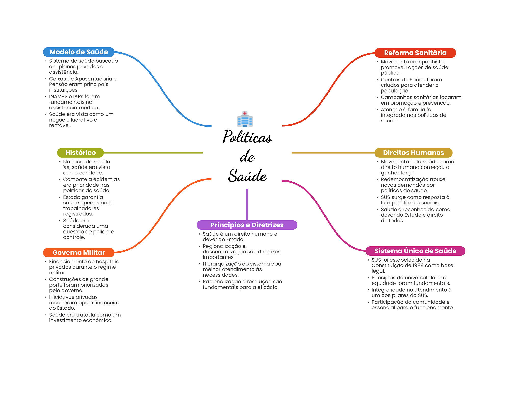 Modelo de Saúde Reforma Sanitária Sistema de saúde baseado Movimento campanhista em planos privados e promoveu ações de saúde assistência. pública. Caixas de Aposentadoria e Centros de Saúde foram Pensão eram principais criados para atender a instituições. população. INAMPS e IAPs foram Campanhas sanitárias focaram fundamentais na em promoção e prevenção. assistência médica. Atenção à família foi Saúde era vista como um integrada nas políticas de negócio lucrativo e saúde. rentável. Histórico de Direitos Humanos No início do século Movimento pela saúde como XX, saúde era vista direito humano começou a como caridade. Combate a epidemias Saúde ganhar força. Redemocratização trouxe era prioridade nas novas demandas por políticas de saúde. políticas de saúde. Estado garantia SUS surge como resposta à saúde apenas para luta por direitos sociais. trabalhadores Saúde é reconhecida como registrados. dever do Estado e direito Saúde era de todos. considerada uma Princípios e Diretrizes questão de polícia e Saúde é um direito humano e controle. dever do Estado. Regionalização e Governo Militar descentralização são diretrizes Sistema Único de Saúde importantes. Financiamento de hospitais SUS foi estabelecido na Hierarquização do sistema visa privados durante regime Constituição de 1988 como base melhor atendimento às militar. legal. necessidades. Construções de grande Princípios de universalidade e Racionalização e resolução são porte foram priorizadas equidade foram fundamentais. fundamentais para a eficácia. pelo governo. Integralidade no atendimento é Iniciativas privadas um dos pilares do SUS. receberam apoio financeiro Participação da comunidade é do Estado. essencial para O funcionamento. Saúde era tratada como um investimento econômico.