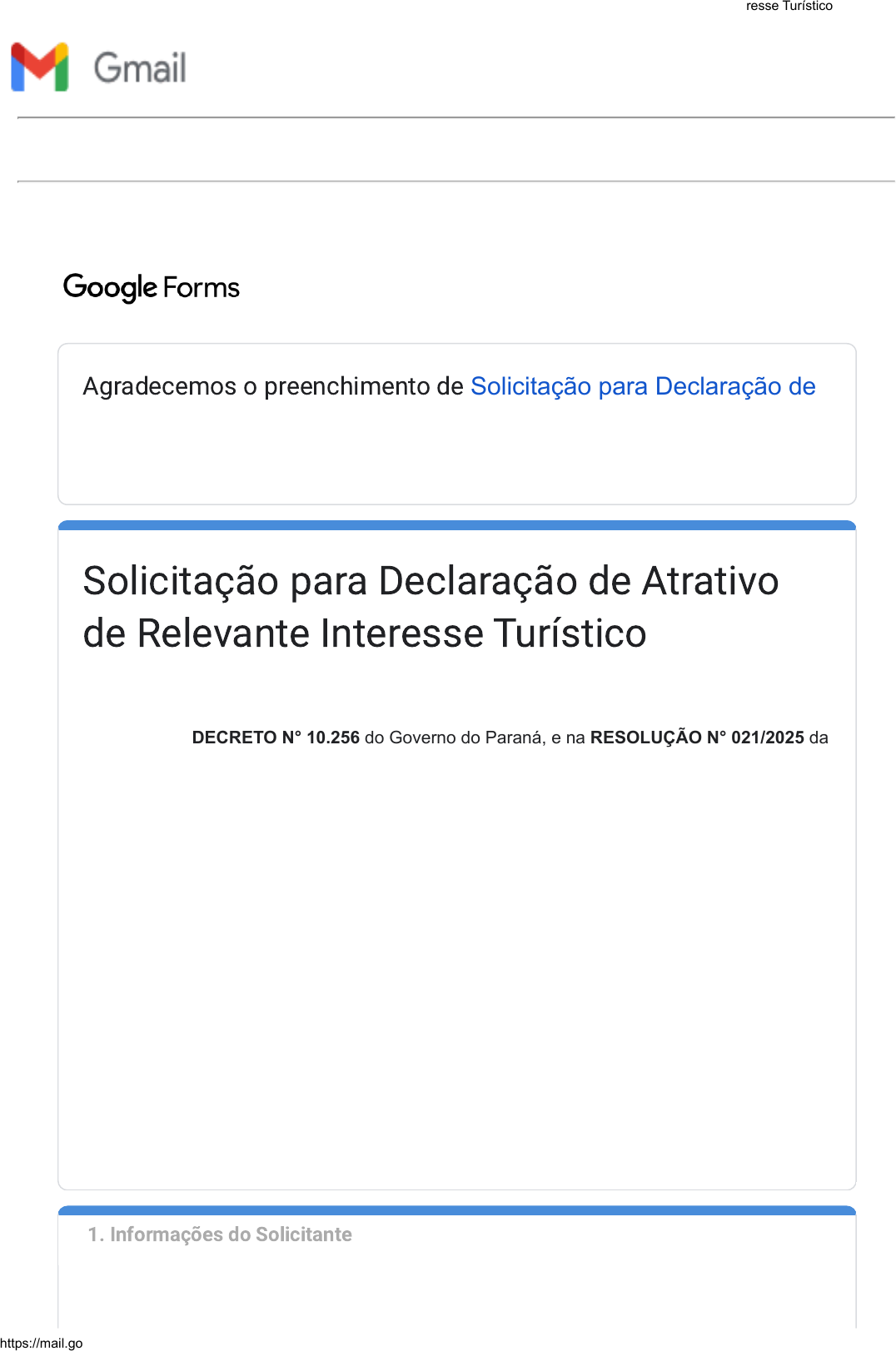 Jr Baggio Solicitação para Declaração de Atrativo de Relevante Interesse Turístico 1 mensagem Formulários Google 24 de setembro de 2025 às 12:53 Para: baggio@azapping.com.br Agradecemos o preenchimento de Solicitação para Declaração de Atrativo de Relevante Interesse Turístico Veja as respostas enviadas. Solicitação para Declaração de Atrativo de Relevante Interesse Turístico Prezado(a) Gestor(a) Com base no DECRETO N° 10.256 do Governo do Paraná, e na RESOLUÇÃO N° 021/2025 da Secretaria de Estado do Turismo, esse formulário, elaborado pela mesma, é a forma que o Governo do Estado encontrou para certificar atrativos, rotas turísticas, eventos estaduais, acessos e equipamentos de apoio ao turismo como de Atrativo Relevante Interesse Turístico para nosso Estado. O objetivo é fomentar o desevolvimento do turismo, de forma responsável, nas mais diversas partes do estado, com auxílio e colaboração de todos os entes envolvidos. As informações técnicas e de identificação do elemento a requerer a Declaração de Atrativo de Relevante Interesse Turístico serão utilizadas para avaliar e conceder, ou não, a declaração, sendo essa uma atribuição da SETU. Cientes de que os dados preenchidos são verdadeiros e condizentes com a realidade, estamos empenhados em avaliá-los e conceder a todos os requerentes aptos sua devida declaração. Contamos com seu apoio no desenvolvimento e promoção de um turismo responsável no Paraná! Seu e-mail (baggio@azapping.com.br) foi registrado quando você enviou este formulário. 1. Informações do Solicitante 24/09/2025, 12:53 E-mail de azapping.com.br - Solicitação para Declaração de Atrativo de Relevante Interesse Turístico https://mail.google.com/mail/u/0/?ik=69ad302084&view=pt&search=all&permthid=thread-f:1844161246642747399&simpl=msg-f:184416124664… 1/13 https://docs.google.com/forms/d/e/1FAIpQLSfe7N8rjq4i27OqkqwwXegoyNCUgyWMbHZUe0ENWqgb2DEsxg/viewform?usp=mail_form_link https://docs.google.com/forms/d/e/1FAIpQLSfe7N8rjq4i27OqkqwwXegoyNCUgyWMbHZUe0ENWqgb2DEsxg/viewform?usp=mail_form_link https://docs.google.com/forms/d/e/1FAIpQLSfe7N8rjq4i27OqkqwwXegoyNCUgyWMbHZUe0ENWqgb2DEsxg/viewform?usp=mail_form_link mailto:baggio@azapping.com.br Nesta seção, objetiva-se apenas a coleta das informações básicas sobre o responsável pela solicitação e a organização a qual representa, além de seu CNPJ e outras informações de contato. Nome Completo do responsável pela solicitação: * Cassio Lotti Nome da Entidade/Organização/Instituição: * Recanto Silvestre CNPJ: * 054.525.208/0001-53 Telefone de contato: * (46) 99973-8887 E-mail: * cassiolotti@gmail.com Endereço: * Linha Borges, Distrito de São Roque do Chopim, SN, Zona Rural, Pato Branco, PR Plus Code: WCJ5+59 Pato Branco, Paraná Município/UF: * Pato Branco, PR Seu município está presente no Mapa do Turismo? * consulte aqui: https://www.mapa.turismo.gov.br/mapa/init.html#/home 24/09/2025, 12:53 E-mail de azapping.com.br - Solicitação para Declaração de Atrativo de Relevante Interesse Turístico https://mail.google.com/mail/u/0/?ik=69ad302084&view=pt&search=all&permthid=thread-f:1844161246642747399&simpl=msg-f:184416124664… 2/13 mailto:cassiolotti@gmail.com https://www.mapa.turismo.gov.br/mapa/init.html#/home https://www.mapa.turismo.gov.br/mapa/init.html#/home Sim Não Seu elemento possui o Cadastro de pessoas Físicas e Jurídicas que atuam no Setor de Turismo no Brasil (CADASTUR)? * Sim Não Caso sim, anexe o comprovante: Arquivos enviados RecantoSilvestre_Cadastur - Jr Baggio.pdf 2. Classificação do Elemento Proposto Esta seção busca saber a respeito do elemento a ser declarado, bem como de suas caractéristicas básicas. Você quer solicitar a declaração de Relevante Interesse Turístico para: * Atrativo Turístico Acesso (estradas, vias de ligação) Rota Turística Equipamento de Apoio (hospedagem, alimentação, transporte, agências, centro de informações Eventos Seu elemento é de caracterísica: * Urbana Natural 24/09/2025, 12:53 E-mail de azapping.com.br - Solicitação para Declaração de Atrativo de Relevante Interesse Turístico https://mail.google.com/mail/u/0/?ik=69ad302084&view=pt&search=all&permthid=thread-f:1844161246642747399&simpl=msg-f:184416124664… 3/13 Ambas 3. Identificação do Elemento Proposto A proposta da Seção de Identificação do Elemento busca não somente identificar as informações básicas, como nome e localização, mas também questões mais aprofundadas, a fim de compreender as capacidades e a realidade do objeto a ser certificado. Nome do Elemento * Recanto Silvestre/Cachoeira da Alemoa Localização (endereço) * Linha Borges, Distrito de São Roque do Chopim, SN, Zona Rural, Pato Branco, PR Plus Code: WCJ5+59 Pato Branco, Paraná Em sua avaliação, de qual segmento do turismo seu elemento faz parte? * ✓ Cultural ✓ Ecoturismo Religioso ✓ Lazer e Entretenimento ✓ Rural Naútico Aventura ✓ Sol e Praia Negócios e Eventos Técnico e Científico Gastronômico Turismo de Base Comunitária (TBC) 24/09/2025, 12:53 E-mail de azapping.com.br - Solicitação para Declaração de Atrativo de Relevante Interesse Turístico https://mail.google.com/mail/u/0/?ik=69ad302084&view=pt&search=all&permthid=thread-f:1844161246642747399&simpl=msg-f:184416124664… 4/13 Esportes Saúde Descrição breve e resumida * O Recanto Silvestre é uma área de lazer em Pato Branco, PR localizado à margem esquerda do Rio Chopim, divisa com Coronel Vivida, na margem direita. Está a 26,2 km do centro da cidade pela BR-158 sendo os últimos 5,7 km em estrada municipal cascalhada. O grande e espetacular atrativo do Recanto é a Cachoeira da Alemoa, famosa queda d’água do Rio Chopim. Nesse local, o rio alarga seu leito e dá lugar a um degrau que varia entre 4 e 6 metros de altura despejando toda sua água em uma extensão de 190 metros entre os dois municípios. Acima da queda está um barramento em lâmina d’