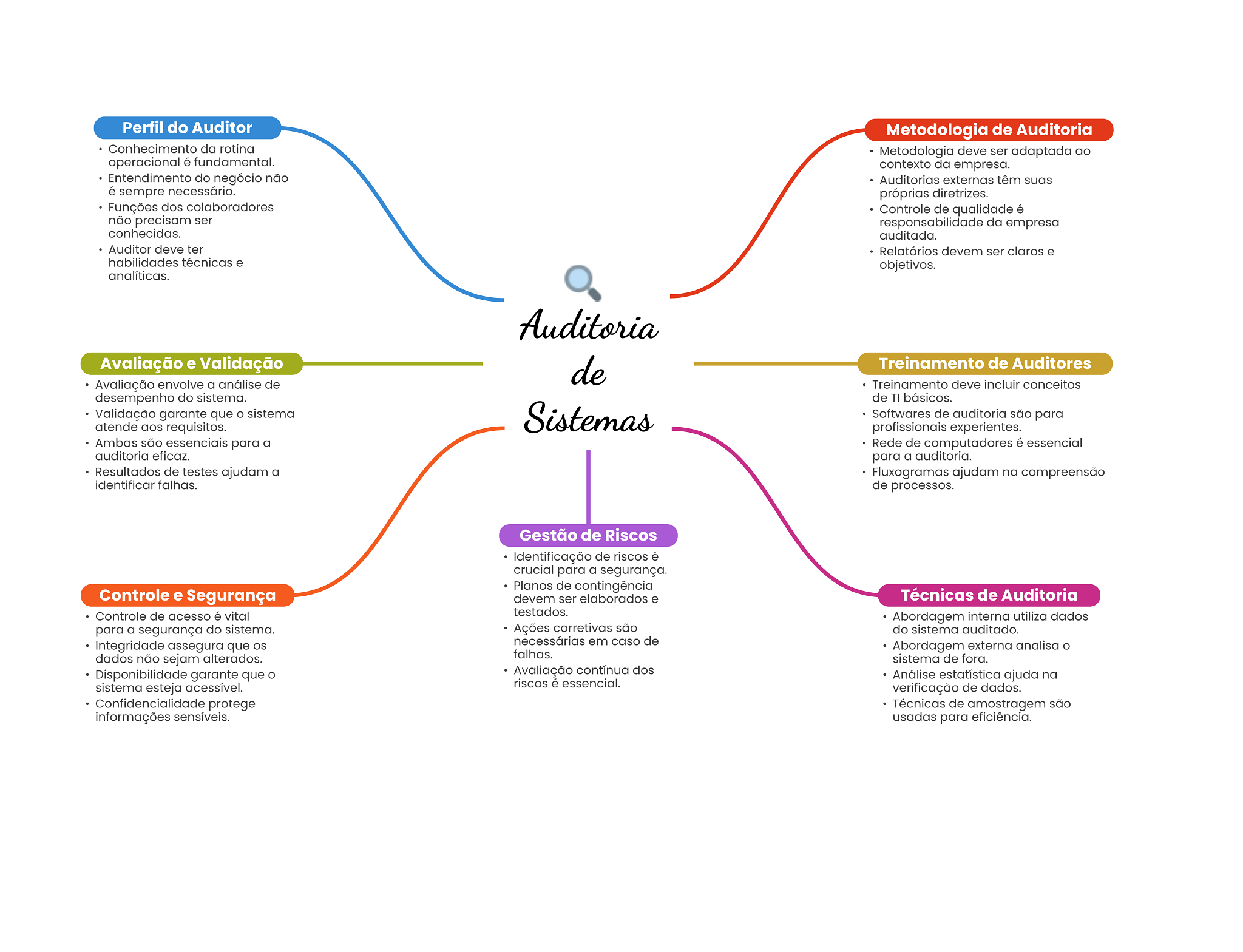 Perfil do Auditor Metodologia de Auditoria Conhecimento da rotina Metodologia deve ser adaptada ao operacional é fundamental. contexto da empresa. Entendimento do negócio não Auditorias externas têm suas é sempre necessário. próprias diretrizes. Funções dos colaboradores Controle de qualidade é não precisam ser responsabilidade da empresa conhecidas. auditada. Auditor deve ter Relatórios devem ser claros e habilidades técnicas e objetivos. analíticas. Auditoria Avaliação e Validação de Treinamento de Auditores Avaliação envolve a análise de Treinamento deve incluir conceitos desempenho do sistema. de TI básicos. Validação garante que O sistema Sistemas Softwares de auditoria são para atende aos requisitos. profissionais experientes. Ambas são essenciais para a Rede de computadores é essencial auditoria eficaz. para a auditoria. Resultados de testes ajudam a Fluxogramas ajudam na compreensão identificar falhas. de processos. Gestão de Riscos Identificação de riscos é crucial para a segurança. Planos de contingência Controle e Segurança devem ser elaborados e Técnicas de Auditoria Controle de acesso é vital testados. Abordagem interna utiliza dados para a segurança do sistema. Ações corretivas são do sistema auditado. Integridade assegura que necessárias em caso de Abordagem externa analisa dados não sejam alterados. falhas. sistema de fora. Disponibilidade garante que Avaliação contínua dos Análise estatística ajuda na sistema esteja acessível. riscos é essencial. verificação de dados. Confidencialidade protege Técnicas de amostragem são informações sensíveis. usadas para eficiência.