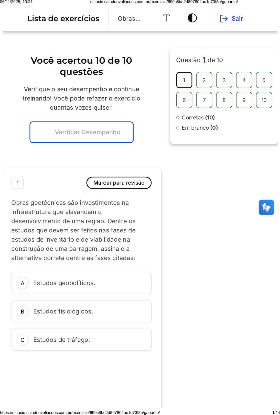 Você acertou 10 de 10 questões Verifique o seu desempenho e continue treinando! Você pode refazer o exercício quantas vezes quiser. Verificar Desempenho A B C 1 Marcar para revisão Obras geotécnicas são investimentos na infraestrutura que alavancam o desenvolvimento de uma região. Dentre os estudos que devem ser feitos nas fases de estudos de inventário e de viabilidade na construção de uma barragem, assinale a alternativa correta dentre as fases citadas: Estudos geopolíticos. Estudos fisiológicos. Estudos de tráfego. Questão 1 de 10 Corretas (10) Em branco (0) 1 2 3 4 5 6 7 8 9 10 Lista de exercícios Obras… Sair 06/11/2025, 10:21 estacio.saladeavaliacoes.com.br/exercicio/690c8be2d897804ac1e73f8e/gabarito/ https://estacio.saladeavaliacoes.com.br/exercicio/690c8be2d897804ac1e73f8e/gabarito/ 1/14 D E A B Estudos topográficos. Estudos tipográficos. Resposta correta Parabéns, você selecionou a alternativa correta. Confira o gabarito comentado! Gabarito Comentado Os estudos topográficos são essenciais nas fases de estudos de inventário e de viabilidade na construção de uma barragem. Esses estudos permitem identificar os locais mais favoráveis ao longo de cursos de rios, sob o ponto de vista topográfico, geológico e hidrográfico, para a implantação das obras da barragem e de suas obras auxiliares. Portanto, a alternativa correta é a "D", que menciona os estudos topográficos. 2 Marcar para revisão Obras geotécnicas são investimentos na infraestrutura que alavancam o desenvolvimento de uma região. A barragem de Itaipu é um exemplo típico de uma barragem de: Enrocamento Rejeito 06/11/2025, 10:21 estacio.saladeavaliacoes.com.br/exercicio/690c8be2d897804ac1e73f8e/gabarito/ https://estacio.saladeavaliacoes.com.br/exercicio/690c8be2d897804ac1e73f8e/gabarito/ 2/14 C D E Terra Contraforte Em arco Resposta correta Parabéns, você selecionou a alternativa correta. Confira o gabarito comentado! Gabarito Comentado A barragem de Itaipu é um exemplo de uma barragem de contraforte. As barragens de contraforte possuem uma característica marcante: a subpressão fica muito reduzida devido à menor área da base. Além disso, o peso da água sobre o paramento inclinado de montante praticamente elimina o tombamento. No entanto, em contrapartida, os esforços de compressão sob os contrafortes aumentam. Devido ao seu menor peso, essas barragens são mais sensíveis a problemas de deslizamento. Portanto, a alternativa correta é a letra D, que indica que a barragem de Itaipu é uma barragem de contraforte. 3 Marcar para revisão Obras geotécnicas são investimentos na infraestrutura que alavancam o desenvolvimento de uma região. A construção de túneis é um avanço que encurta distâncias, 06/11/2025, 10:21 estacio.saladeavaliacoes.com.br/exercicio/690c8be2d897804ac1e73f8e/gabarito/ https://estacio.saladeavaliacoes.com.br/exercicio/690c8be2d897804ac1e73f8e/gabarito/ 3/14 A B C D E dando passagem direta através de certos obstáculos, que podem ser elevações, rios, canais e áreas densamente povoadas. É um método de escavação para um túnel em solo: Escavação total. Escoramento parcial. Escavação com galerias. Ancoragem ativa sobre rocha circunvizinha. Escoramentos por meio de paredes de estacas metálicas. Resposta correta Parabéns, você selecionou a alternativa correta. Confira o gabarito comentado! Gabarito Comentado O método de escavação para um túnel em solo que é apresentado na alternativa E, "Escoramentos por meio de paredes de estacas metálicas", é o correto. Este método é utilizado quando o solo é mole, ou seja, quando não é composto por rochas ou outros materiais duros. As demais alternativas, embora sejam métodos de escavação, são mais adequadas para solos duros, como rochas, por exemplo. Portanto, a alternativa E é a 06/11/2025, 10:21 estacio.saladeavaliacoes.com.br/exercicio/690c8be2d897804ac1e73f8e/gabarito/ https://estacio.saladeavaliacoes.com.br/exercicio/690c8be2d897804ac1e73f8e/gabarito/ 4/14 A B C D E única que apresenta um método de escavação adequado para solos moles. 4 Marcar para revisão Obras geotécnicas são investimentos na infraestrutura que alavancam o desenvolvimento de uma região. No caso ferroviário, a distância b mostrada na figura abaixo é chamada de: Fonte: YDUQS - Estácio - 2021. Dormente Bitola Base Lastro Trilha Resposta correta Parabéns, você selecionou a alternativa correta. Confira o gabarito comentado! 06/11/2025, 10:21 estacio.saladeavaliacoes.com.br/exercicio/690c8be2d897804ac1e73f8e/gabarito/ https://estacio.saladeavaliacoes.com.br/exercicio/690c8be2d897804ac1e73f8e/gabarito/ 5/14 A B C Gabarito Comentado Gabarito: Bitola. Justificativa: Bitola é a distância que os trilhos devem ter, para se manterem paralelos e retos, de forma a estarem sempre adequados à distância entre as rodas das composições dos trens. Essa distância é chamada de bitola, e é medido entre as faces internas do boleto. 5 Marcar para revisão Obras geotécnicas são investimentos na infraestrutura que alavancam o desenvolvimento de uma região. A construção de túneis é um avanço que encurta distâncias, dando passagem direta através de certos obstáculos, que podem ser elevações, rios, canais e áreas densamente povoadas. No método de escavação com galerias: Toda a frente do túnel é perfurada e dinamitada. Há o avanço da parte superior do túnel, sempre adiante da parte inferior. Abre-se um túnel menor, chamado de galeria, antes de escavação total da frente. 06/11/2025, 10:21 estacio.saladeavaliacoes.com.br/exercicio/690c8be2d897804ac1e73f8e/gabarito/ https://estacio.saladeavaliacoes.com.br/exercicio/690c8be2d897804ac1e73f8e/gabarito/ 6/14 D E Obedece-se a seguinte sequência: escavação manual e mecanizada, escoramento das paredes, concretagem do túnel e reaterro. São escavadas seções com cerca de 5 m de comprimento até a profundidade onde deverá ficar a base do túnel. Resposta cor