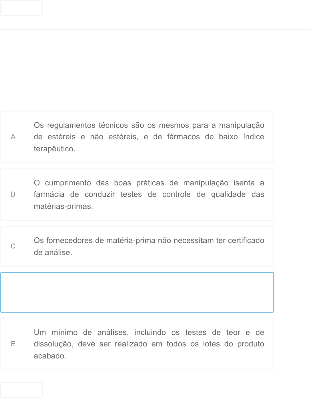Questão 1 Selecione a resposta: D Algumas análises do controle de qualidade, em função de sua complexidade, podem ser terceirizadas. A RDC nº 67/2007 e sua atualização (RDC nº 87/2008) regulamenta as Boas práticas de manipulação de preparações magistrais e oficinais para uso humano em farmácias. Sobre o conteúdo dessas publicações, assinale a alternativa correta. A Os regulamentos técnicos são os mesmos para a manipulação de estéreis e não estéreis, e de fármacos de baixo índice terapêutico. B O cumprimento das boas práticas de manipulação isenta a farmácia de conduzir testes de controle de qualidade das matérias-primas. C Os fornecedores de matéria-prima não necessitam ter certificado de análise. E Um mínimo de análises, incluindo os testes de teor e de dissolução, deve ser realizado em todos os lotes do produto acabado. Questão 2 04/11/2025, 11:08 :: Plataforma A https://graduacaocruzeirodosul.grupoa.education/plataforma/course/3342467/content/60174132 1/5 Selecione a resposta: A As Boas práticas de manipulação em farmácia (BPMF). A RDC nº 67/2007 é um regulamento técnico que apresenta os requisitos mínimos exigidos das farmácias que já manipulam ou desejam iniciar atividades de manipulação de preparações magistrais e oficinais. Ademais, para efeito desse regulamento técnico, várias definições são adotadas. Com base nesse regulamento e nas definições contidas nele, complete a lacuna a seguir. ________________________ é/são o conjunto de medidas que visam a assegurar que os produtos manipulados sejam manipulados e controlados com padrões de qualidade. B A técnica farmacotécnica. C O controle de qualidade. D A assistência farmacêutica. E A atenção farmacêutica. Questão 3 Selecione a resposta: As preparações magistrais no Brasil devem respeitar as diretrizes da RDC nº 67/2007 e as complementações sugeridas na RDC nº 87/2008. Acerca dessas diretrizes relacionadas aos testes de controle de qualidade, assinale a alternativa correta. 04/11/2025, 11:08 :: Plataforma A https://graduacaocruzeirodosul.grupoa.education/plataforma/course/3342467/content/60174132 2/5 D No caso de o fornecedor não ser qualificado pela farmácia, os ensaios de controle de qualidade poderão ser executados por laboratórios de controle de qualidade terceirizados, sob responsabilidade da farmácia. A Os ensaios de controle de qualidade mínimos requeridos para as preparações semissólidas magistrais e oficinais são: descrição, aspecto, caracteres organolépticos, volume e peso médio. B Os ensaios de controle de qualidade mínimos requeridos para as preparações sólidas magistrais e oficinais são: descrição, aspecto, caracteres organolépticos, pH e peso médio. C Entre os ensaios de controle de qualidade mínimos requeridos para as matérias-primas, estão: descrição, aspecto, caracteres organolépticos, peso médio e pH. E Em caso de terceirização de análises de controle de qualidade, não é necessário um contrato entre a empresa realizadora dos ensaios e a farmácia de manipulação. Questão 4 Pela RDC nº 67/2007, todas as farmácias com manipulação devem garantir a qualidade físico-químico-microbiológica da sua água potável. Esse será o ponto de partida para a obtenção da água estéril (água para injetáveis), a ser utilizada em todas as preparações farmacêuticas estéreis. Quais são os métodos de esterilização que a farmácia poderá utilizar na preparação da água estéril? 04/11/2025, 11:08 :: Plataforma A https://graduacaocruzeirodosul.grupoa.education/plataforma/course/3342467/content/60174132 3/5 Selecione a resposta: E Destilação e osmose reversa. A Filtração e abrandamento. B Centrifugação e decantação. C Troca iônica e floculação. D Cloração e fluoretação. Questão 5 Selecione a resposta: A RDC nº 67, de 8 de outubro de 2007, no Anexo III, trata das Boas práticas de manipulação de hormônios, antibióticos, citostáticos e substâncias sujeitas a controle especial. Sobre a manipulação de medicamentos dessas classes farmacêuticas, assinale a alternativa correta. A Se uma farmácia de manipulação decide manipular antibióticos, citostáticos e substâncias sujeitas a controle especial, ela não deve se preocupar com os requisitos exigidos no Anexo I da RDC nº 67/2007, e sim apenas com os requisitos exigidos pelo Anexo III. B 04/11/2025, 11:08 :: Plataforma A https://graduacaocruzeirodosul.grupoa.education/plataforma/course/3342467/content/60174132 4/5 C Os sistemas de ar das salas/laboratórios onde serão manipuladas essas classes farmacêuticas devem ser independentes e de eficiência certificada. Também é necessário que a pressão das salas seja negativa em relação às salas próximas. Para manipulação de hormônios, antibióticos, citostáticos e substâncias sujeitas a controle especial, a farmácia não precisa dispor de salas de manipulação exclusivas para tal. D Para o monitoramento do processo de manipulação de formas farmacêuticas, o estabelecimento deve analisar, no mínimo, duas amostras a cada seis meses de uma das classes terapêuticas elencadas: antibióticos, hormônios e citostáticos. E Não é necessário o registro do arquivamento e dos resultados das análises de controle de qualidade dos fármacos pertencentes a classes terapêuticas: antibióticos, hormônios e citostáticos. 04/11/2025, 11:08 :: Plataforma A https://graduacaocruzeirodosul.grupoa.education/plataforma/course/3342467/content/60174132 5/5