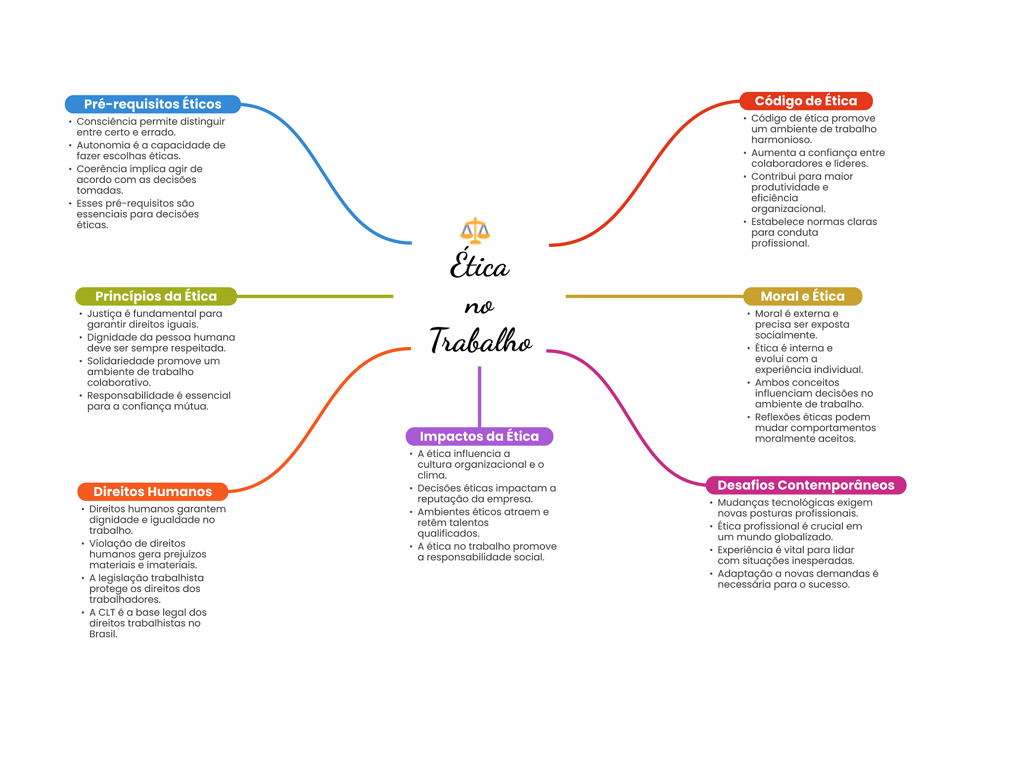 Pré-requisitos Éticos Código de Ética Consciência permite distinguir Código de ética promove entre certo e errado. um ambiente de trabalho harmonioso. Autonomia é a capacidade de fazer escolhas éticas. Aumenta a confiança entre colaboradores e líderes. Coerência implica agir de acordo com as decisões Contribui para maior tomadas. produtividade e eficiência Esses pré-requisitos são essenciais para decisões organizacional. éticas. Estabelece normas claras para conduta profissional. Ética Princípios da Ética Moral e Ética no Justiça é fundamental para Moral é externa e garantir direitos iguais. precisa ser exposta Dignidade da pessoa humana Trabalho socialmente. deve ser sempre respeitada. Ética é interna e Solidariedade promove um evolui com a ambiente de trabalho experiência individual. colaborativo. Ambos conceitos Responsabilidade é essencial influenciam decisões no para a confiança mútua. ambiente de trabalho. Reflexões éticas podem mudar comportamentos Impactos da Ética moralmente aceitos. A ética influencia a cultura organizacional e O clima. Direitos Humanos Decisões éticas impactam a Desafios Contemporâneos reputação da empresa. Mudanças tecnológicas exigem Direitos humanos garantem Ambientes éticos atraem e novas posturas profissionais. dignidade e igualdade no retêm talentos trabalho. Ética profissional é crucial em qualificados. um mundo globalizado. Violação de direitos A ética no trabalho promove humanos gera prejuízos Experiência é vital para lidar a responsabilidade social. materiais e imateriais. com situações inesperadas. A legislação trabalhista Adaptação a novas demandas é protege OS direitos dos necessária para sucesso. trabalhadores. A CLT é a base legal dos direitos trabalhistas no Brasil.