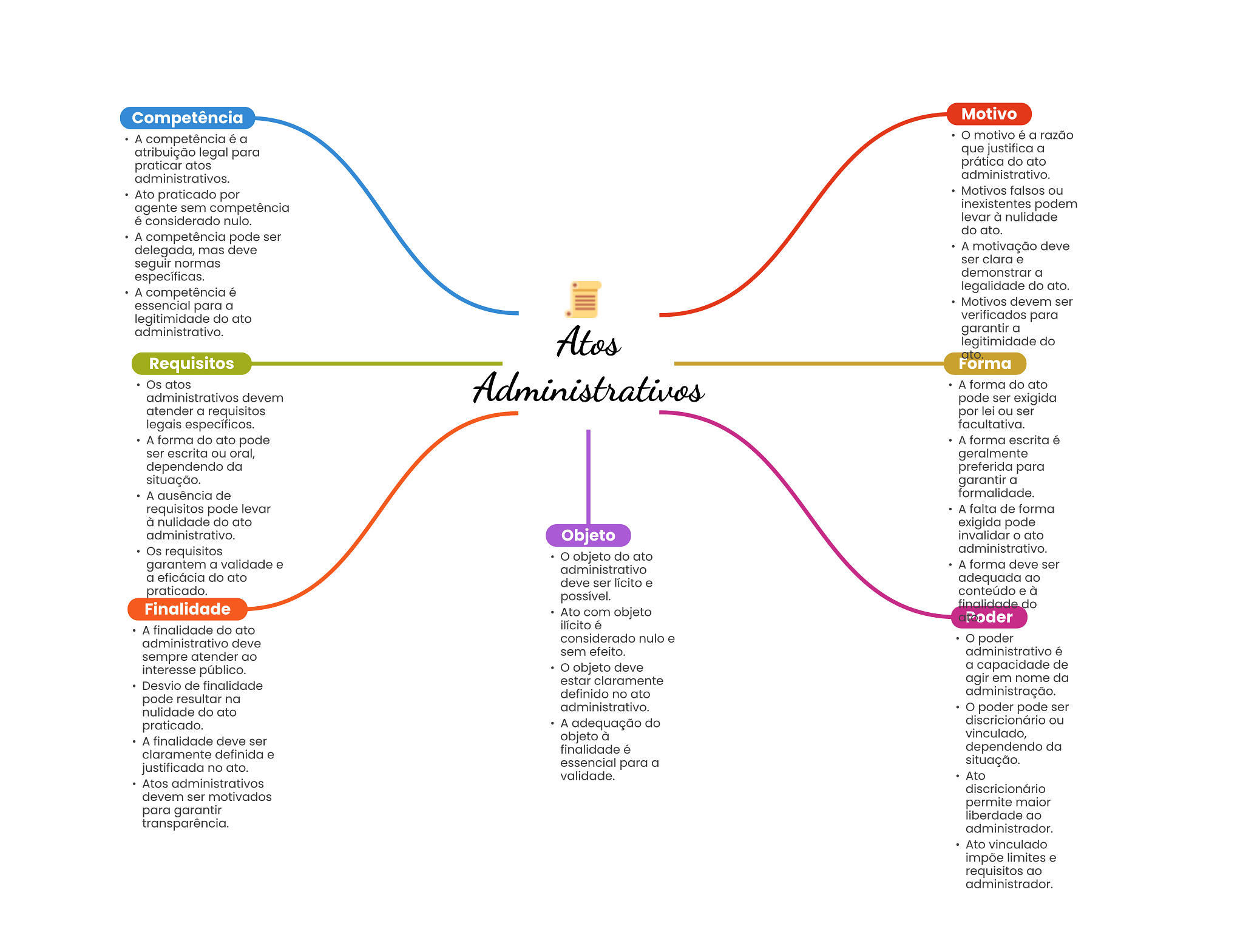 Competência Motivo A competência é a motivo é a razão atribuição legal para que justifica a praticar atos prática do ato administrativos. administrativo. Ato praticado por Motivos falsos ou agente sem competência inexistentes podem é e considerado nulo. levar à nulidade do ato. A competência pode ser delegada, mas deve A motivação deve seguir normas ser clara e específicas. demonstrar a legalidade do ato. A competência é essencial para a Motivos devem ser legitimidade do ato verificados para administrativo. Atos garantir a legitimidade do Requisitos Forma Os atos Administrativos A forma do ato administrativos devem pode ser exigida atender a requisitos por lei ou ser legais específicos. facultativa. A forma do ato pode A forma escrita é ser escrita ou oral, geralmente dependendo da preferida para situação. garantir a A ausência de formalidade. requisitos pode levar A falta de forma à nulidade do ato exigida pode administrativo. Objeto invalidar O ato Os requisitos administrativo. objeto do ato garantem a validade e administrativo A forma deve ser a eficácia do ato deve ser lícito e adequada ao praticado. conteúdo e à possível. Finalidade finalidade do Ato com objeto A finalidade do ato ilícito é administrativo deve considerado nulo e O poder sem efeito. administrativo é sempre atender ao interesse público. objeto deve a capacidade de estar claramente agir em nome da Desvio de finalidade definido no ato administração. pode resultar na nulidade do ato administrativo. O poder pode ser praticado. A adequação do discricionário ou A finalidade deve ser objeto à vinculado, claramente definida e finalidade é dependendo da essencial para a situação. justificada no ato. validade. Ato Atos administrativos discricionário devem ser motivados permite maior para garantir liberdade transparência. administrador. Ato vinculado impõe limites e requisitos ao administrador.