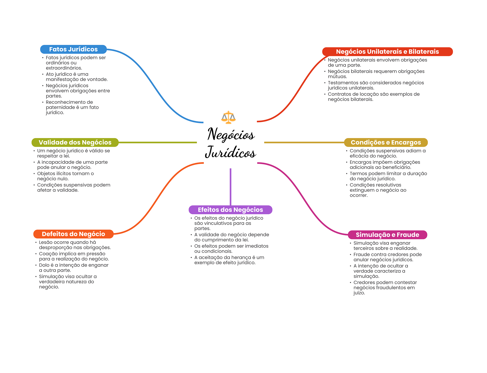 Fatos Jurídicos Negócios Unilaterais e Bilaterais Fatos jurídicos podem ser ordinários ou Negócios unilaterais envolvem obrigações extraordinários. de uma parte. Ato jurídico é uma Negócios bilaterais requerem obrigações mútuas. manifestação de vontade. Negócios jurídicos Testamentos são considerados negócios jurídicos unilaterais. envolvem obrigações entre partes. Contratos de locação são exemplos de Reconhecimento de negócios bilaterais. paternidade é um fato jurídico. Negócios Validade dos Negócios Condições e Encargos Um negócio jurídico é válido se respeitar a lei. Jurídicos Condições suspensivas adiam a eficácia do negócio. A incapacidade de uma parte Encargos impõem obrigações pode anular negócio. adicionais ao beneficiário. Objetos ilícitos tornam O Termos podem limitar a duração negócio nulo. do negócio jurídico. Condições suspensivas podem Condições resolutivas afetar a validade. extinguem negócio ao ocorrer. Efeitos dos Negócios Os efeitos do negócio jurídico são vinculativos para as partes. Defeitos do Negócio A validade do negócio depende Simulação e Fraude Lesão ocorre quando há do cumprimento da lei. Simulação visa enganar desproporção nas obrigações. Os efeitos podem ser imediatos terceiros sobre a realidade. ou condicionais. Coação implica em pressão Fraude contra credores pode para a realização do negócio. A aceitação da herança é um anular negócios jurídicos. Dolo é a intenção de enganar exemplo de efeito jurídico. A intenção de ocultar a a outra parte. verdade caracteriza a Simulação visa ocultar a simulação. verdadeira natureza do Credores podem contestar negócio. negócios fraudulentos em juízo.