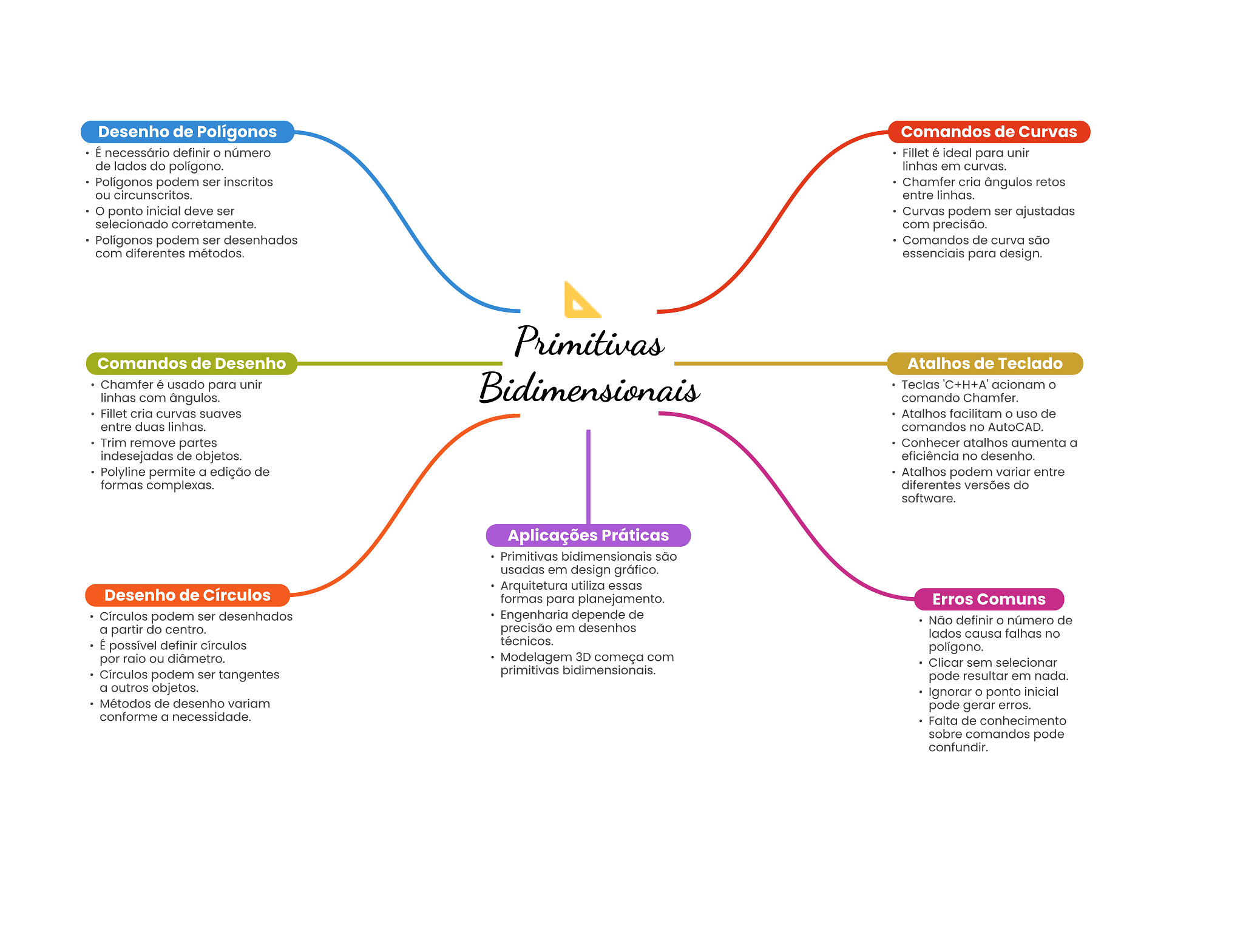 Desenho de Polígonos Comandos de Curvas É necessário definir número Fillet é ideal para unir de lados do polígono. linhas em curvas. Polígonos podem ser inscritos Chamfer cria ângulos retos ou circunscritos. entre linhas. ponto inicial deve ser Curvas podem ser ajustadas selecionado corretamente. com precisão. Polígonos podem ser desenhados Comandos de curva são com diferentes métodos. essenciais para design. Primitivas Comandos de Desenho Atalhos de Teclado Chamfer é usado para unir linhas com ângulos. Bidimensionais Teclas 'C+H+A' acionam comando Chamfer. Fillet cria curvas suaves Atalhos facilitam O uso de entre duas linhas. comandos no AutoCAD. Trim remove partes Conhecer atalhos aumenta a indesejadas de objetos. eficiência no desenho. Polyline permite a edição de Atalhos podem variar entre formas complexas. diferentes versões do software. Aplicações Práticas Primitivas bidimensionais são usadas em design gráfico. Arquitetura utiliza essas Desenho de Círculos formas para planejamento. Erros Comuns Círculos podem ser desenhados Engenharia depende de Não definir O número de a partir do centro. precisão em desenhos lados causa falhas no É possível definir círculos técnicos. polígono. por raio ou diâmetro. Modelagem 3D começa com Clicar sem selecionar Círculos podem ser tangentes primitivas bidimensionais. pode resultar em nada. a outros objetos. Ignorar O ponto inicial Métodos de desenho variam pode gerar erros. conforme a necessidade. Falta de conhecimento sobre comandos pode confundir.