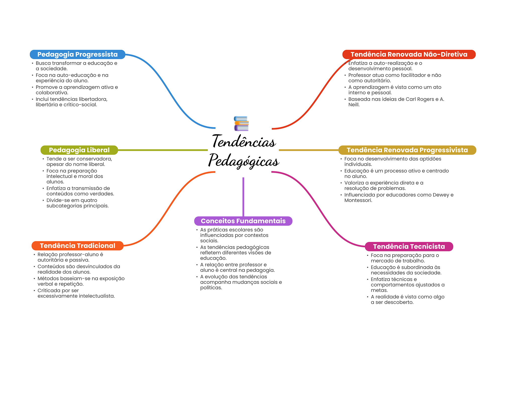 Pedagogia Progressista Tendência Renovada Não-Diretiva Busca transformar a educação e Enfatiza a e a sociedade. desenvolvimento pessoal. Foca na auto-educação e na Professor atua como facilitador e não experiência do aluno. como autoritário. Promove a aprendizagem ativa e A aprendizagem é vista como um ato colaborativa. interno e pessoal. Inclui tendências libertadora, Baseada nas ideias de Carl Rogers e A. libertária e crítico-social. Neill. Tendências Pedagogia Liberal Tendência Renovada Progressivista Tende a ser conservadora, Pedagógicas Foca no desenvolvimento das aptidões apesar do nome liberal. individuais. Foca na preparação Educação é um processo ativo e centrado intelectual e moral dos no aluno. alunos. Valoriza a experiência direta e a Enfatiza a transmissão de resolução de problemas. conteúdos como verdades. Influenciada por educadores como Dewey e Divide-se em quatro Montessori. subcategorias principais. Conceitos Fundamentais As práticas escolares são influenciadas por contextos sociais. Tendência Tradicional As tendências pedagógicas Tendência Tecnicista Relação professor-aluno é refletem diferentes visões de autoritária e passiva. educação. Foca na preparação para mercado de trabalho. Conteúdos são desvinculados da A relação entre professor e realidade dos alunos. aluno é central na pedagogia. Educação é subordinada às necessidades da sociedade. Métodos baseiam-se na exposição A evolução das tendências Enfatiza técnicas e verbal e repetição. acompanha mudanças sociais e políticas. comportamentos ajustados a Criticada por ser metas. excessivamente intelectualista. A realidade é vista como algo a ser descoberto.