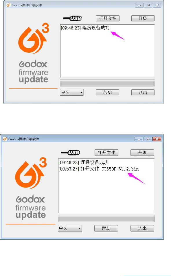 神牛固件升级软件 G3 说明书 打开文件夹里的 Godox G3 应用软件。 1、连接设备 ⑴ 连接升级设备前,请对设备进行放电: ->卸下电池,按开关按键 2秒(没有开关按钮请按引闪按键); ⑵ 通过 USB 线(数据线类型)连接设备和电脑。 2、打开文件 ->请到官网上下载产品固件(型号.bin),点击“打开文件”打开.bin 文件。 3、升级 固件升级软件 G3 和产品固件(.bin)可到 www.godox.com 官网上下载。 Instruction Manual for Godox Firmware Update Software G3 Open the applications in Godox G3. http://www.godox.com 1. Connect the Device (1) Please discharge the device before updating. -> Remove the battery and press the OFF/ON button for 2 seconds (press the test button if do not have OFF/ON button). (2) Connect the device to the computer with an USB connection line(appropriate type). 2. Open the file -> Please download the product firmware (model.bin) on the official website and open it by clicking the “Open File”. 3. Updating Firmware update software G3 and product firmware (.bin) can be downloaded on the official website www.godox.com.
