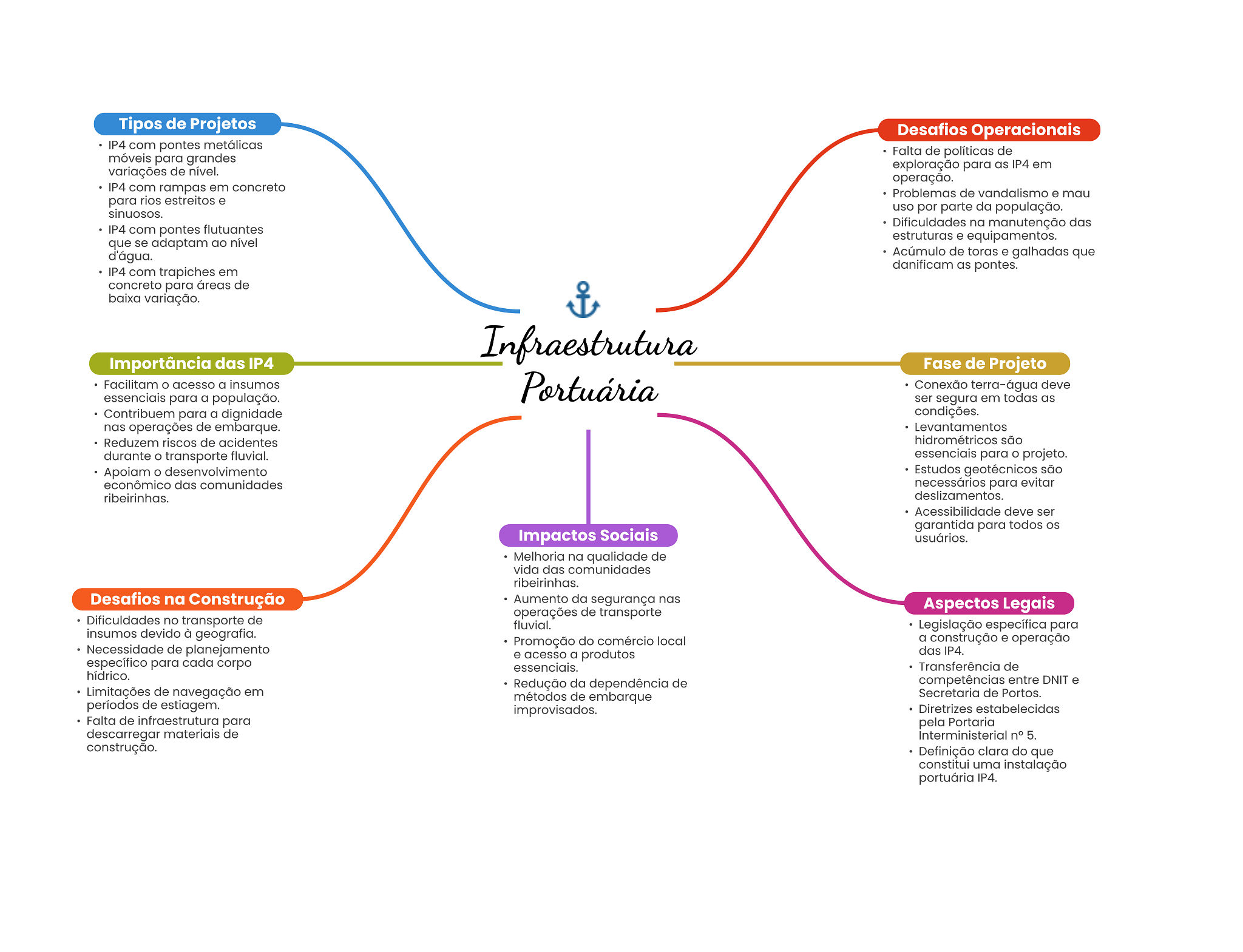 Tipos de Projetos Desafios Operacionais IP4 com pontes metálicas Falta de políticas de móveis para grandes exploração para as IP4 em variações de nível. operação. IP4 com rampas em concreto Problemas de vandalismo e mau para rios estreitos e sinuosos. uso por parte da população. Dificuldades na manutenção das IP4 com pontes flutuantes estruturas e equipamentos. que se adaptam ao nível d'água. Acúmulo de toras e galhadas que danificam as pontes. IP4 com trapiches em concreto para áreas de baixa variação. Infraestrutura Importância das IP4 Fase de Projeto Facilitam acesso a insumos Portuária Conexão terra-água deve essenciais para a população. ser segura em todas as Contribuem para a dignidade condições. nas operações de embarque. Levantamentos Reduzem riscos de acidentes hidrométricos são durante transporte fluvial. essenciais para O projeto. Apoiam desenvolvimento Estudos geotécnicos são econômico das comunidades necessários para evitar ribeirinhas. deslizamentos. Acessibilidade deve ser garantida para todos Impactos Sociais usuários. Melhoria na qualidade de vida das comunidades ribeirinhas. Desafios na Construção Aumento da segurança nas Aspectos Legais operações de transporte Dificuldades no transporte de fluvial. Legislação específica para insumos devido à geografia. Promoção do comércio local a construção e operação Necessidade de planejamento e acesso a produtos das IP4. específico para cada corpo essenciais. Transferência de hídrico. Redução da dependência de competências entre DNIT e Limitações de navegação em métodos de embarque Secretaria de Portos. períodos de estiagem. improvisados. Diretrizes estabelecidas Falta de infraestrutura para pela Portaria descarregar materiais de Interministerial n° 5. construção. Definição clara do que constitui uma instalação portuária IP4.