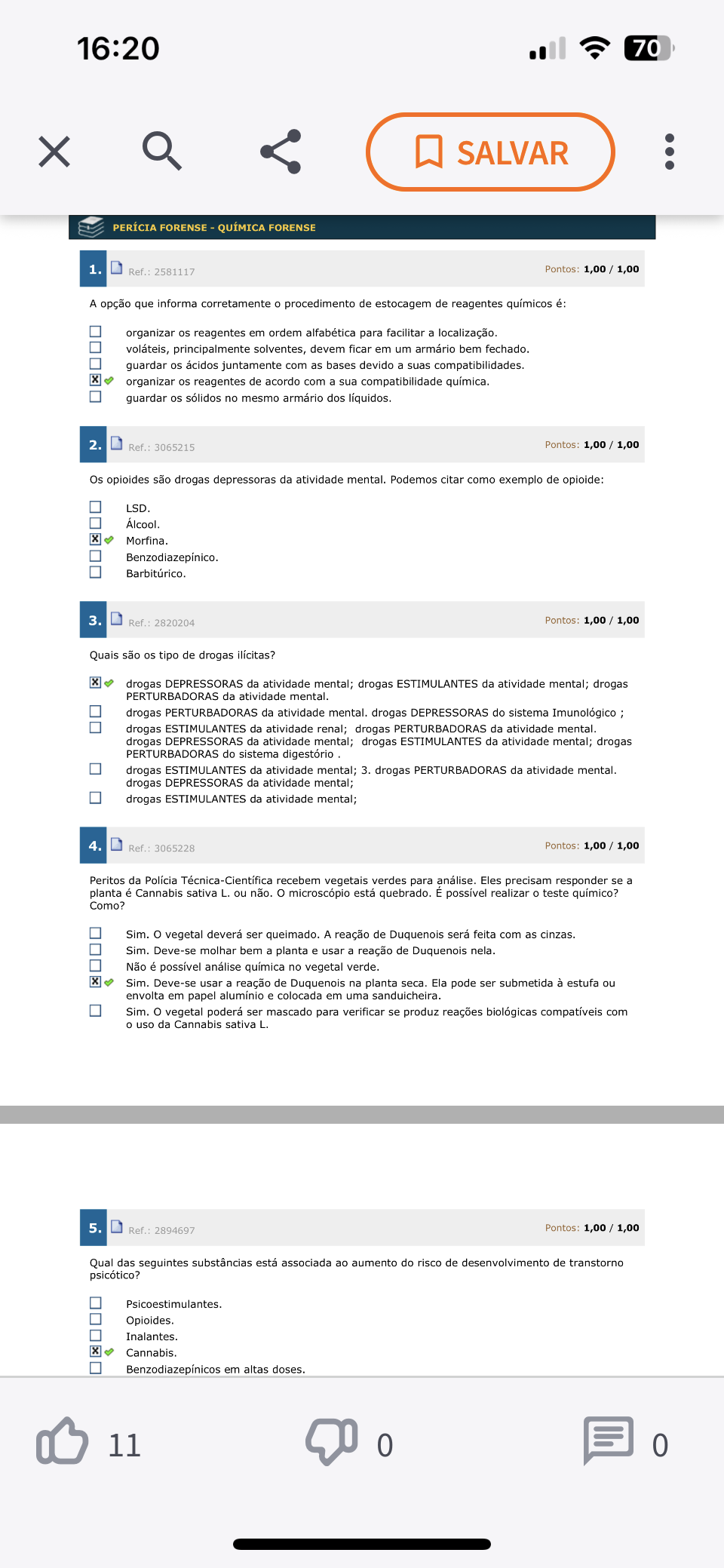 16:20 70 X SALVAR PERÍCIA FORENSE QUÍMICA FORENSE 1. Ref.: 2581117 Pontos: 1,00 1,00 A opção que informa corretamente procedimento de estocagem de reagentes químicos é: organizar reagentes em ordem alfabética para facilitar a localização. voláteis, principalmente solventes, devem ficar em um armário bem fechado. guardar os ácidos juntamente com as bases devido a suas compatibilidades. organizar reagentes de acordo com a sua compatibilidade química. guardar os sólidos no mesmo armário dos líquidos. 2. Ref.: 3065215 Pontos: 1,00 1,00 Os opioides são drogas depressoras da atividade mental. Podemos citar como exemplo de opioide: LSD. Álcool. Morfina. Barbitúrico. 3. Ref.: 2820204 Pontos: 1,00 1,00 Quais são tipo de drogas ilícitas? drogas DEPRESSORAS da atividade mental; drogas ESTIMULANTES da atividade mental; drogas PERTURBADORAS da atividade mental. drogas PERTURBADORAS da atividade mental. drogas DEPRESSORAS do sistema Imunológico drogas ESTIMULANTES da atividade renal; drogas PERTURBADORAS da atividade mental. drogas DEPRESSORAS da atividade mental; drogas ESTIMULANTES da atividade mental; drogas PERTURBADORAS do sistema digestório drogas ESTIMULANTES da atividade mental; 3. drogas PERTURBADORAS da atividade mental. drogas DEPRESSORAS da atividade mental; drogas ESTIMULANTES da atividade mental; 4. Ref.: 3065228 Pontos: Peritos da Polícia Técnica-Científica recebem vegetais verdes para análise. Eles precisam responder se a planta é Cannabis sativa L. ou não. microscópio está quebrado. É possível realizar O teste químico? Como? Sim. vegetal deverá ser queimado. A reação de Duquenois será feita com as cinzas. Sim. Deve-se molhar bem a planta e usar a reação de Duquenois nela. Não é possível análise química no vegetal verde. Sim. Deve-se usar a reação de Duquenois na planta seca. Ela pode ser submetida à estufa ou envolta em papel e colocada em uma sanduicheira. Sim. vegetal poderá ser mascado para verificar se produz reações biológicas compatíveis com uso da Cannabis sativa L. 5. Ref.: 2894697 Pontos: 1,00 1,00 Qual das seguintes substâncias está associada ao aumento do risco de desenvolvimento de transtorno psicótico? Psicoestimulantes. Opioides. Inalantes. Cannabis. em altas doses. 11 0 0