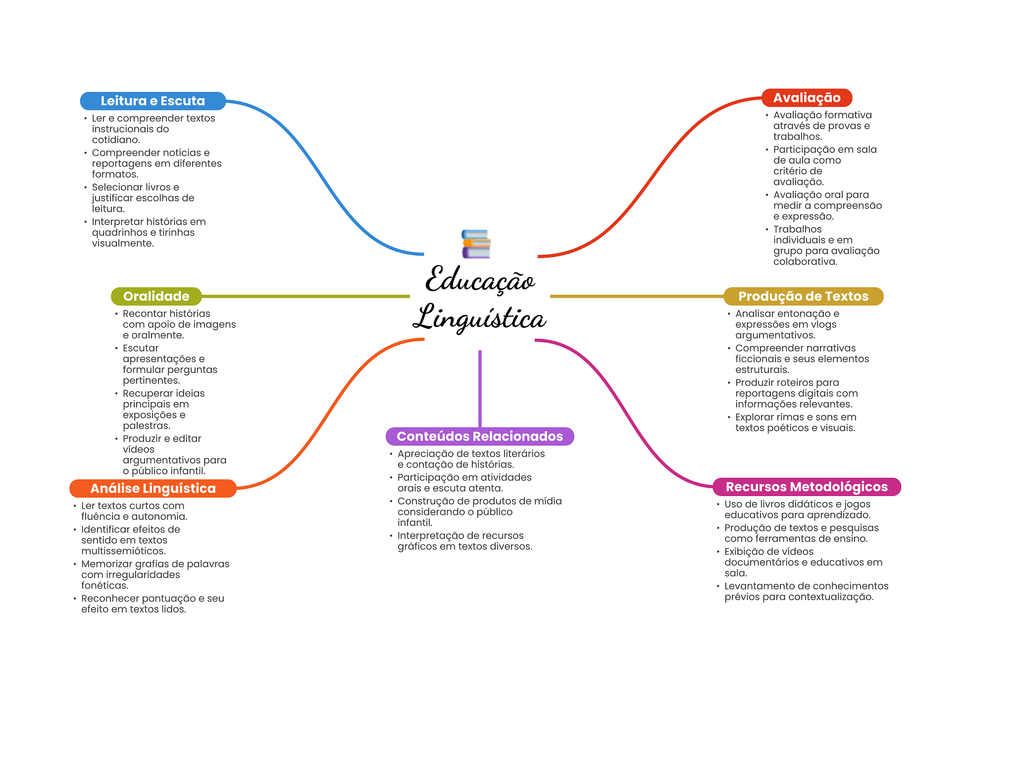 Leitura e Escuta Avaliação Ler e compreender textos Avaliação formativa instrucionais do através de provas e cotidiano. trabalhos. Compreender notícias e Participação em sala reportagens em diferentes de aula como formatos. critério de Selecionar livros e avaliação. justificar escolhas de Avaliação oral para leitura. medir a compreensão Interpretar histórias em e expressão. quadrinhos e tirinhas Trabalhos visualmente. individuais e em grupo para avaliação colaborativa. Educação Oralidade Produção de Textos Recontar histórias com apoio de imagens Linguística Analisar entonação e expressões em vlogs e oralmente. argumentativos. Escutar Compreender narrativas apresentações e ficcionais e seus elementos formular perguntas estruturais. pertinentes. Produzir roteiros para Recuperar ideias reportagens digitais com principais em informações relevantes. exposições e Explorar rimas e sons em palestras. textos poéticos e visuais. Produzir e editar Conteúdos Relacionados vídeos Apreciação de textos literários argumentativos para e contação de histórias. público infantil. Participação em atividades Análise Linguística orais e escuta atenta. Recursos Metodológicos Ler textos curtos com Construção de produtos de mídia Uso de livros didáticos e jogos fluência e autonomia. considerando público educativos para aprendizado. infantil. Identificar efeitos de Produção de textos e pesquisas sentido em textos Interpretação de recursos como ferramentas de ensino. gráficos em textos diversos. Exibição de vídeos Memorizar grafias de palavras documentários e educativos em com irregularidades sala. fonéticas. Levantamento de conhecimentos Reconhecer pontuação e seu prévios para contextualização. efeito em textos lidos.