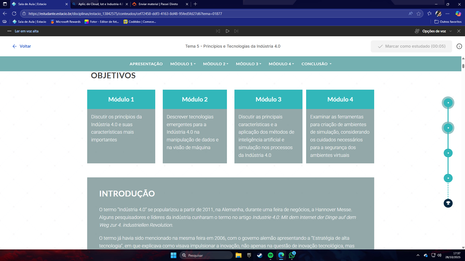 Sala de Aula Estacio Aplic. de Cloud, lot e Industria 4.0 X Enviar material Passei Direto + X A" Sala de Aula Estacio Microsoft Rewards Fotor Editor de fot... Codédex Comece... Outros favoritos Ler em alta DI Opções de voz X Voltar Tema 5 Princípios e Tecnologias da Indústria 4.0 Marcar como estudado (00:05) i APRESENTAÇÃO MÓDULO 1 MÓDULO 2 MÓDULO 3 MÓDULO 4 CONCLUSÃO OBJETIVOS Módulo 1 Módulo 2 Módulo 3 Módulo 4 Discutir os princípios da Descrever tecnologias Discutir as principais Examinar as ferramentas Indústria 4.0 e suas emergentes para a características e a para criação de ambientes características mais Indústria 4.0 na aplicação dos métodos de de simulação, considerando importantes manipulação de dados e inteligência artificial e cuidados necessários na visão de máquina simulação nos processos para a segurança dos da Indústria 4.0 ambientes virtuais INTRODUÇÃO termo "Indústria 4.0" se popularizou a partir de 2011, na Alemanha, durante uma feira de negócios, a Hannover Messe. Alguns pesquisadores e líderes da indústria cunharam termo no artigo Industrie 4.0: Mit dem Internet der Dinge auf dem Weg zur 4. industriellen Revolution. 0 termo já havia sido mencionado na mesma feira em 2006, com governo alemão apresentando a "Estratégia de alta tecnologia", em que explicava como visava impulsionar a inovação, não apenas na questão de inovação tecnológica, mas Pesquisar EPIC 17:37 28/10/2025