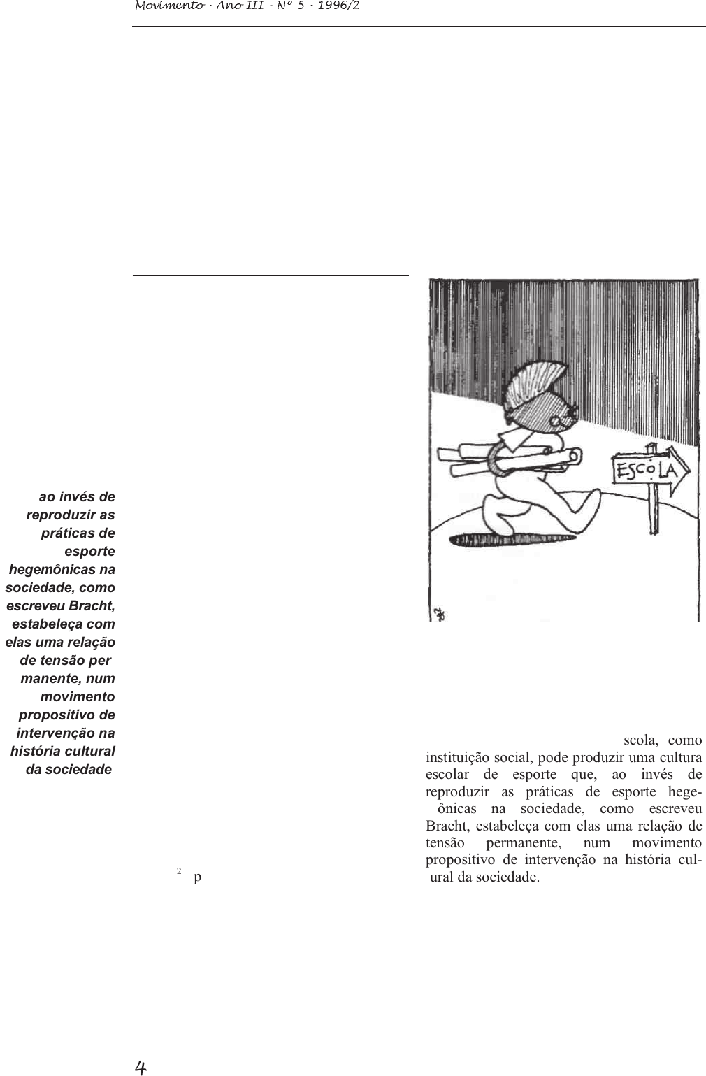 O "esporte na escola" e o "esporte da escola": da negação radical para uma relação de tensão permanente Um diálogo com Valter Bracht Tarcísio Mauro Vago* A idéia central que apresento para este diálo- go é a de que a escola, como instituição social, pode produzir uma cultura escolar de esporte que, ao invés de reproduzir as práticas de esporte hegemônicas na sociedade, como escreveu Bracht, estabeleça com elas uma relação de tensão per- manente, num movimento propositivo de intervenção na história cultural da sociedade. Este artigo discute as relações da es- cola com as práticas culturais de es- porte, estabelecendo um diálogo com o livro de Valter Bracht (1992) e trazendo para essa discussão as contribuições de alguns estudiosos da história das disciplinas escolares (Nóvoa, Forquin e Chervel). A idéia central defendida é a de que a escola pode produzir uma cultura escolar de esporte que, ao invés de reproduzir as práticas de esporte hegemônicas na sociedade, como escreveu Bracht, estabeleça com elas uma relação de tensão permanente, intervindo na história cultural da sociedade. As práticas culturais de esporte vêm sendo escolarizadas ao longo deste século, como um dos temas de ensino da Educação Física. Então, quais as relações possíveis da escola (e do seu ensino de Educação Física) com as práticas culturais de esporte? Tentando refletir acerca das possíveis respostas a essa pergunta, tomei como referência o livro de Valter Bracht (1992)', Educação Física e aprendizagem social, o que se justifica por ser esse autor um dos mais lidos pelos professores de Educação Física, no Brasil (Oliveira, 1994). A intenção é a de estabelecer com esse estudioso um diálogo2 para discutir um dos muitos pontos trazidos à reflexão pelo autor, justamente aquele que trata do ensino do esporte na escola, por intermédio da Educação Física. A idéia central que apresento para este diálogo é a de que a escola, como instituição social, pode produzir uma cultura escolar de esporte que, ao invés de reproduzir as práticas de esporte hege- mônicas na sociedade, como escreveu Bracht, estabeleça com elas uma relação de tensão permanente, num movimento propositivo de intervenção na história cul- tural da sociedade. EM TORNO DA AUTONOMIA E DA LEGI- TIMIDADE PEDAGÓGICA DA ESCOLA E DO ENSINO DA EDUCAÇÃO FÍSICA Um olhar para a escola como lugar de ''transmissão do saber acumulado" Depois de conceituar, no Capítulo 1, o ter- mo Educação Física como aquele que abrange as atividades pedagógicas, tendo como tema o movimento corporal e que toma lugar na insti- tuição educacional (p.15), Bracht considera que a Educação Física, em se realizando na insti- tuição educacional, presume-se, assume o es- tatuto de atividade pedagógica e, como tal, incorpora-se aos códigos e funções da própria escola, (p.17) Há duas idéias impor tantes contidas nessa consideração. A primeira é a de que Bracht, aqui, defende que a escola tem seus próprios "códigos e funções", admitindo então que ela possua uma certa autonomia como instituição social. A segunda idéia decorre imediatamente desta: a Educação Física (e os temas que ela vai ensinar, entre os quais o esporte), sendo constituinte da escola, assu- me e incorpora em seu ensino esses "códigos e funções" da escola. Bracht prossegue demonstrando o fato de a Educação Física ter recebido, em sua his- tória no Brasil, a influência de duas institui- ções: a instituição militar e a instituição es- porte. O que o autor discute, então, é o grau de autonomia pedagógica (ou a "identidade da Educação Física", segundo ele) alcançada pela Educação Física nas suas relações com essas instituições. Para definir o que seja essa autonomia, Bracht cita o sociólogo alemão Niklas Luhmann: A autonomia pressupõe uma determinada in- terdependência, e expressa o grau de liberdade com o qual as relações entre o sistema e o meio ambiente podem, através dos critérios seletivos do sistema, ser por ele próprio reguladas (Luhmann, citado por Bracht, 1992. p.18). Com base na definição de auto- nomia de que ele se utiliza, percebe-se que Bracht, ainda aqui, reforça aquela primeira idéia de que a escola, sendo um "sistema", teria sim um "grau de liberdade" para estabelecer relações com o meio ambiente por meio de seus "critérios seletivos" regulados por ela própria. Logo, se o esporte está no meio ambiente, a escola poderá relacionar-se com ele por meio dos seus próprios critérios e, ainda, regular essa relação. Movimento - Ano III - Nº 5 - 1996/2 Movimento - Ano III - Nº 5 - 1996/2 4 5 O "esporte na escola" e o "esporte da escola": da negação radical para uma relação de tensão permanente Um diálogo com Valter Bracht Tarcísio Mauro Vago* A idéia central que apresento para este diálo- go é a de que a escola, como instituição social, pode produzir uma cultura escolar de esporte que, ao invés de reproduzir as práticas de esporte hegemônicas na sociedade, como escreveu Bracht, estabeleça com elas uma relação de tensão per- manente, num movimento propositivo de intervenção na história cultural da sociedade. Este artigo discute as relações da es- cola com as práticas culturais de es- porte, estabelecendo um diálogo com o livro de Valter Bracht (1992) e trazendo para essa discussão as contribuições de alguns estudiosos da história das disciplinas escolares (Nóvoa, Forquin e Chervel). A idéia central defendida é a de que a escola pode produzir uma cultura escolar de esporte que, ao invés de reproduzir as práticas de esporte hegemônicas na sociedade, como escreveu Bracht, estabeleça com elas uma relação de tensão permanente, intervindo na história cultural da sociedade. As práticas culturais de esporte vêm sendo escolarizadas ao longo deste século, como um dos temas de ensino da Educação Física. Então, quais as relaç